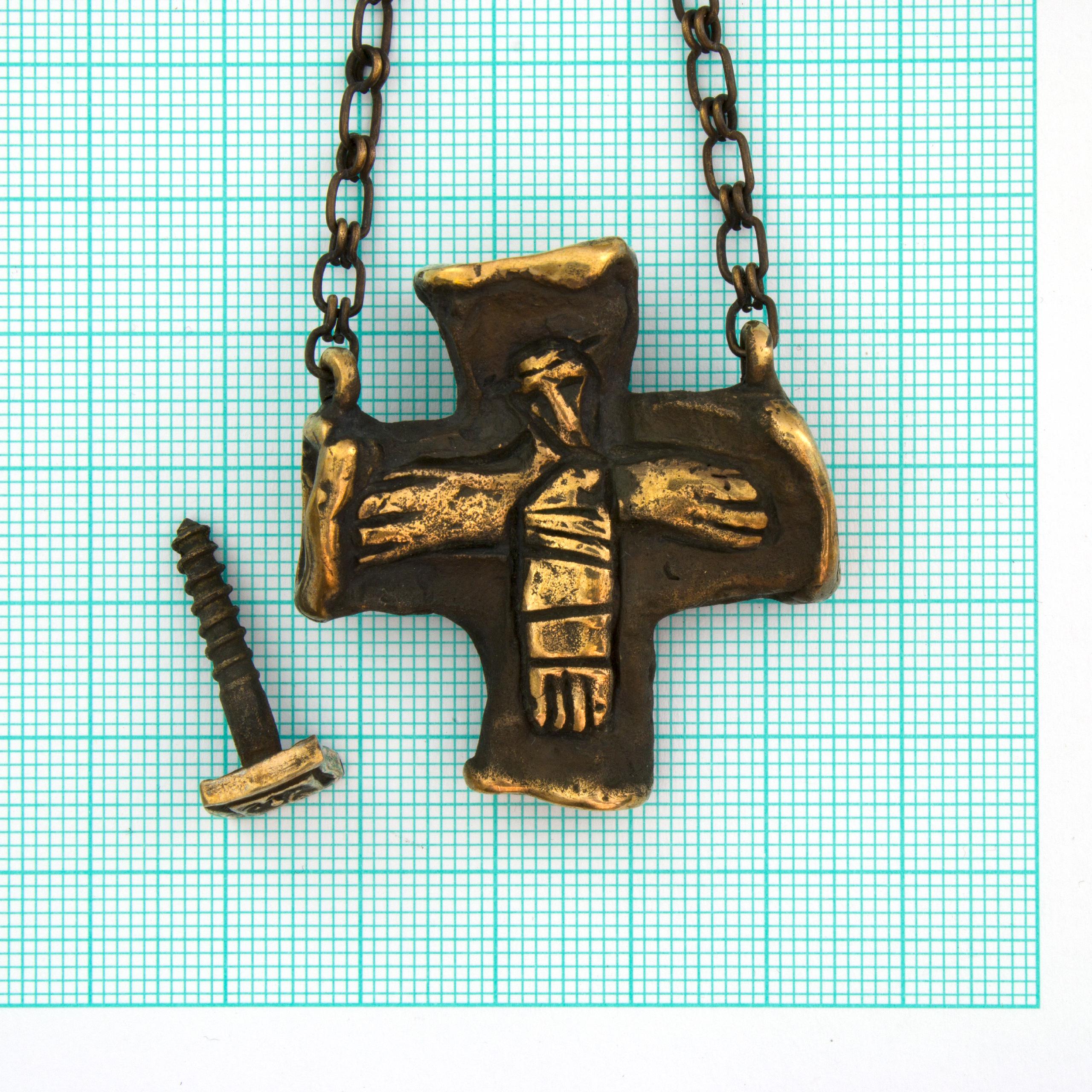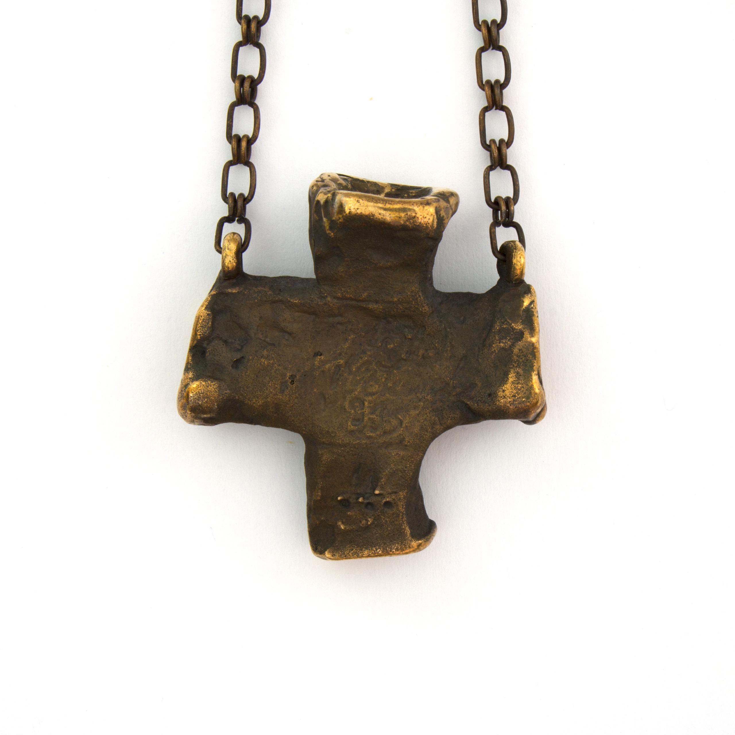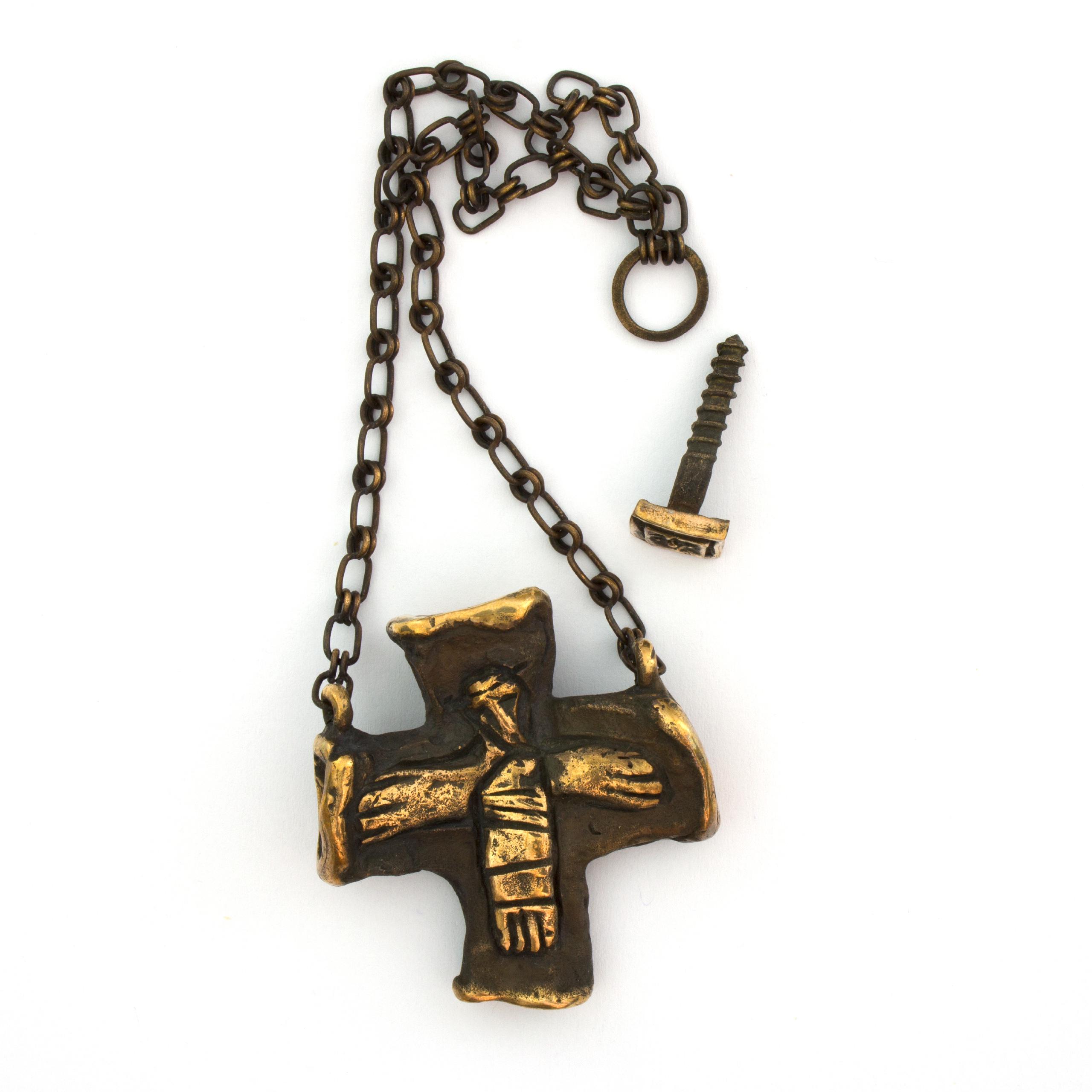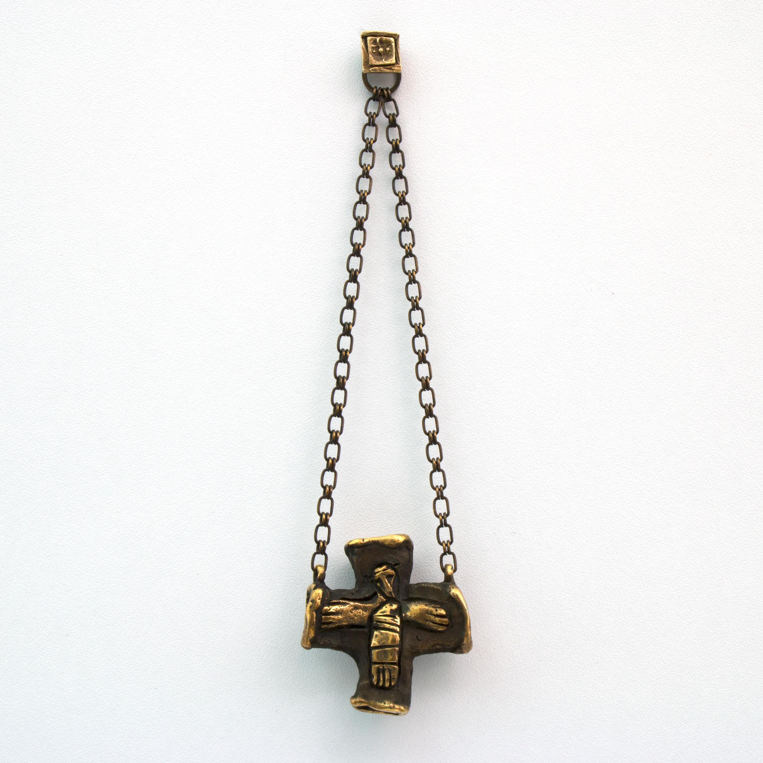 Bronze Cross by Vojtěška Vlčková Catalogue number: 098 Original title: Kříž na řetízku na zeď Author: Vojtěška Vlčková Production: Jaromíra Pavlíková Material: bronze Technology: lost wax casting