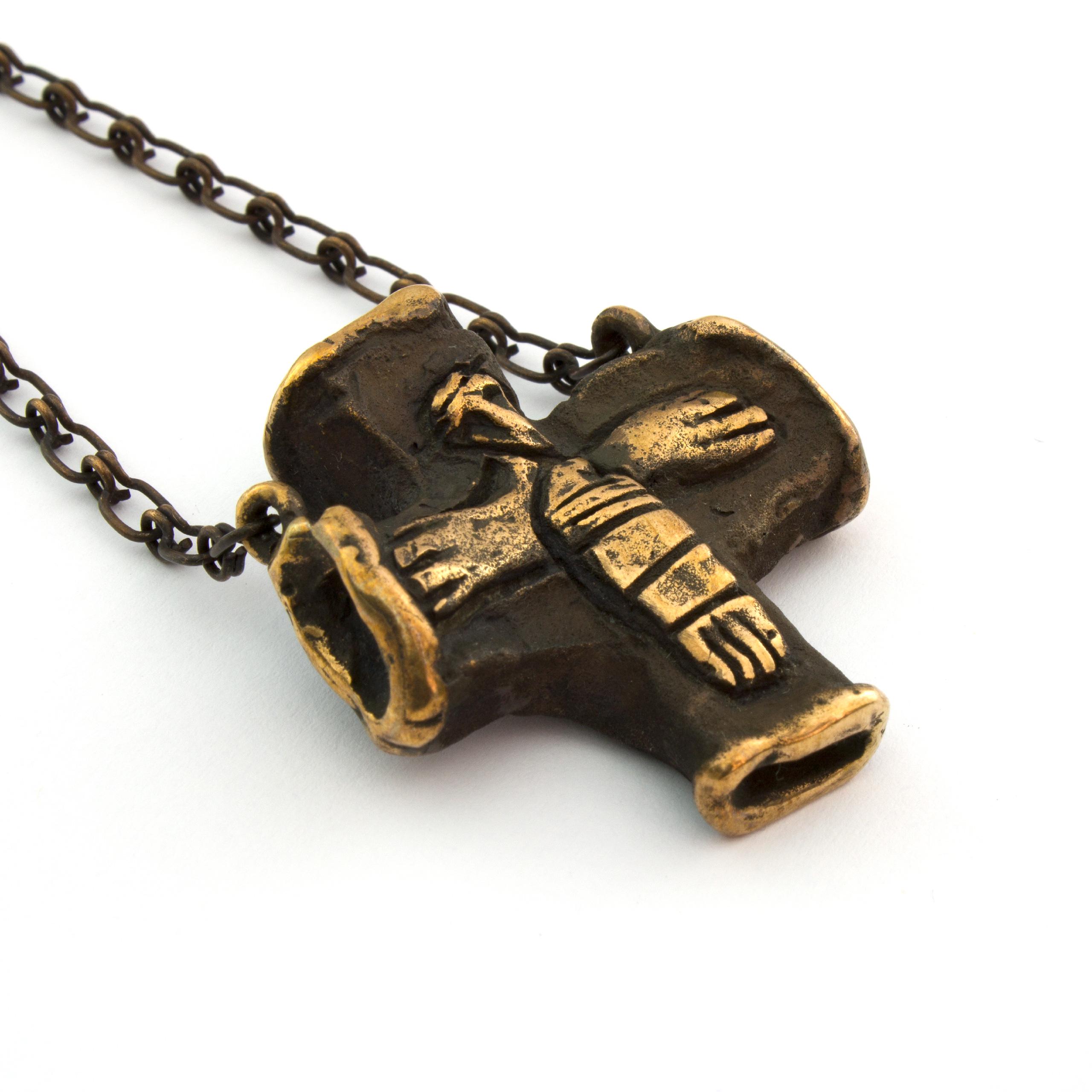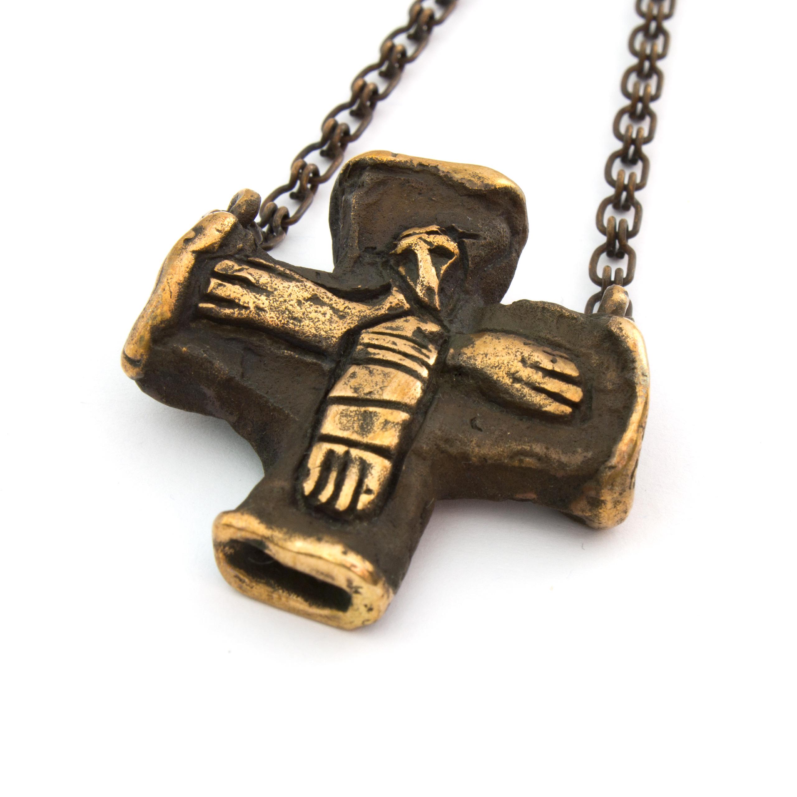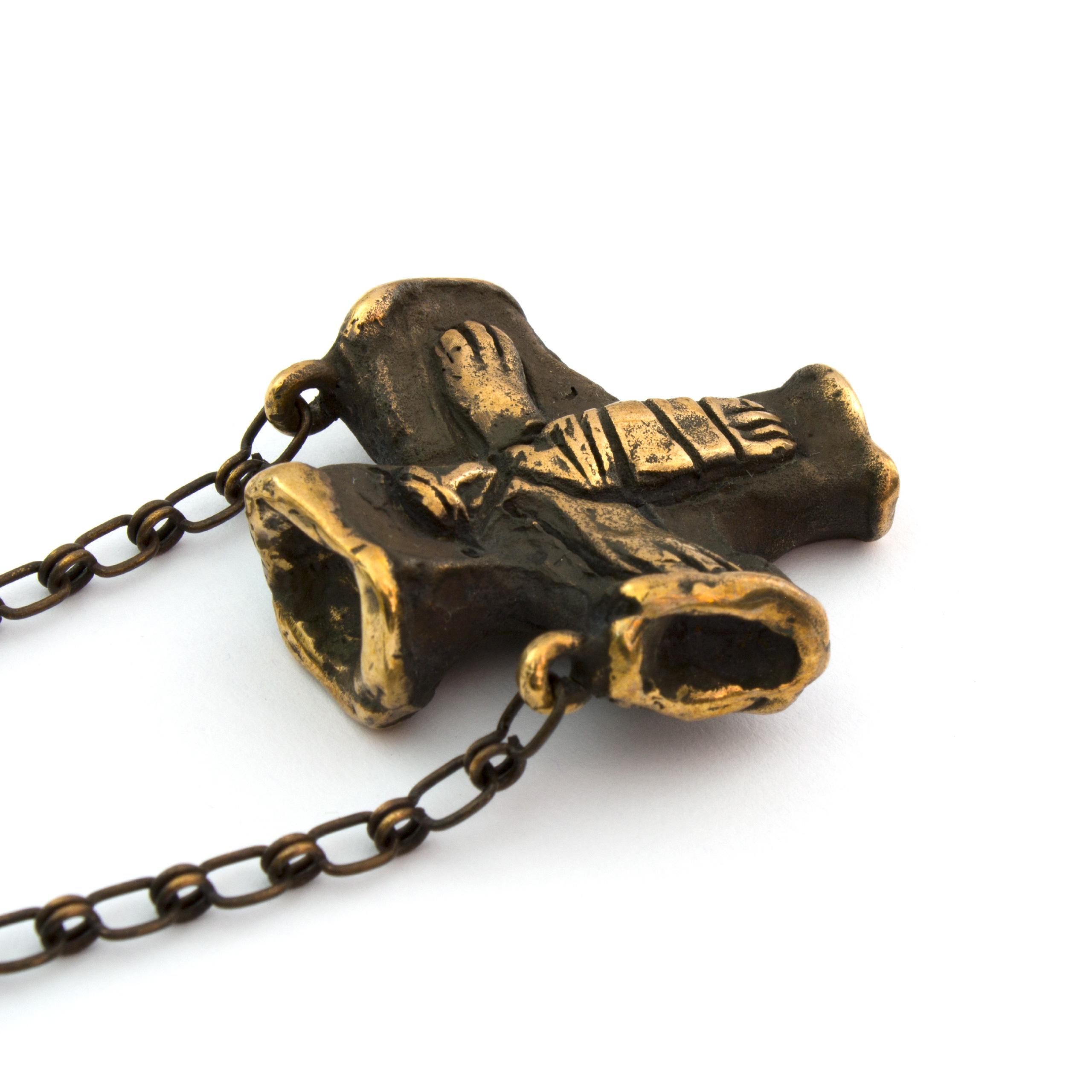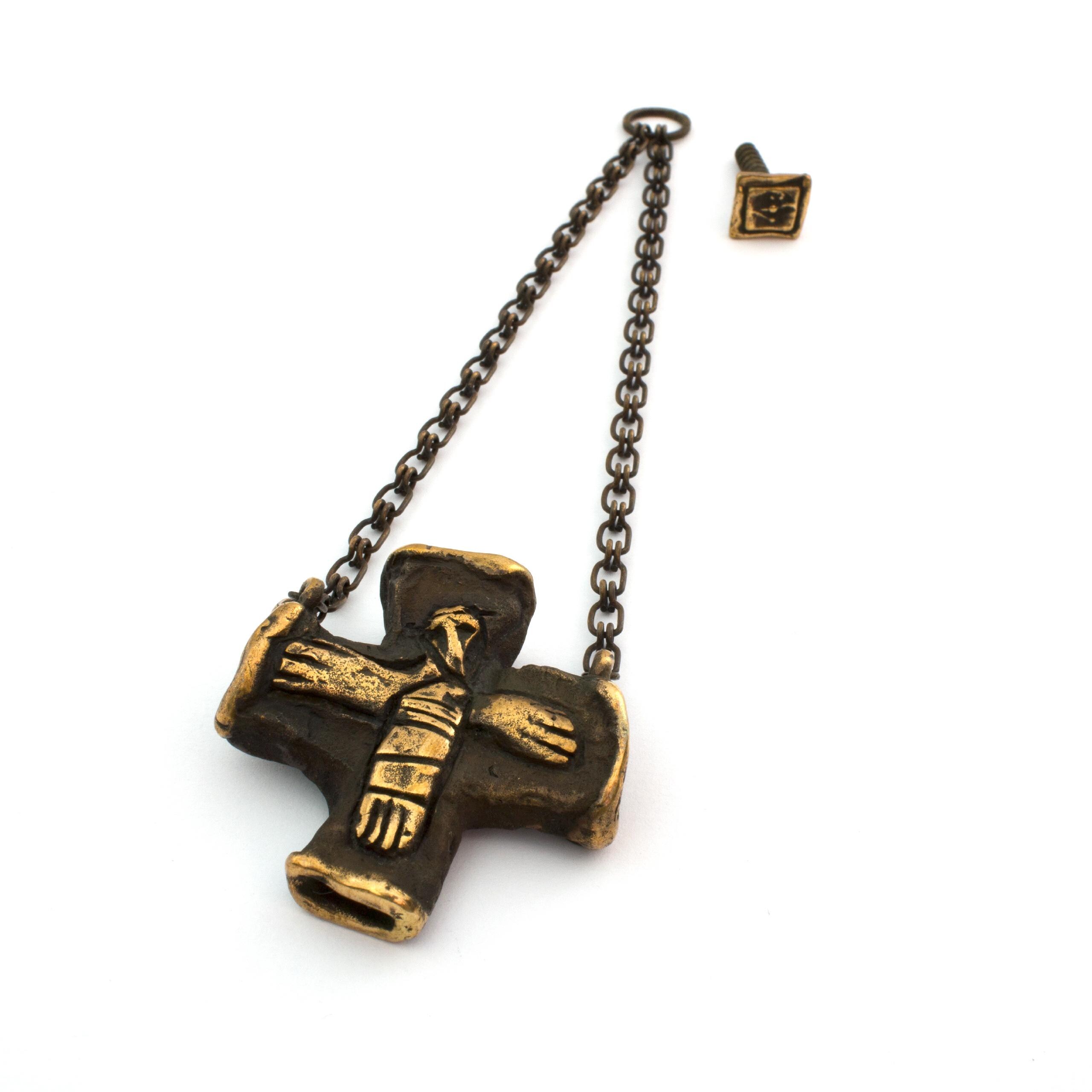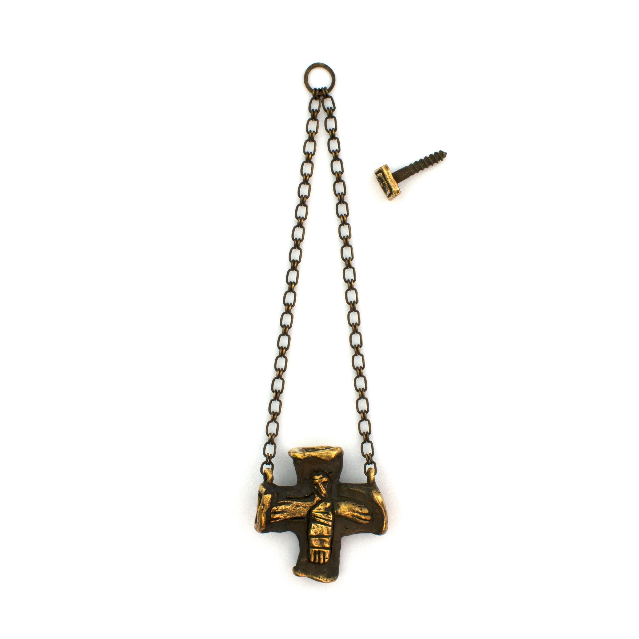 Bronze Cross by Vojtěška Vlčková Catalogue number: 098 Original title: Kříž na řetízku na zeď Author: Vojtěška Vlčková Production: Jaromíra Pavlíková Material: bronze Technology: lost wax casting