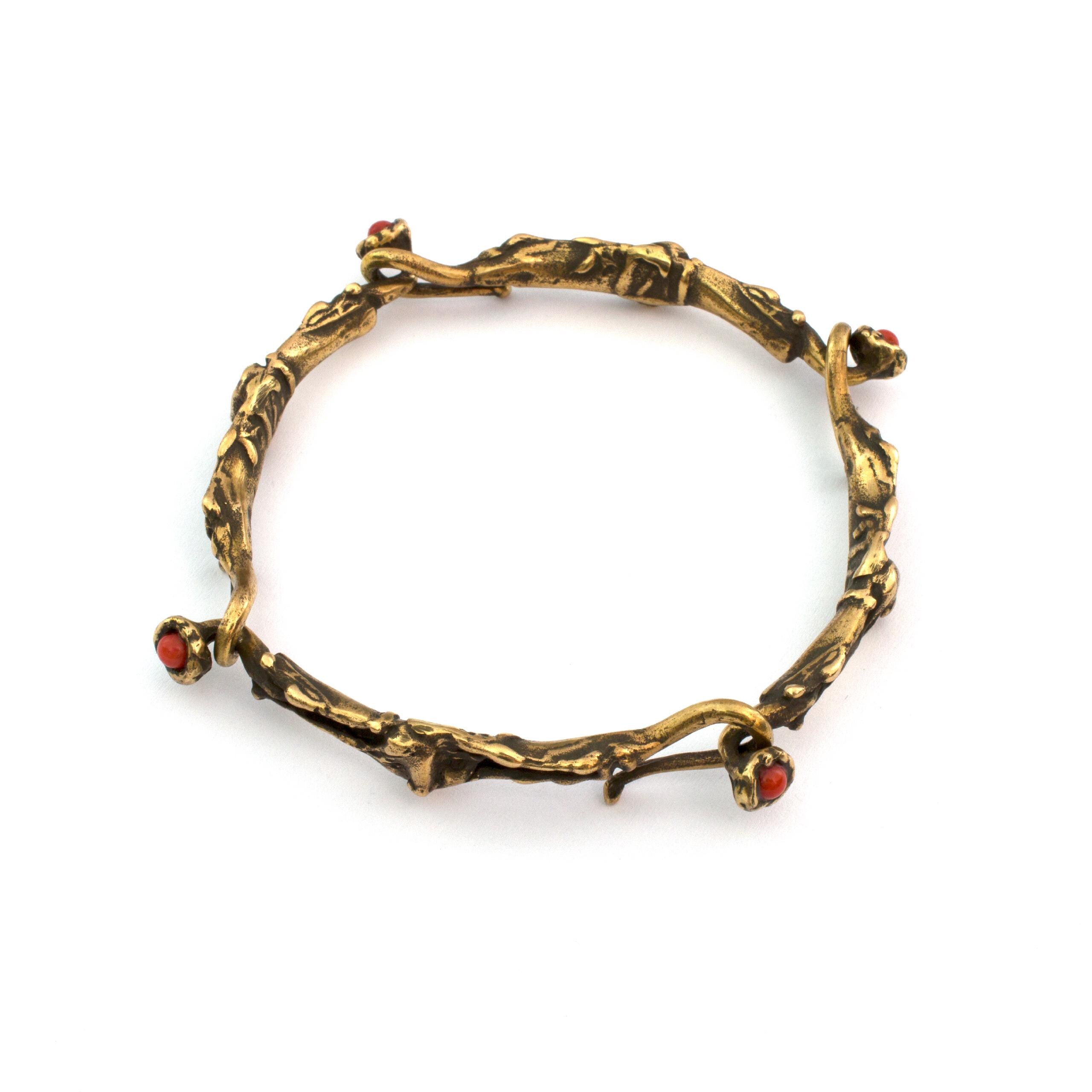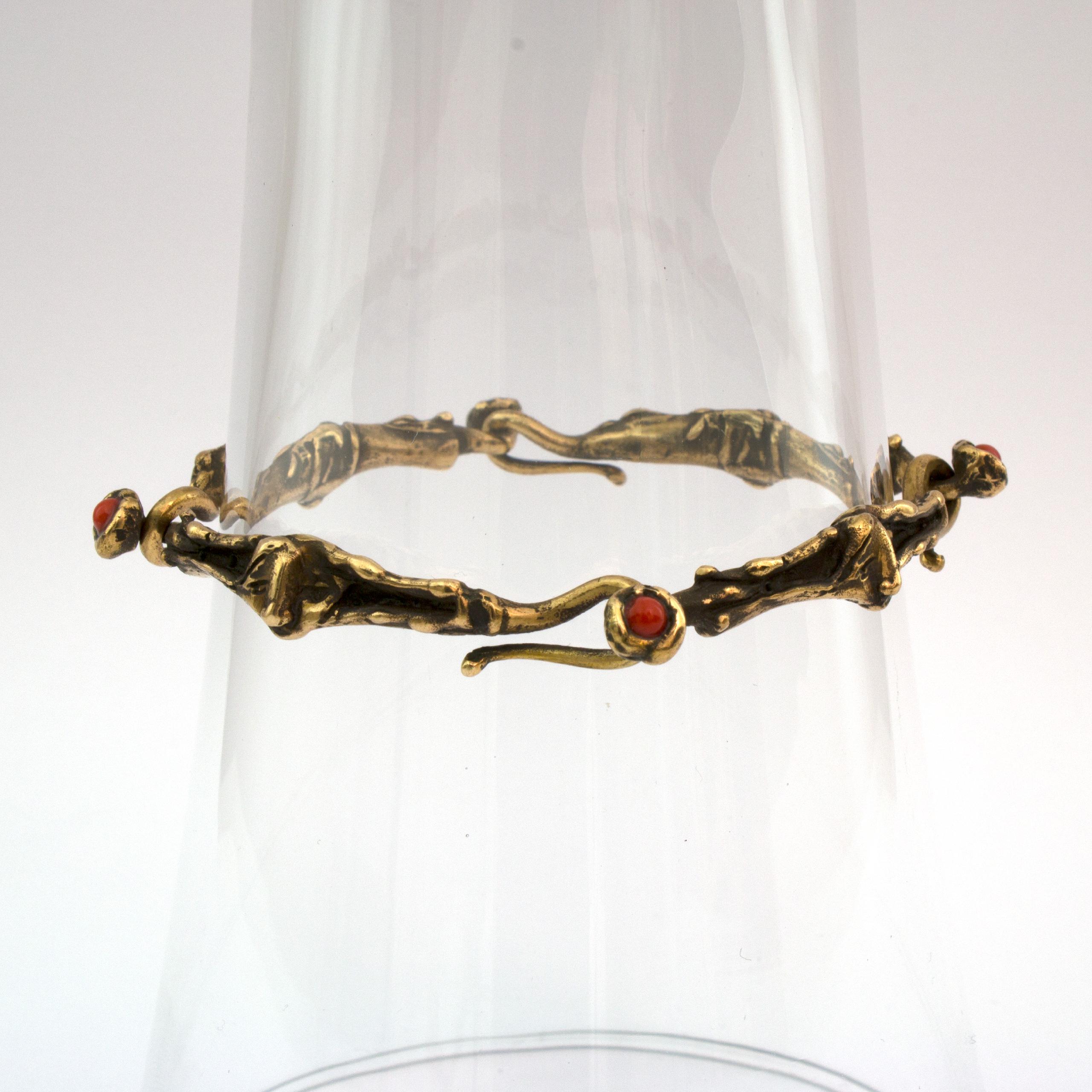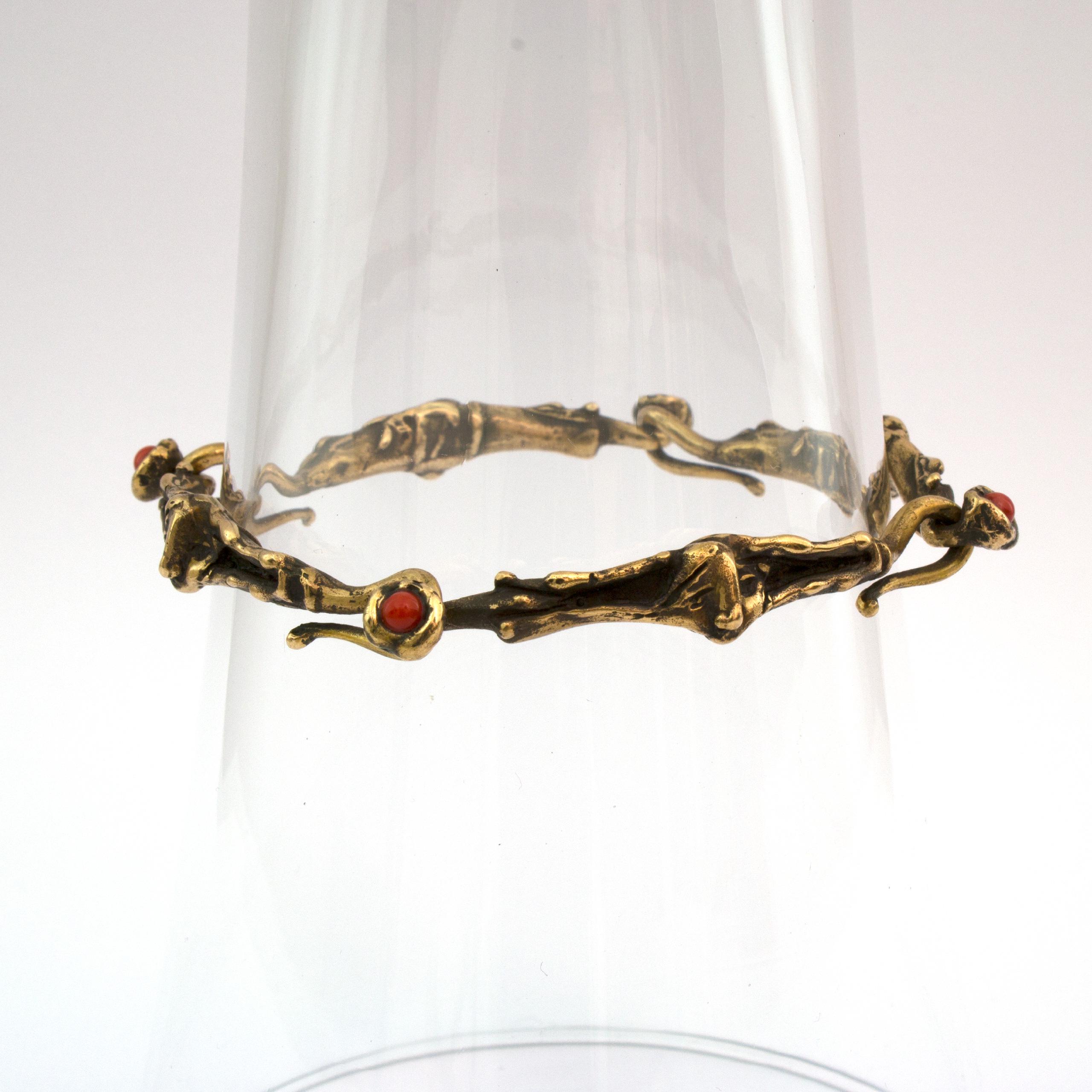 Bronze Bracelet with Coral by Vojtěška Vlčková Catalogue number: 121 Original title: Čtyřčlánkový Author: Vojtěška Vlčková Production: Jaromíra Pavlíková Material: bronze Technology: lost wax casting
