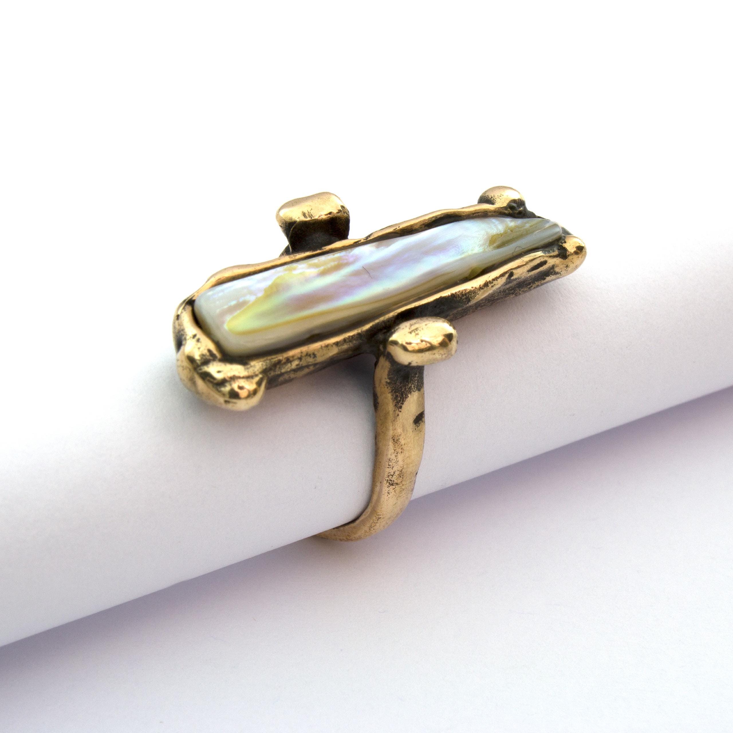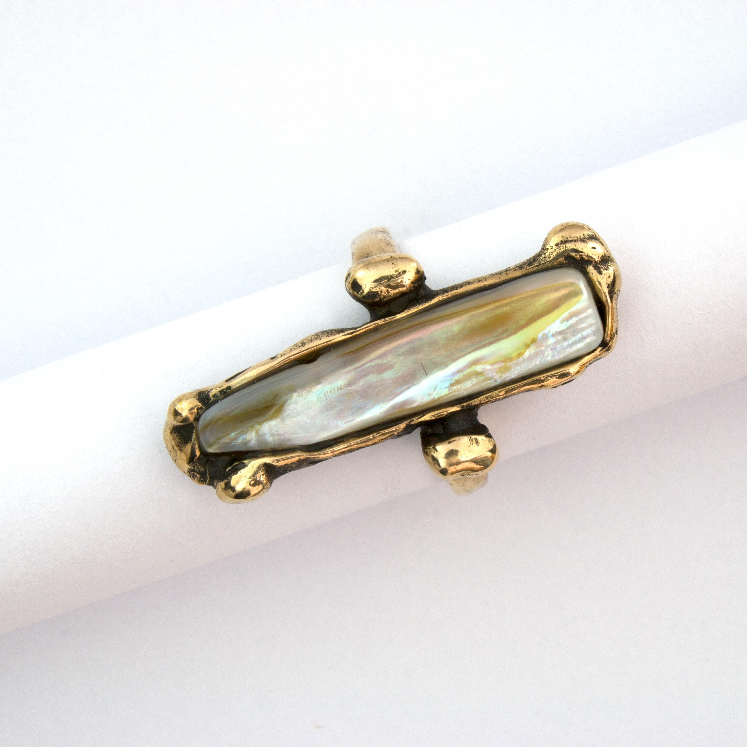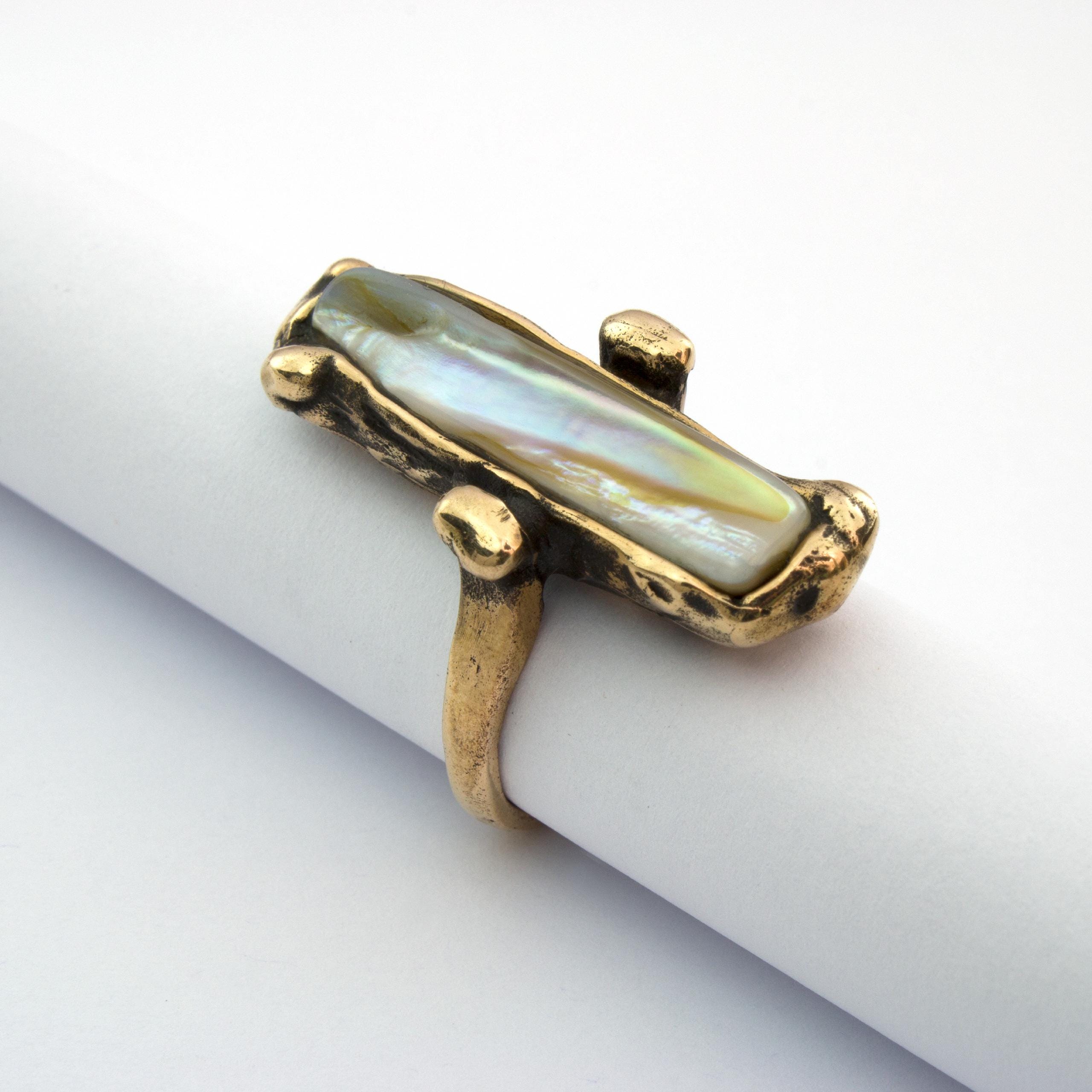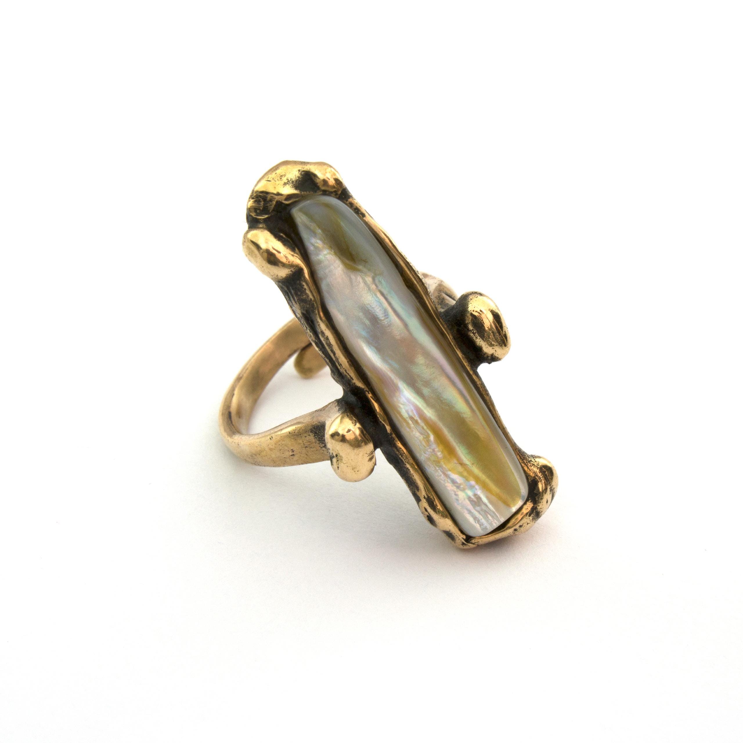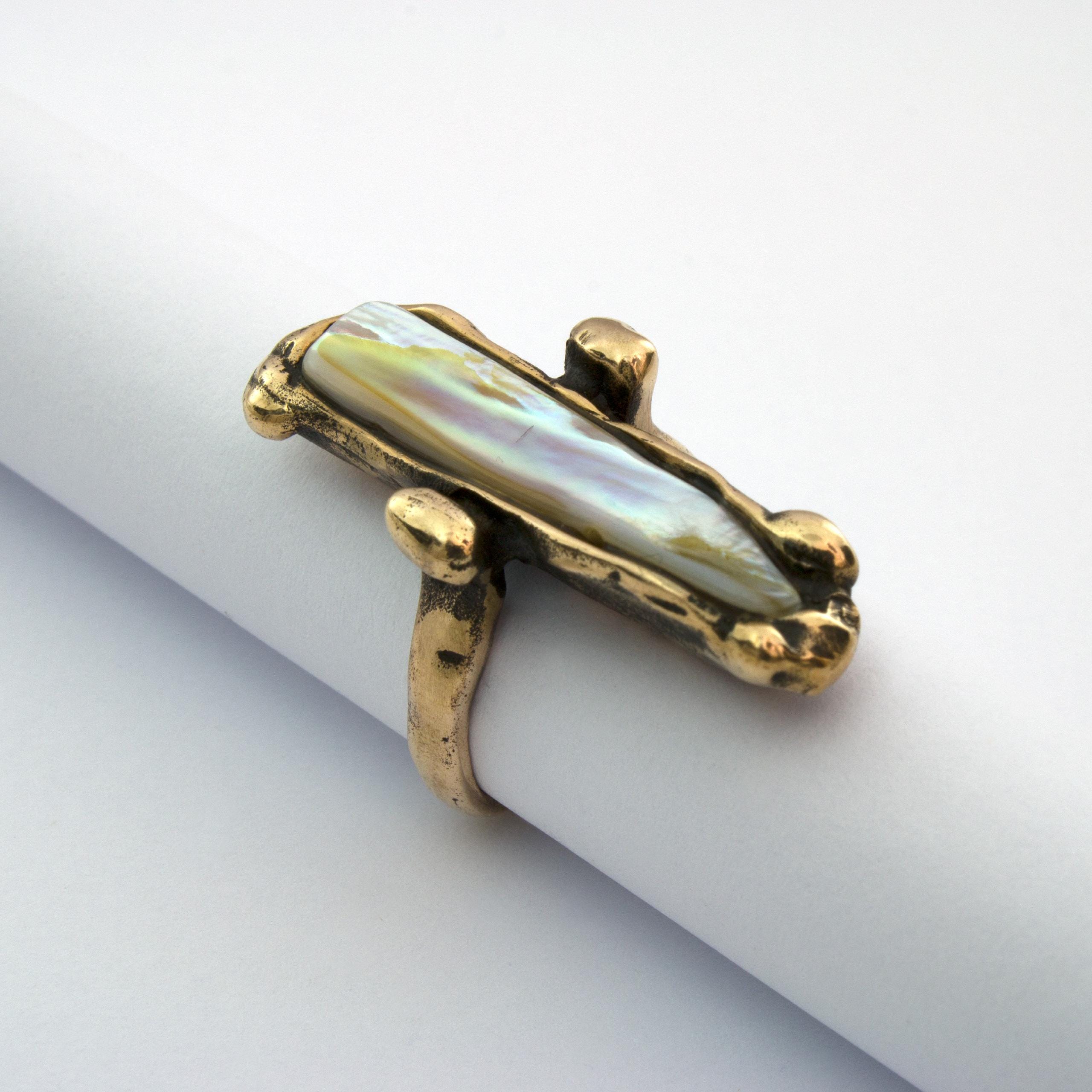 Bronze Ring with Mother of Pearl by Vojtěška Vlčková Catalogue number: 193 Original title: Perleťový Author: Vojtěška Vlčková Production: Jaromíra Pavlíková Material: bronze Technology: lost wax casting