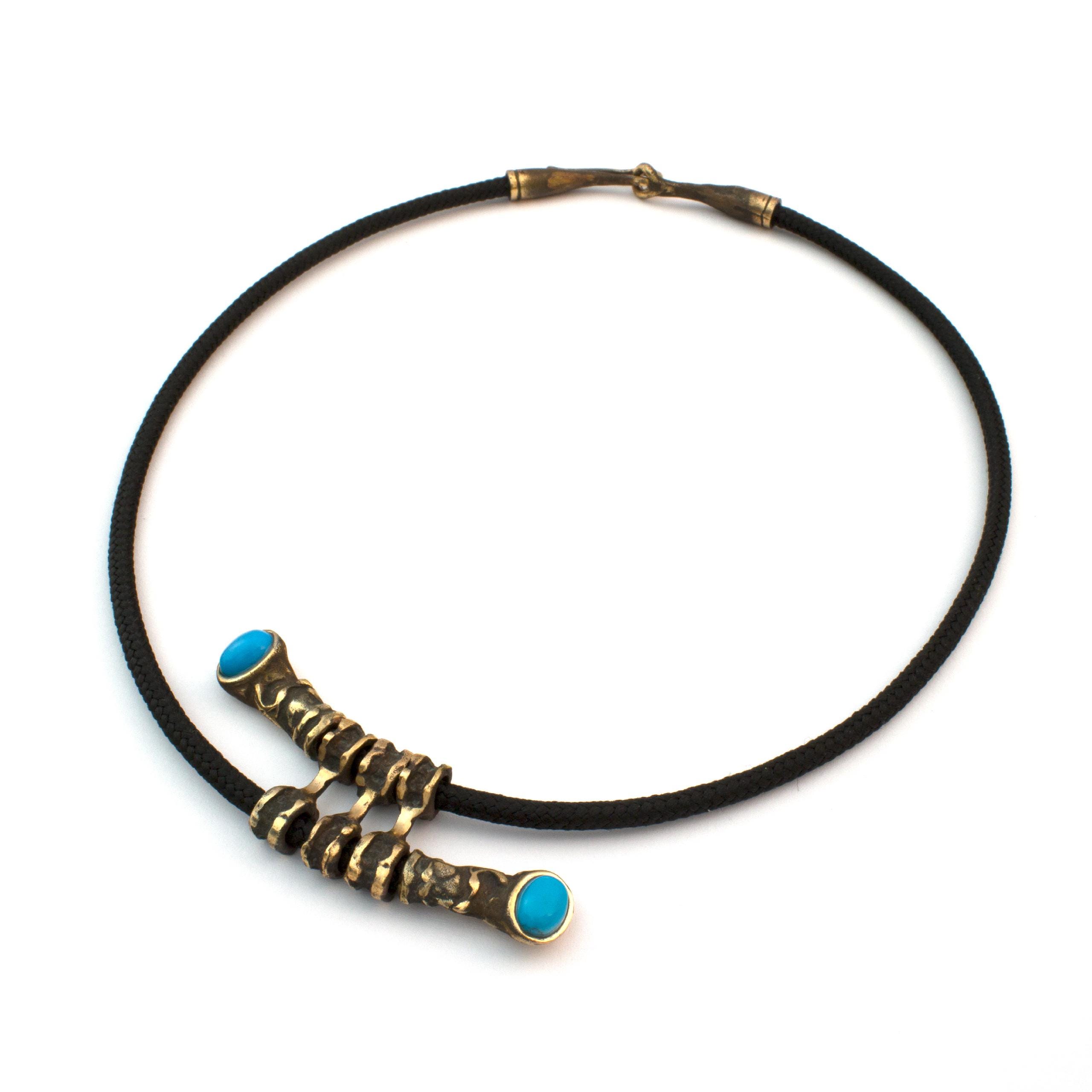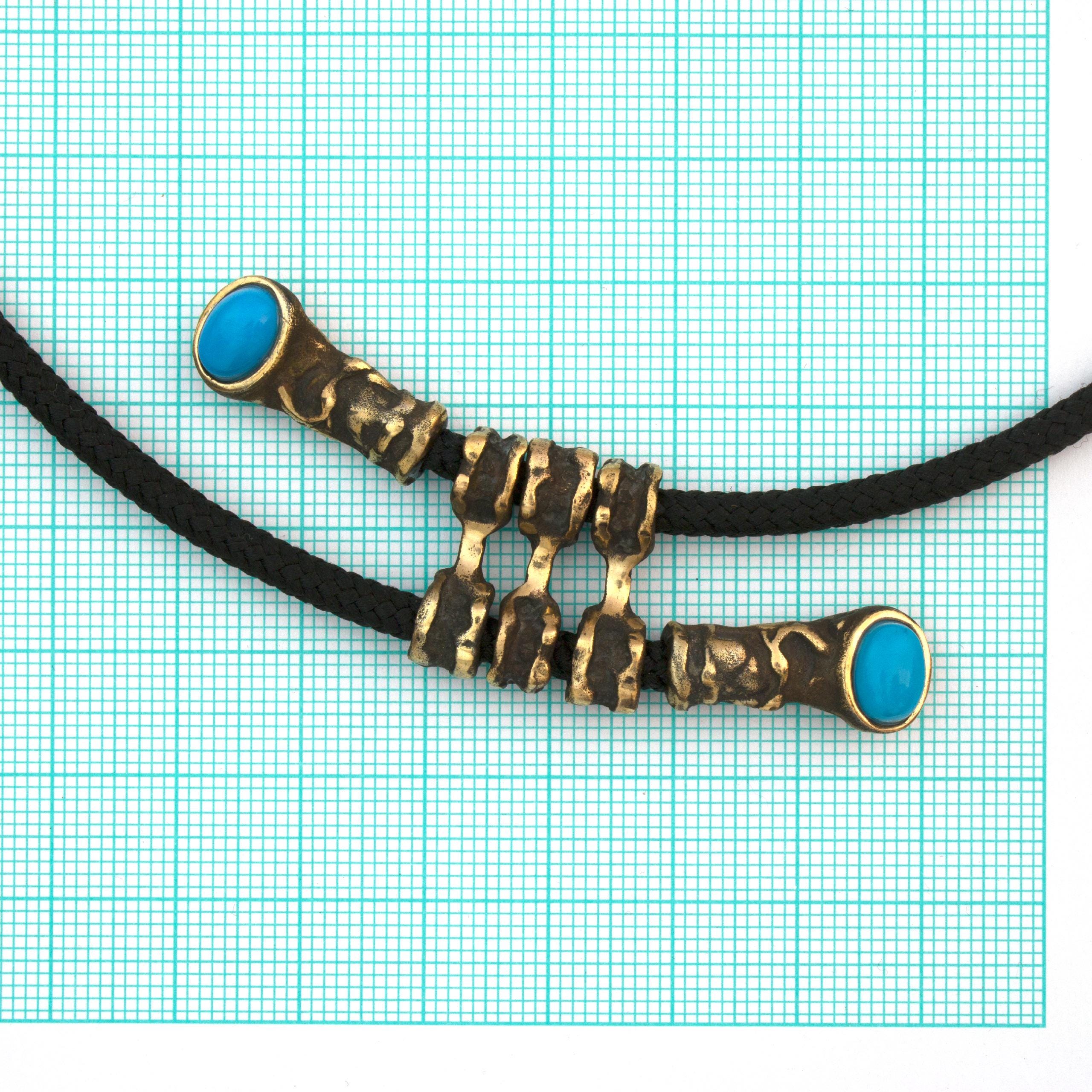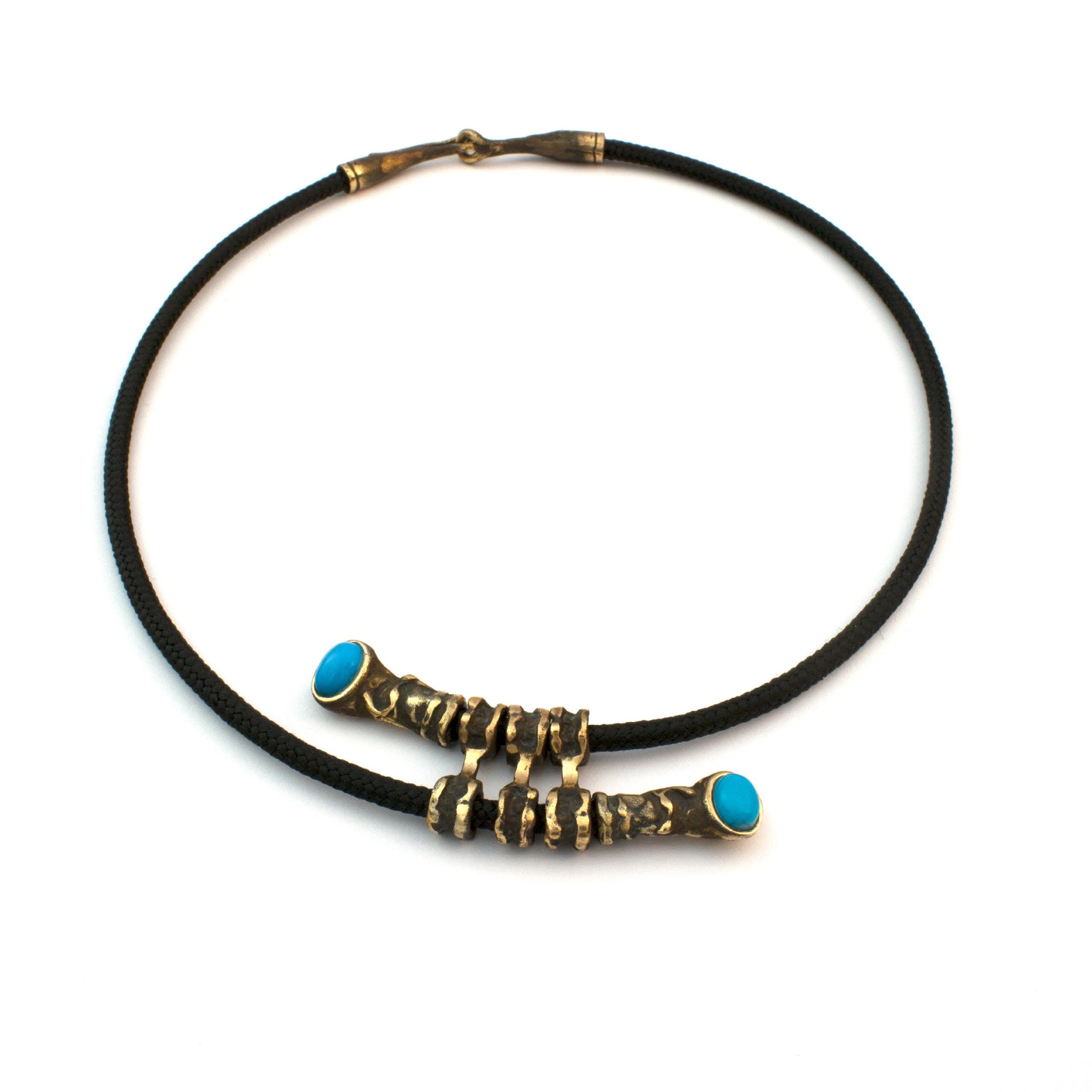 The "Grid-style" necklace by Vojtěška Vlčková (1948-2023) represents a perfect fusion of geometric precision and the organic beauty of turquenite. This authorial jewel, created using the lost wax casting method, combines the textured surface of patinated bronze with the blue-green shimmer of the semi-precious stone. The result is an exceptional piece that balances between sculptural solidity and jewelry delicacy.