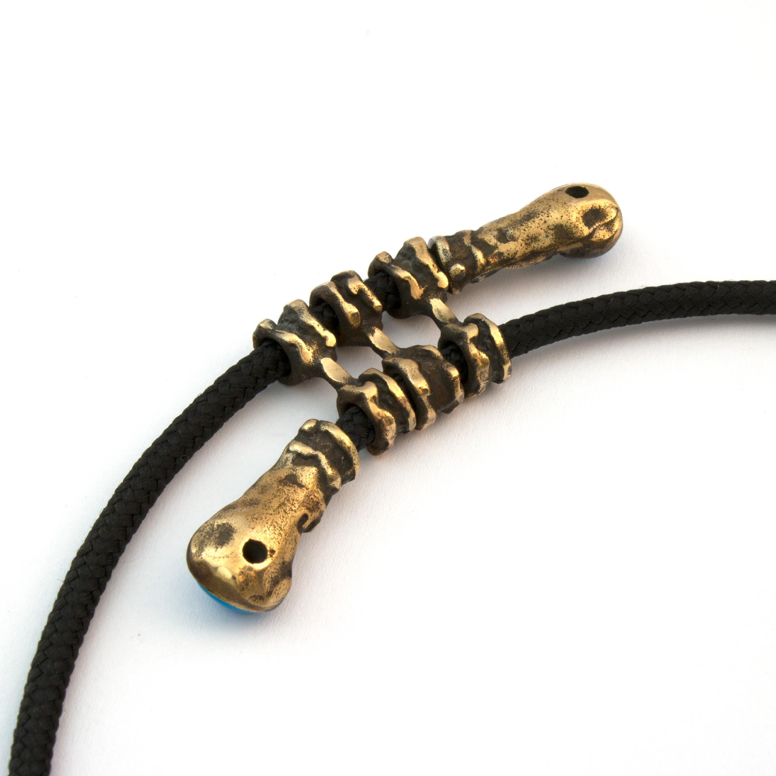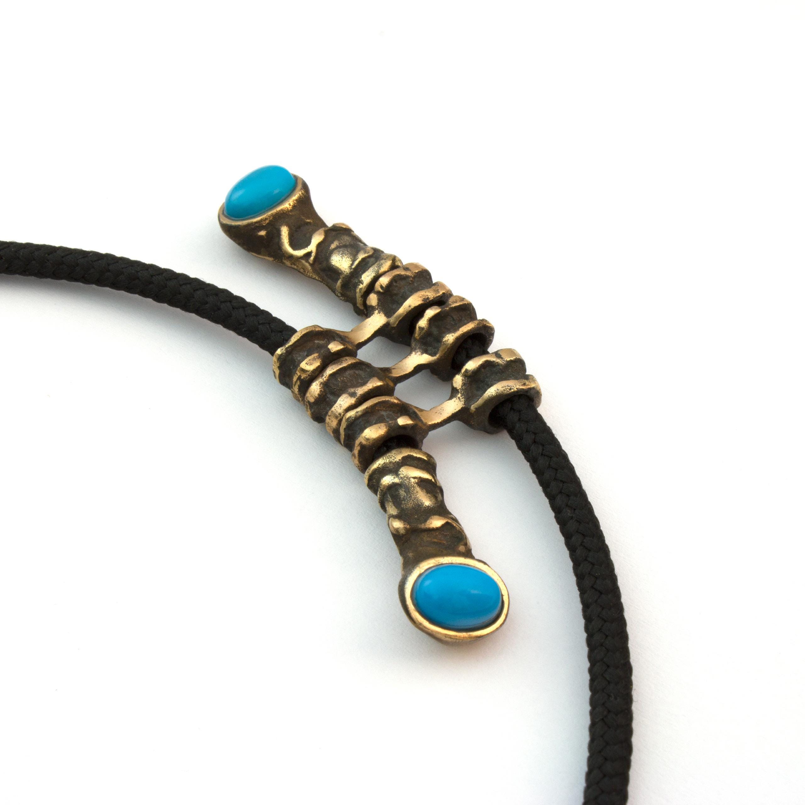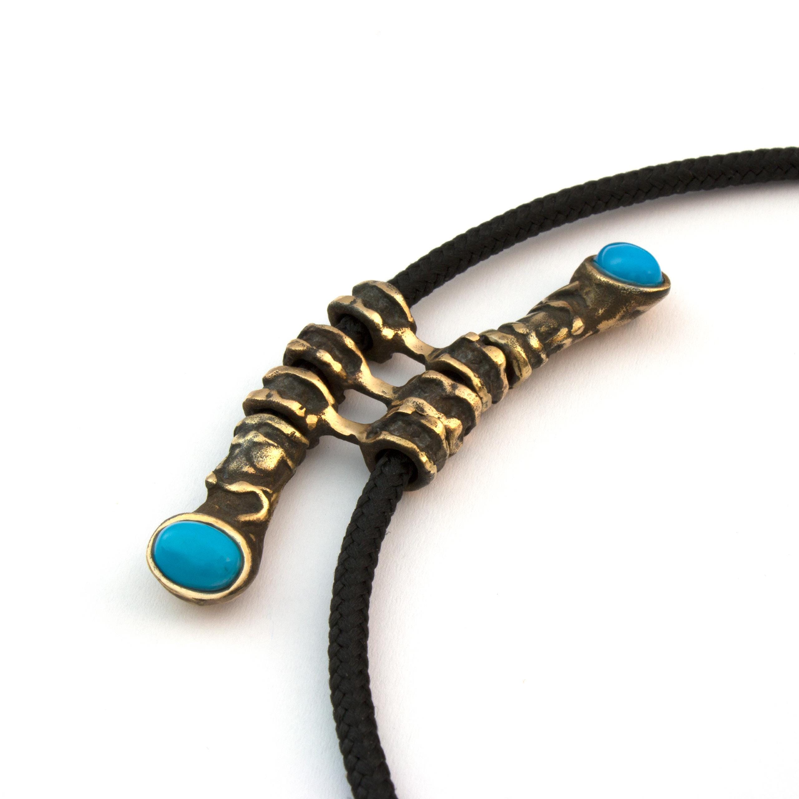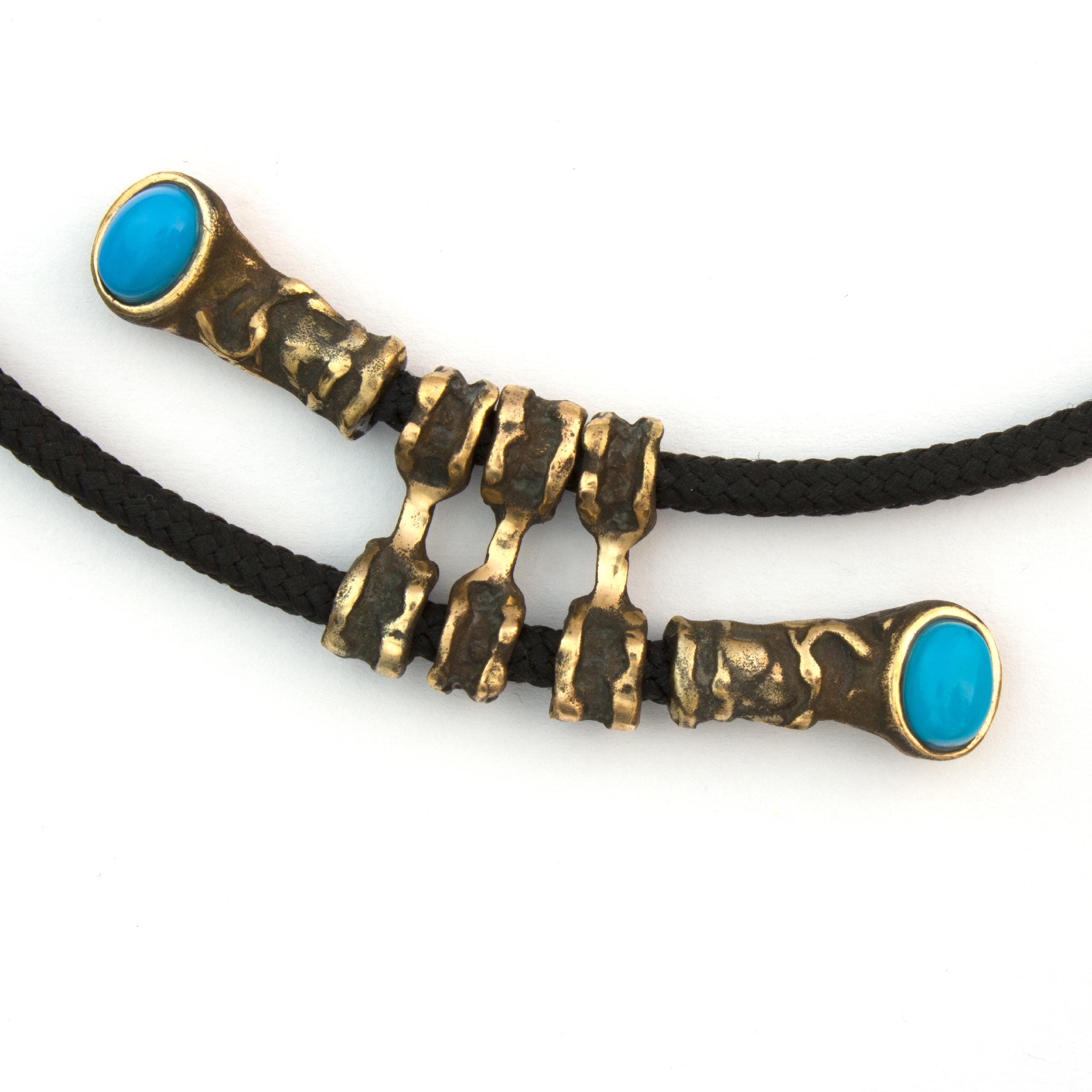 The "Grid-style" necklace by Vojtěška Vlčková (1948-2023) represents a perfect fusion of geometric precision and the organic beauty of turquenite. This authorial jewel, created using the lost wax casting method, combines the textured surface of patinated bronze with the blue-green shimmer of the semi-precious stone. The result is an exceptional piece that balances between sculptural solidity and jewelry delicacy.