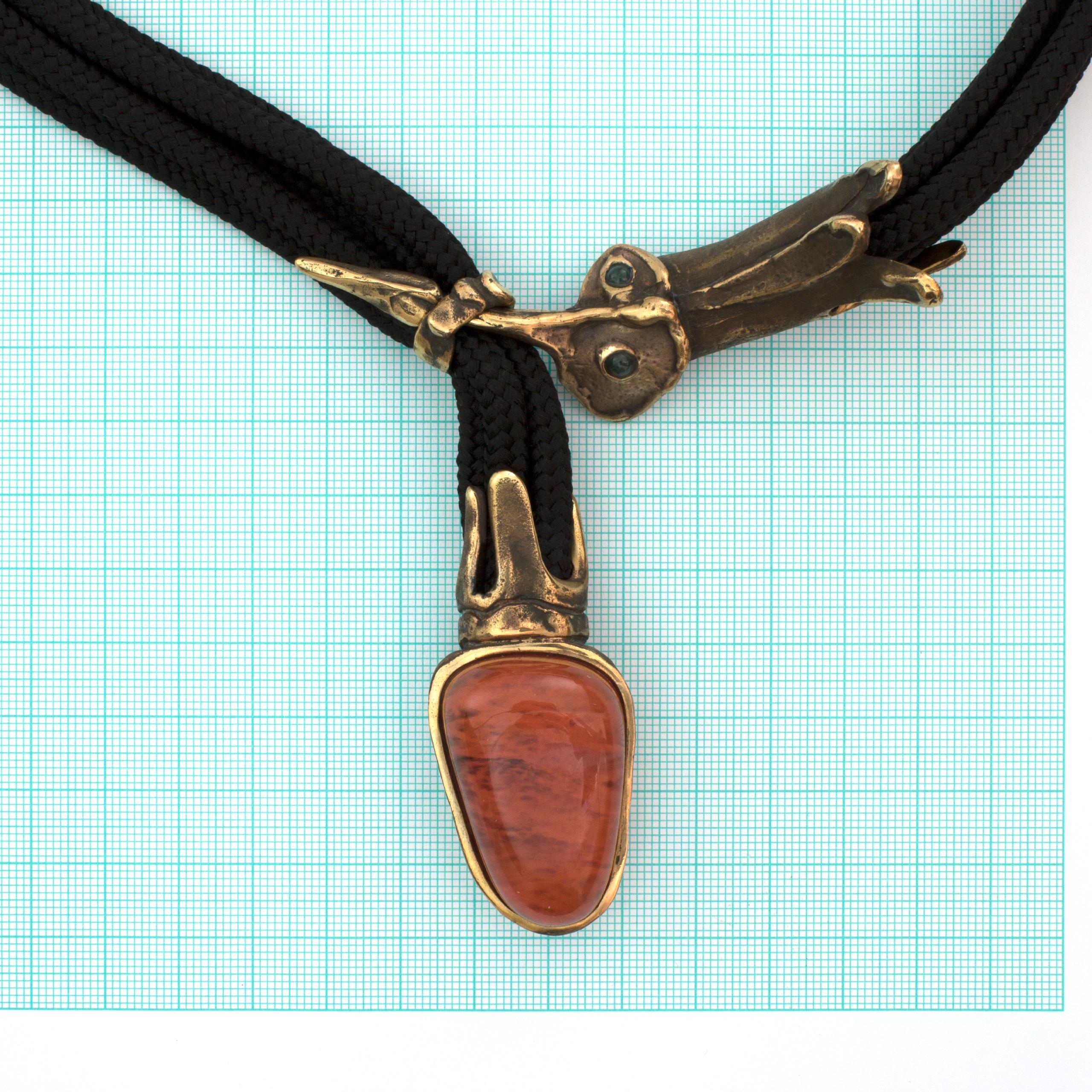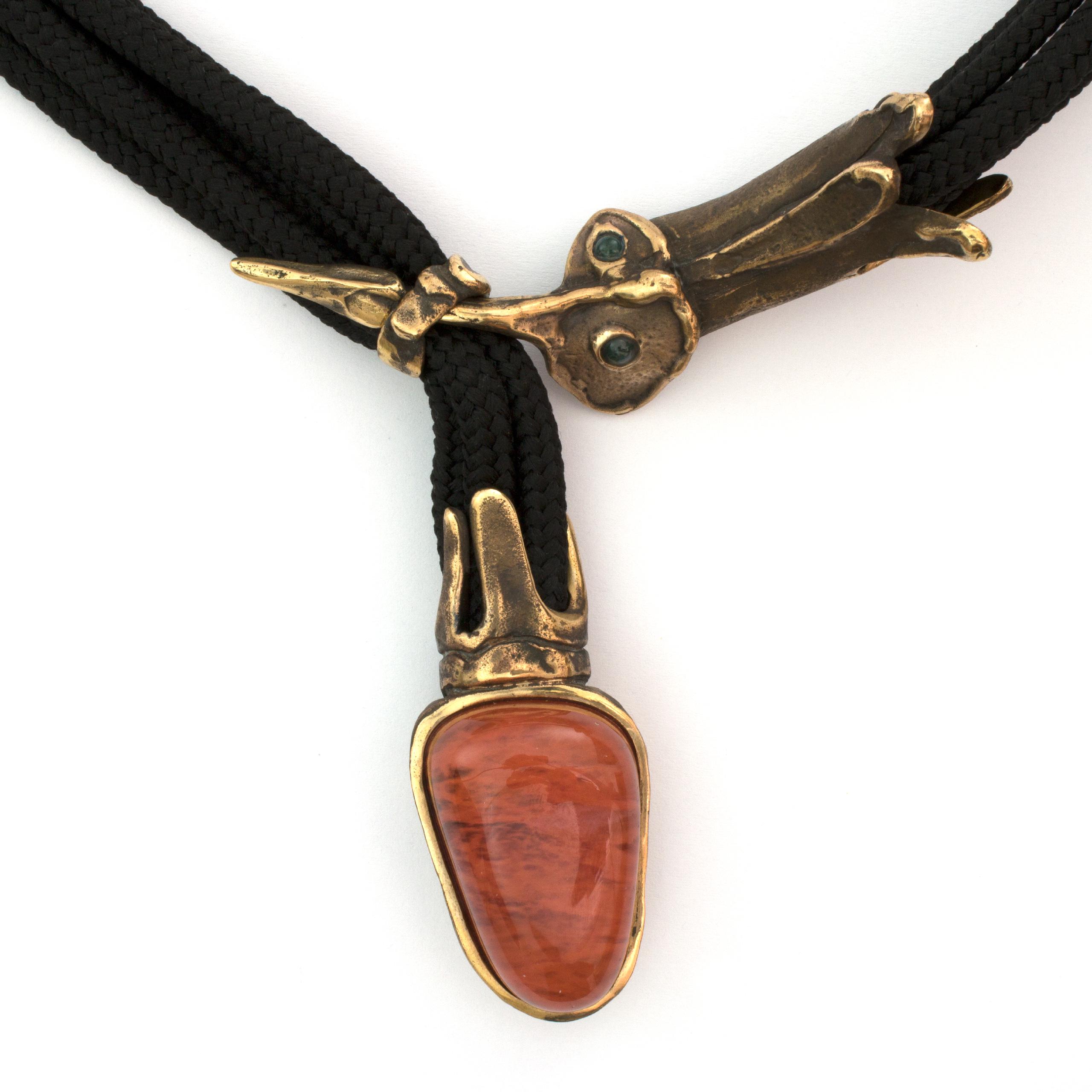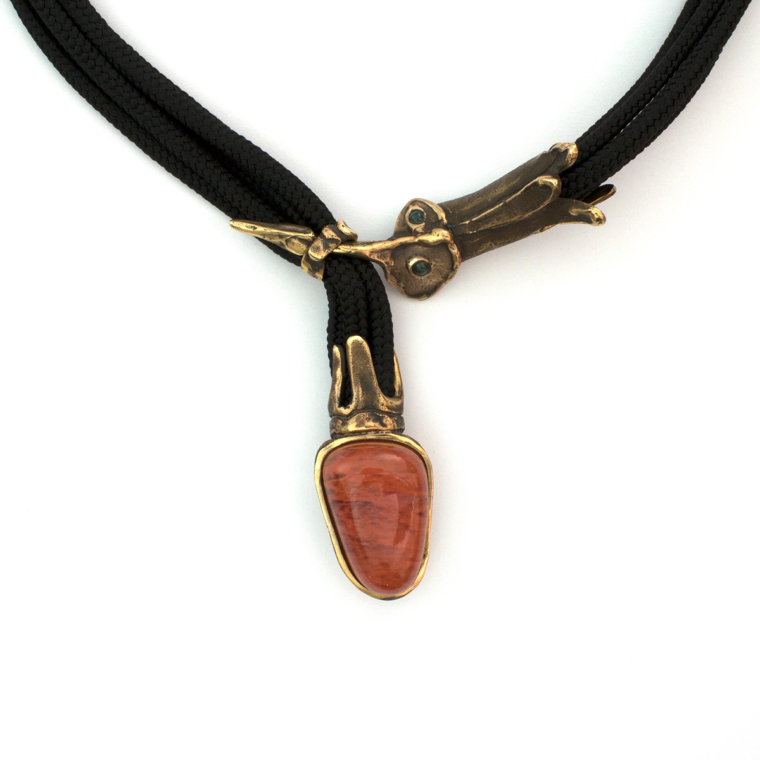 Bronze Necklace with Strawberry Quartz by Vojtěška Vlčková Catalogue number: 198 Original title: Straka zlodějka Author: Vojtěška Vlčková Production: Jaromíra Pavlíková Material: bronze Technology: lost wax casting