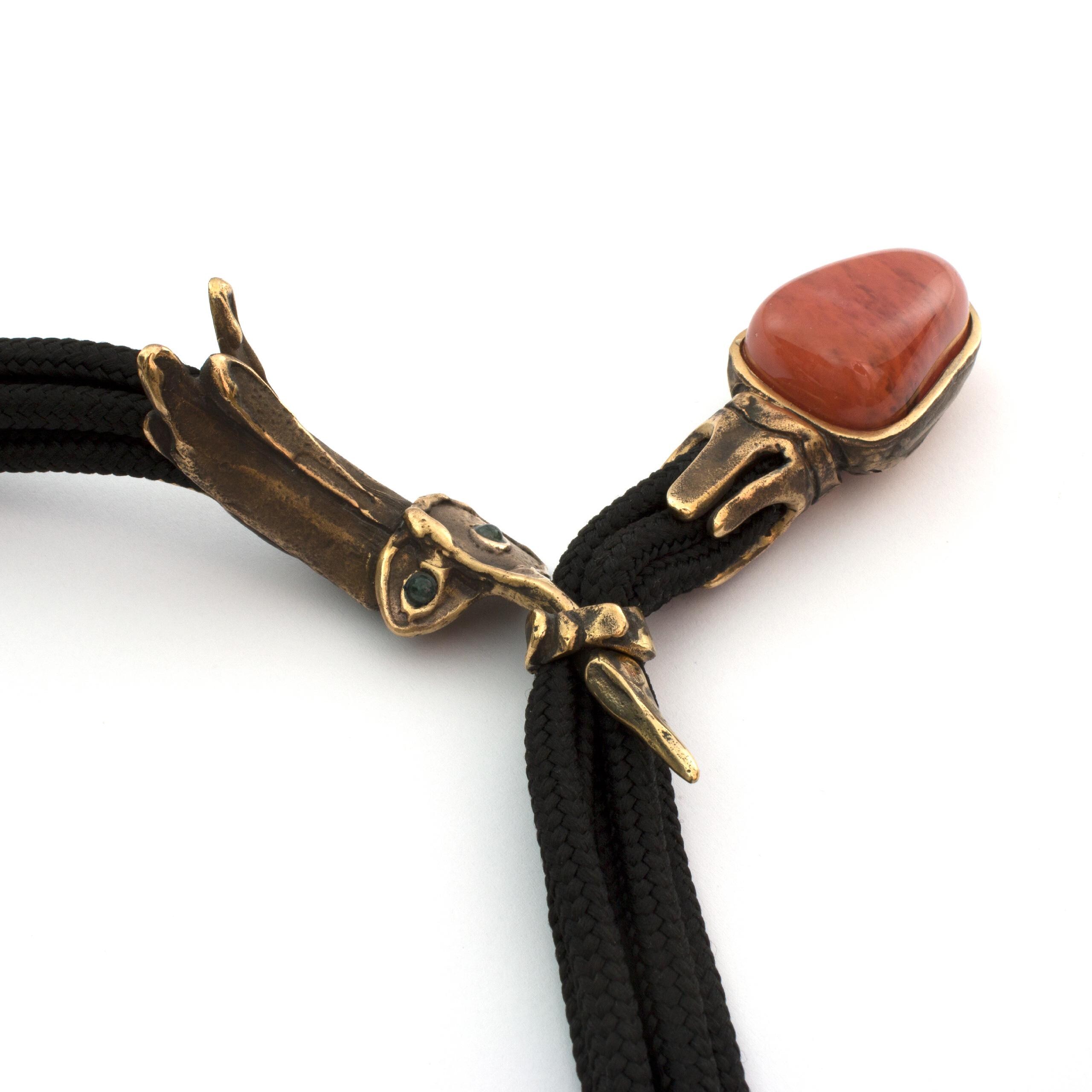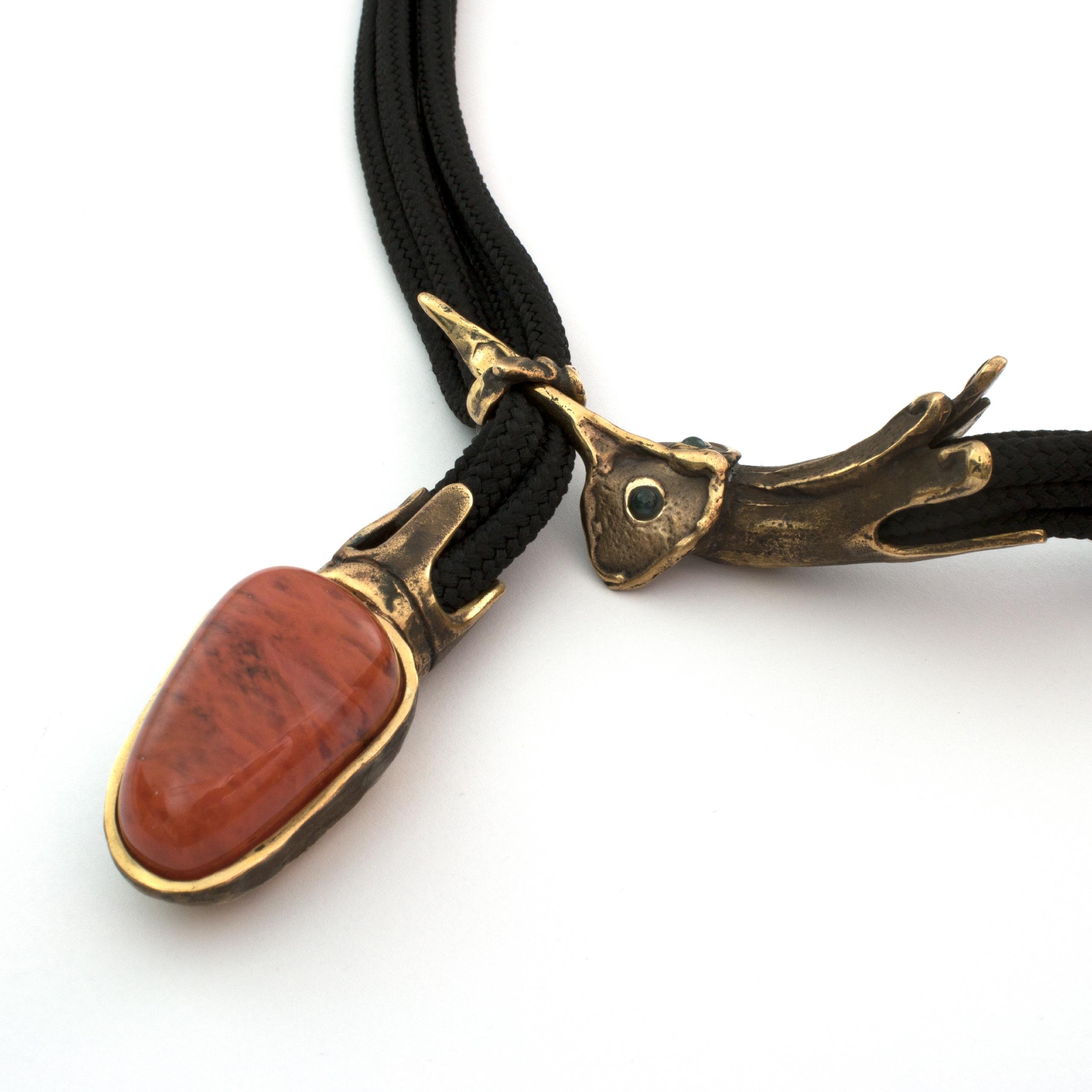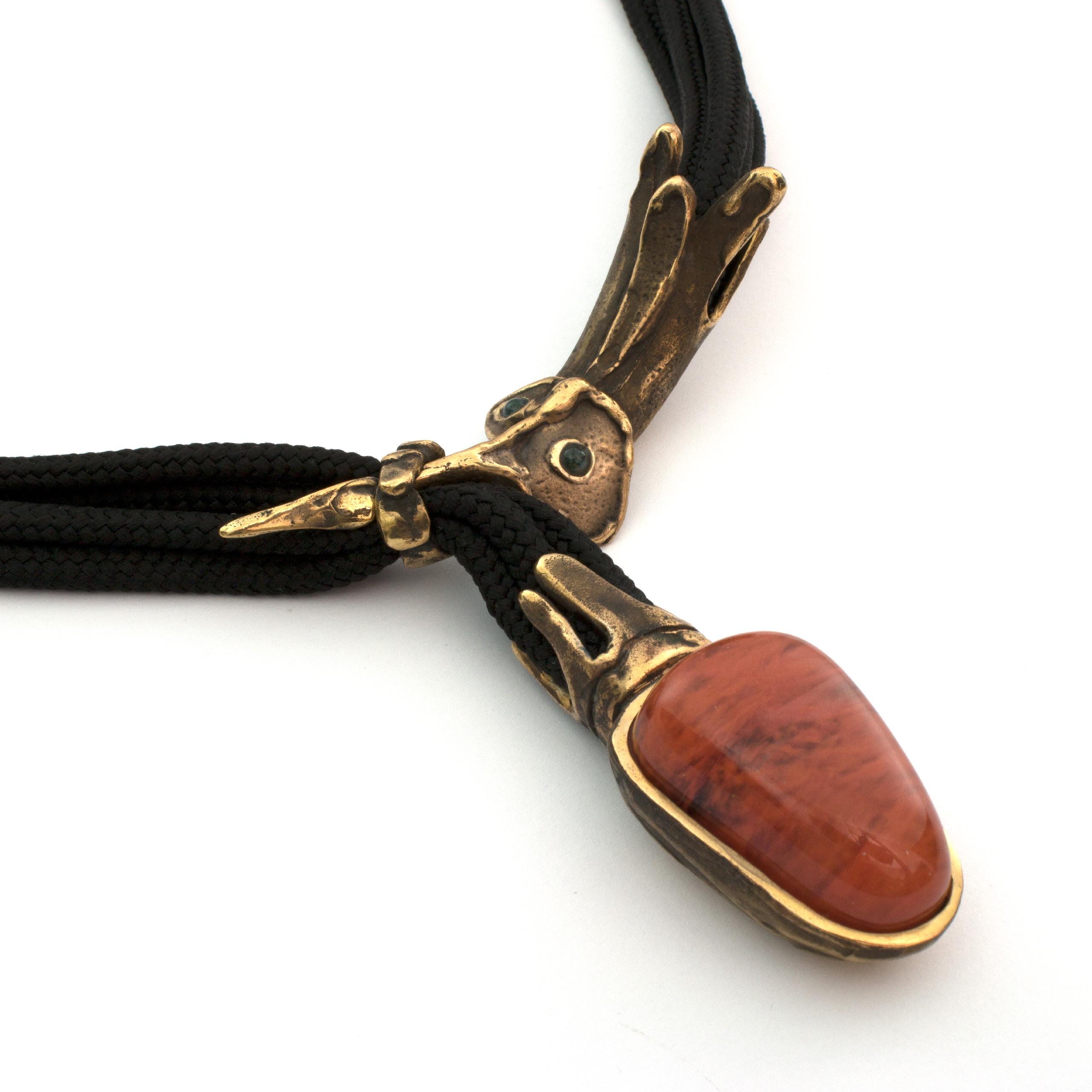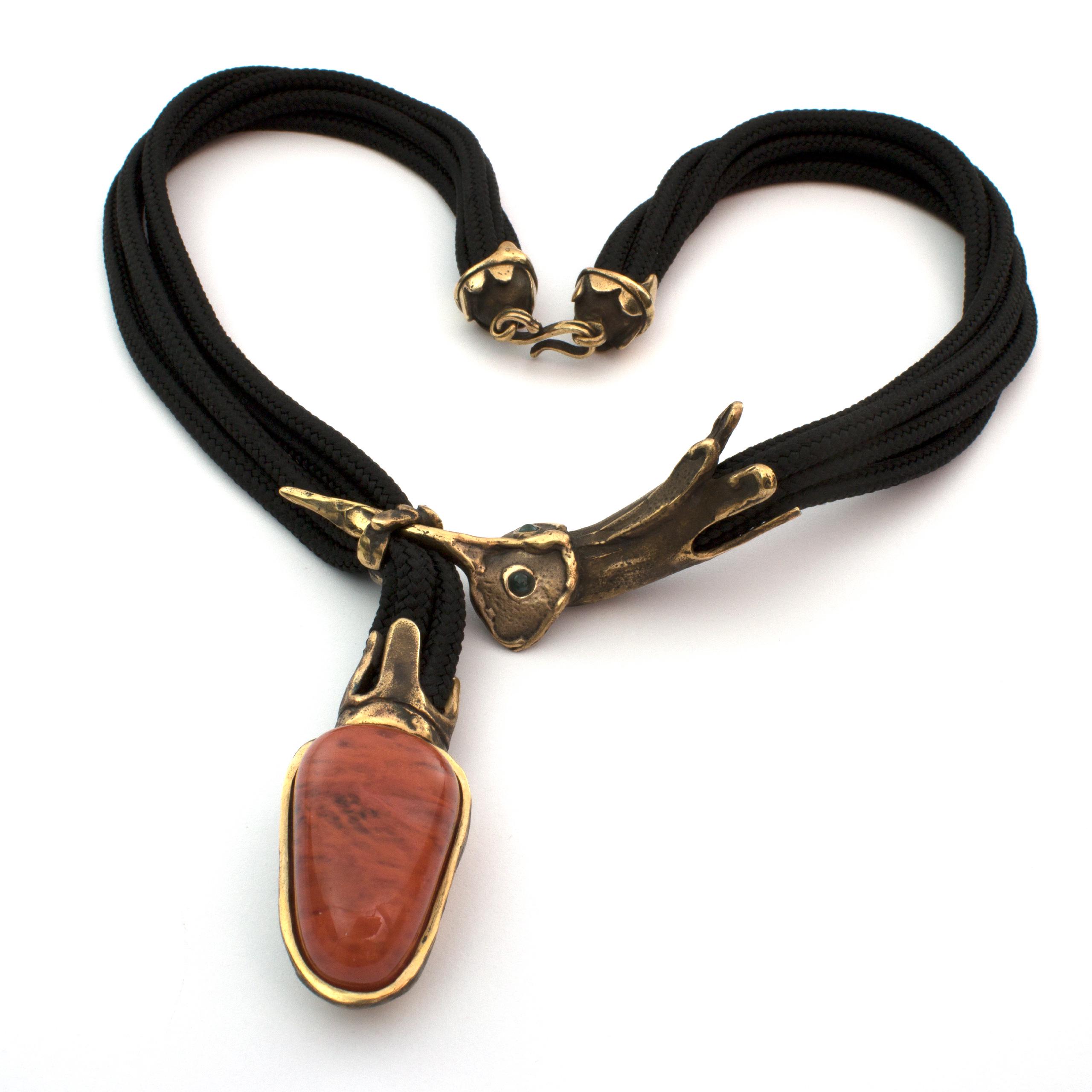 Bronze Necklace with Strawberry Quartz by Vojtěška Vlčková Catalogue number: 198 Original title: Straka zlodějka Author: Vojtěška Vlčková Production: Jaromíra Pavlíková Material: bronze Technology: lost wax casting