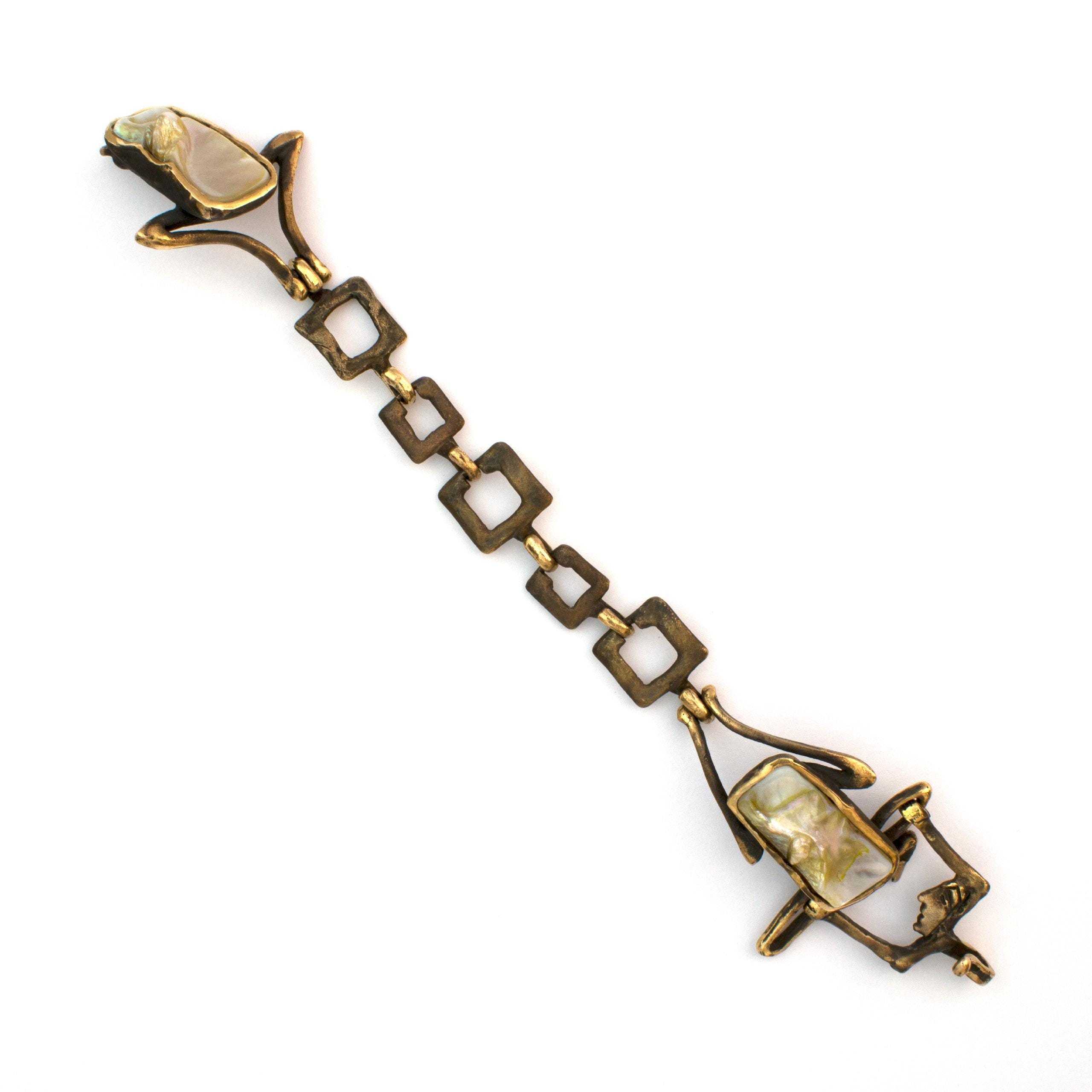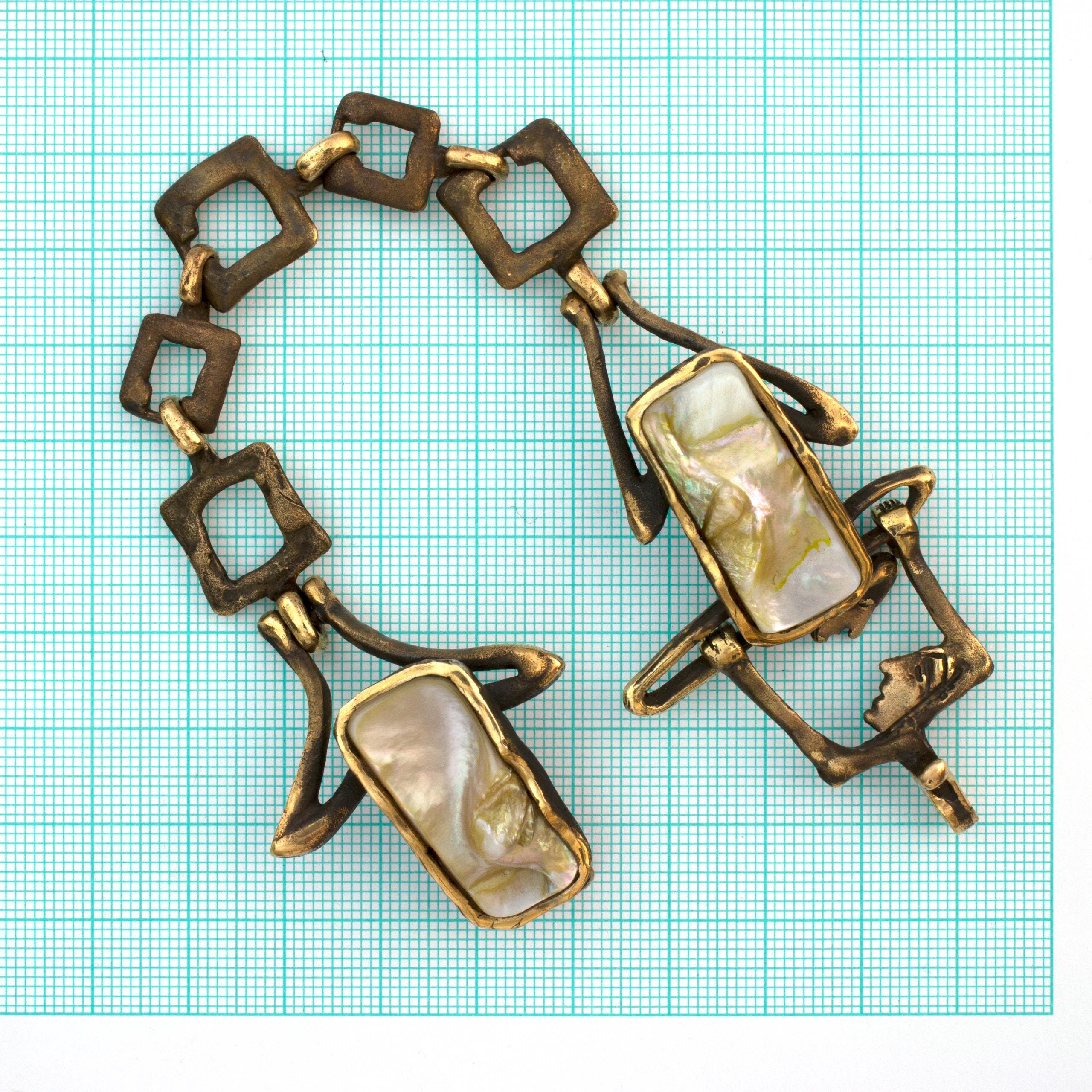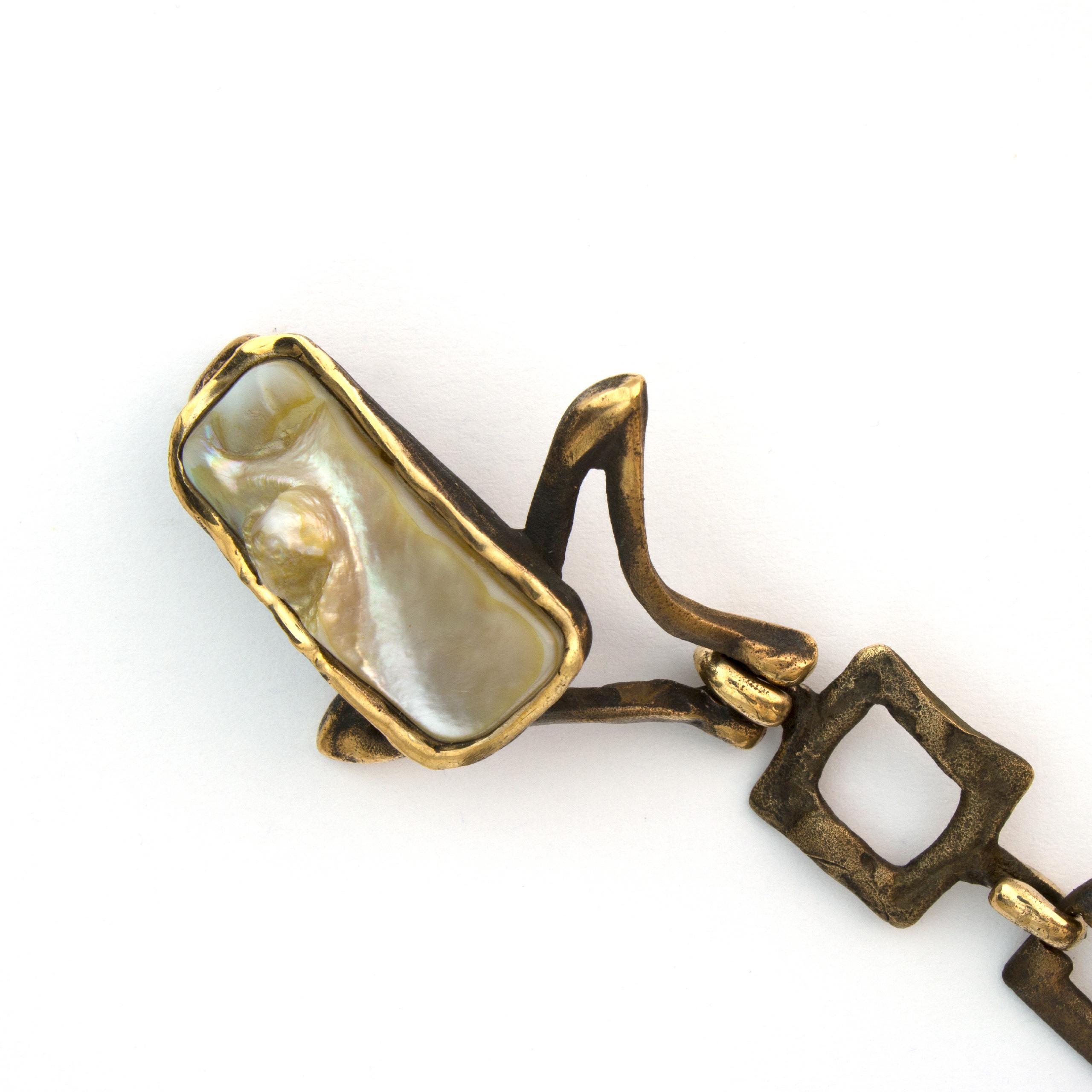 The "Amphibians" bracelet by Vojtěška Vlčková (1948-2023) is an authorial jewel created using the lost wax casting method. This artistic work connects the durability of patinated bronze with the iridescent shimmer of mother-of-pearl, creating a play of light and shadow. This unique piece bears the stamp of original artistic expression, where natural materials become part of a sculptural composition.