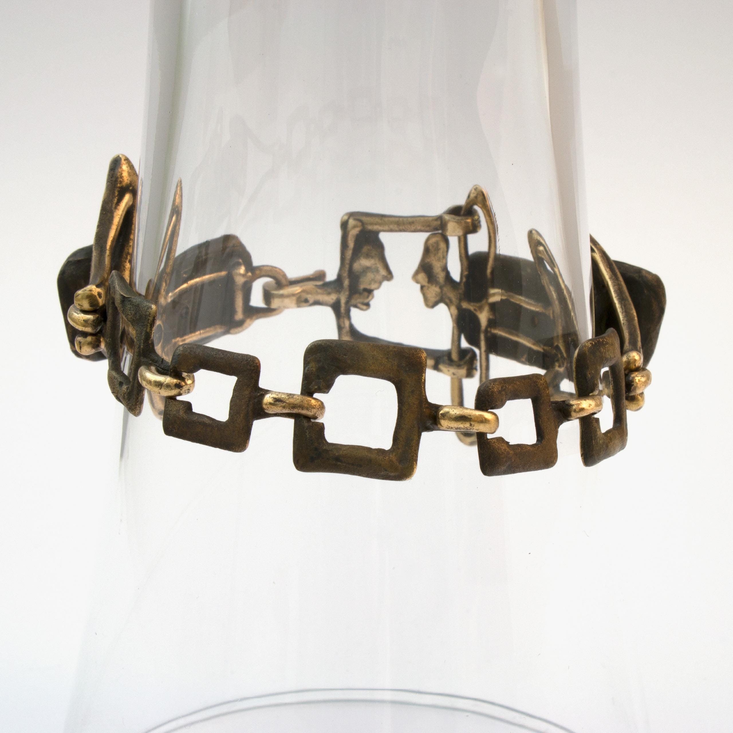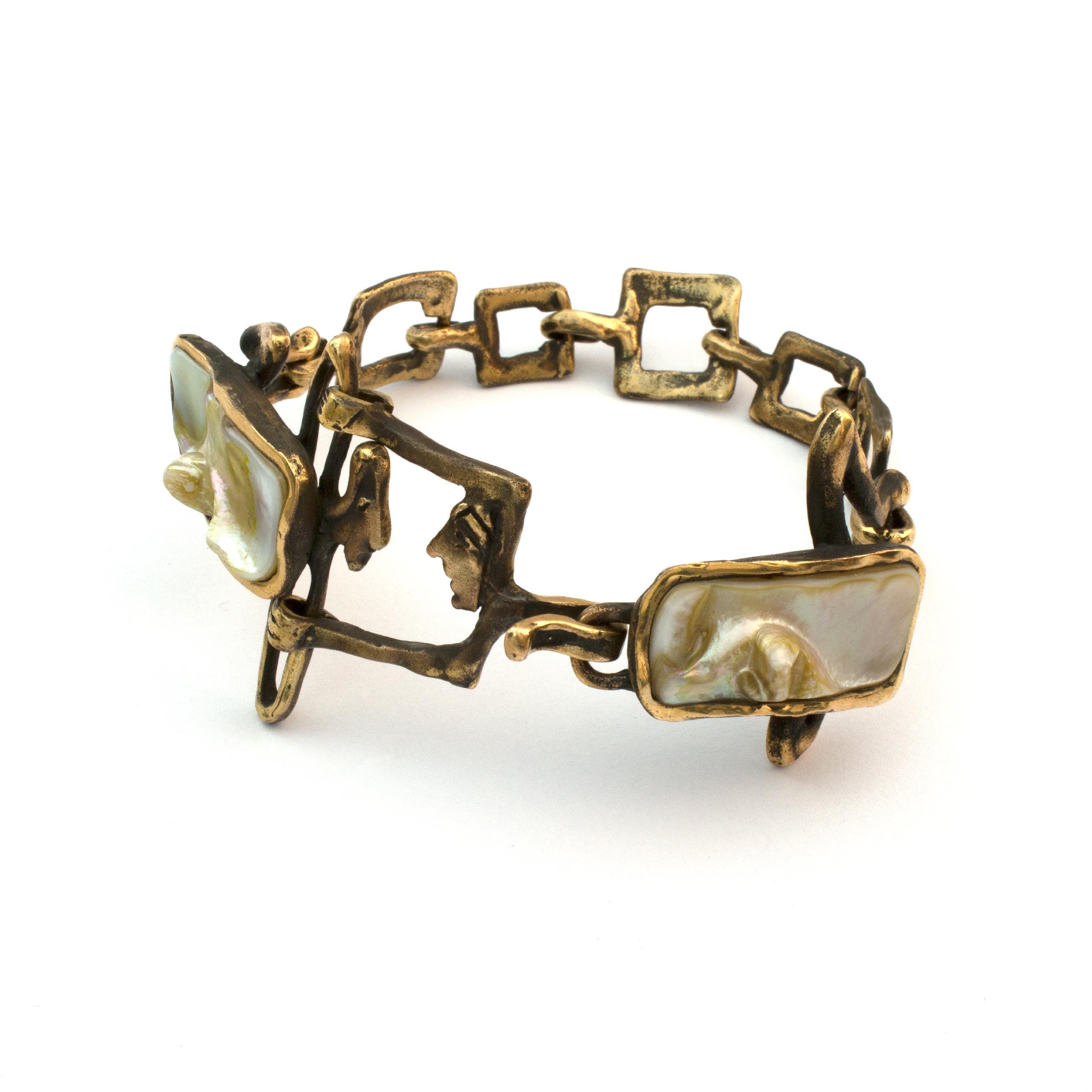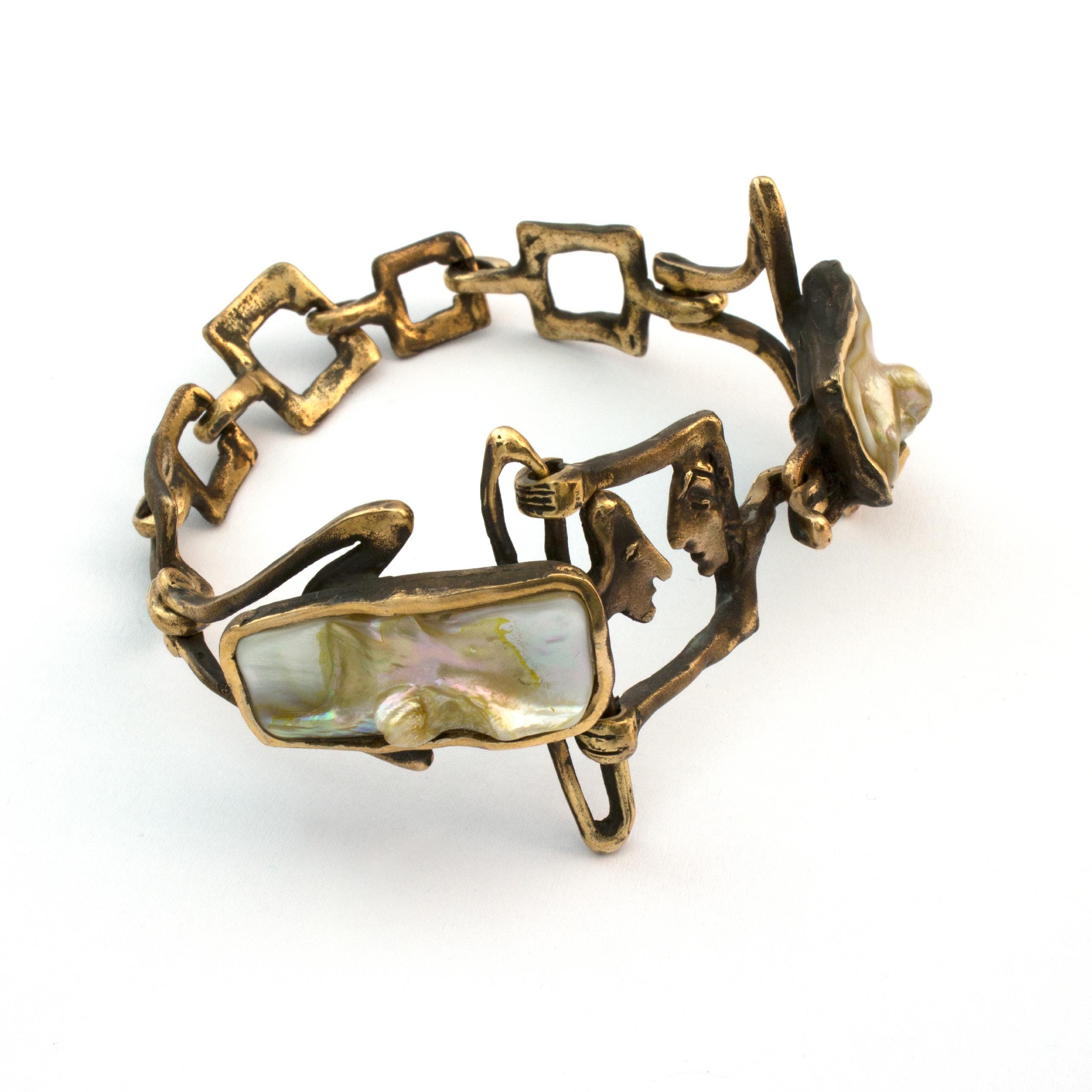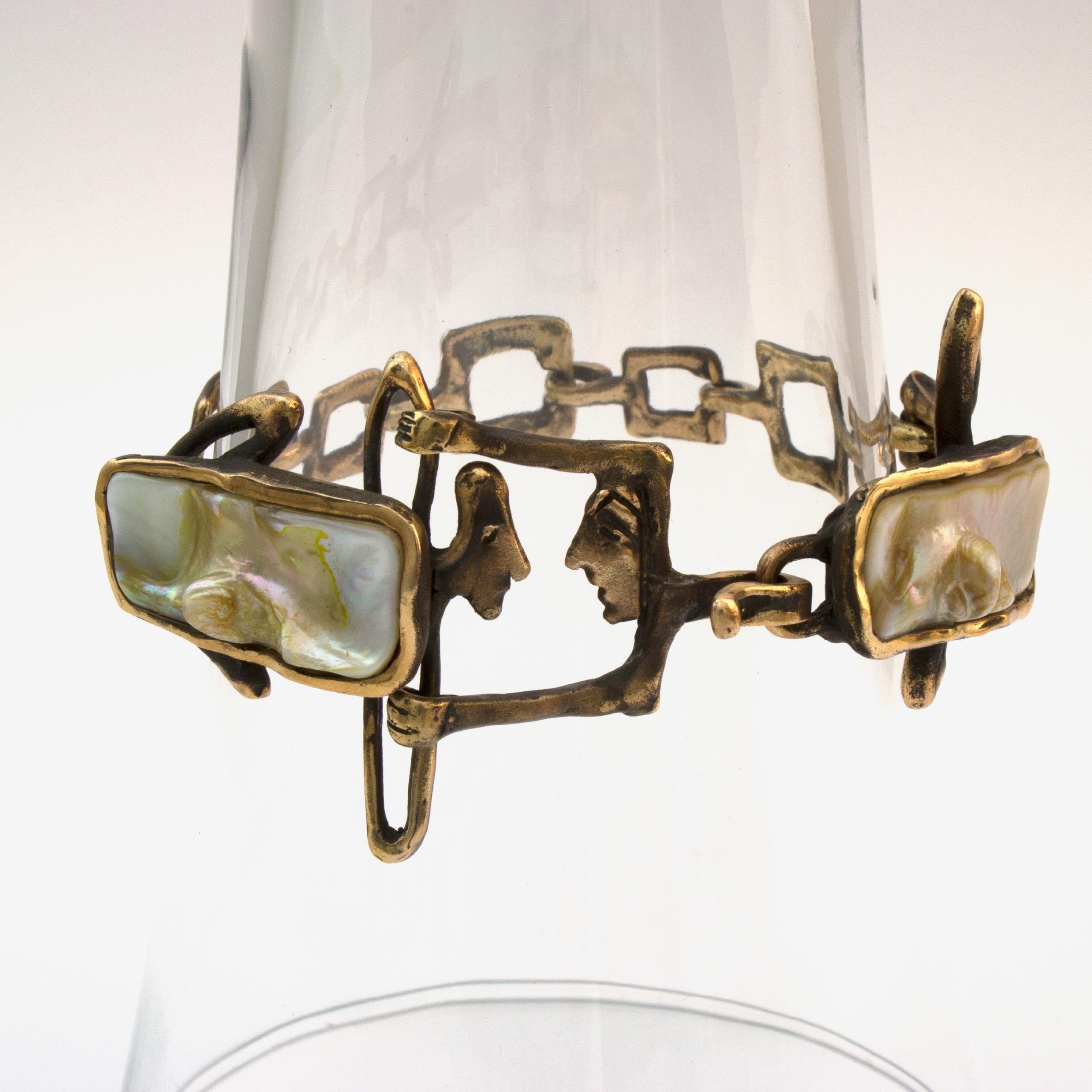 The "Amphibians" bracelet by Vojtěška Vlčková (1948-2023) is an authorial jewel created using the lost wax casting method. This artistic work connects the durability of patinated bronze with the iridescent shimmer of mother-of-pearl, creating a play of light and shadow. This unique piece bears the stamp of original artistic expression, where natural materials become part of a sculptural composition.