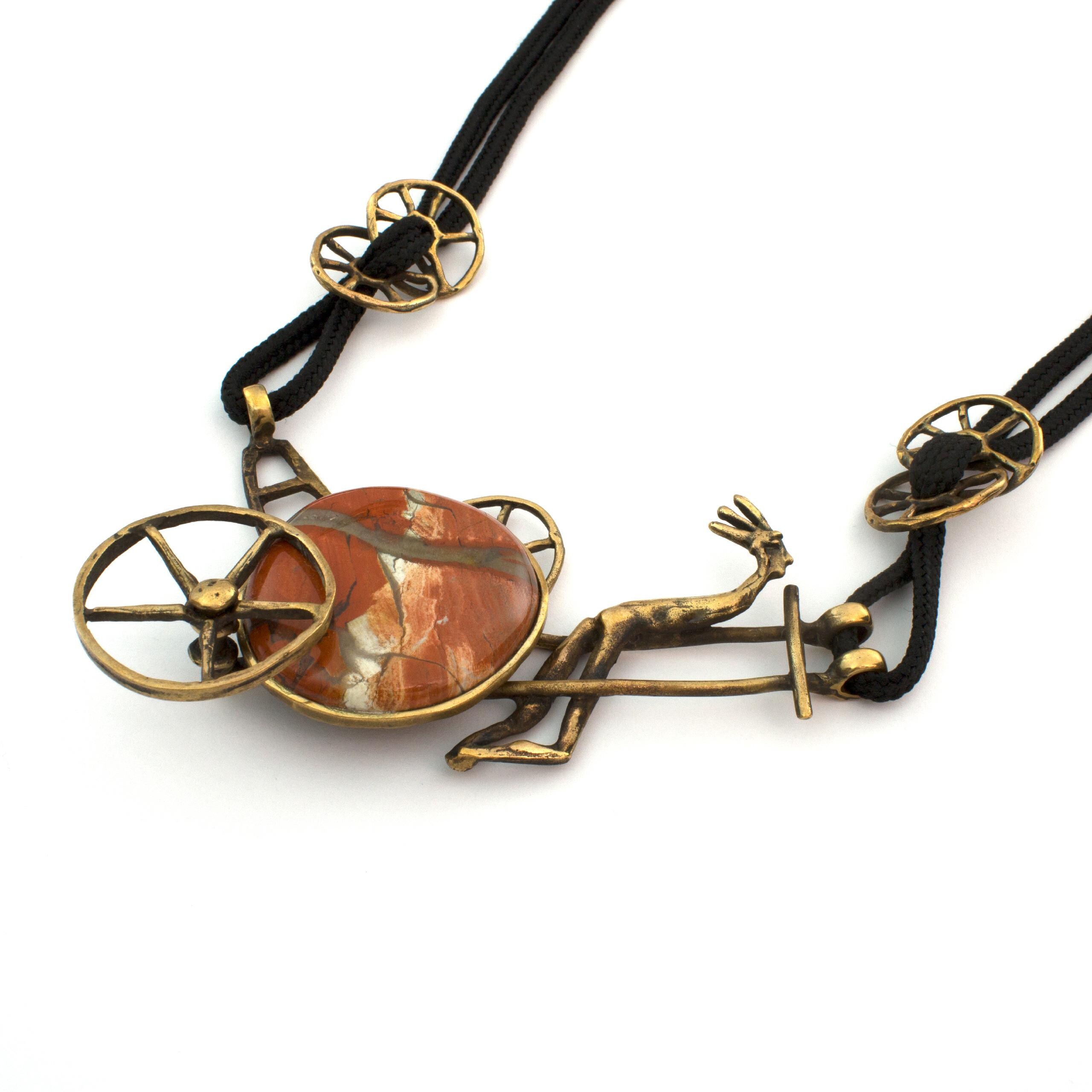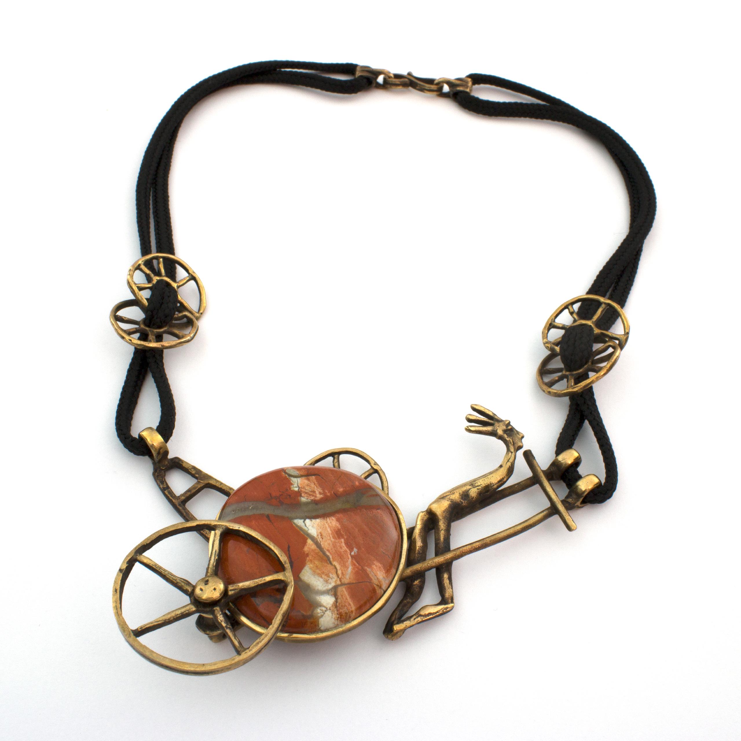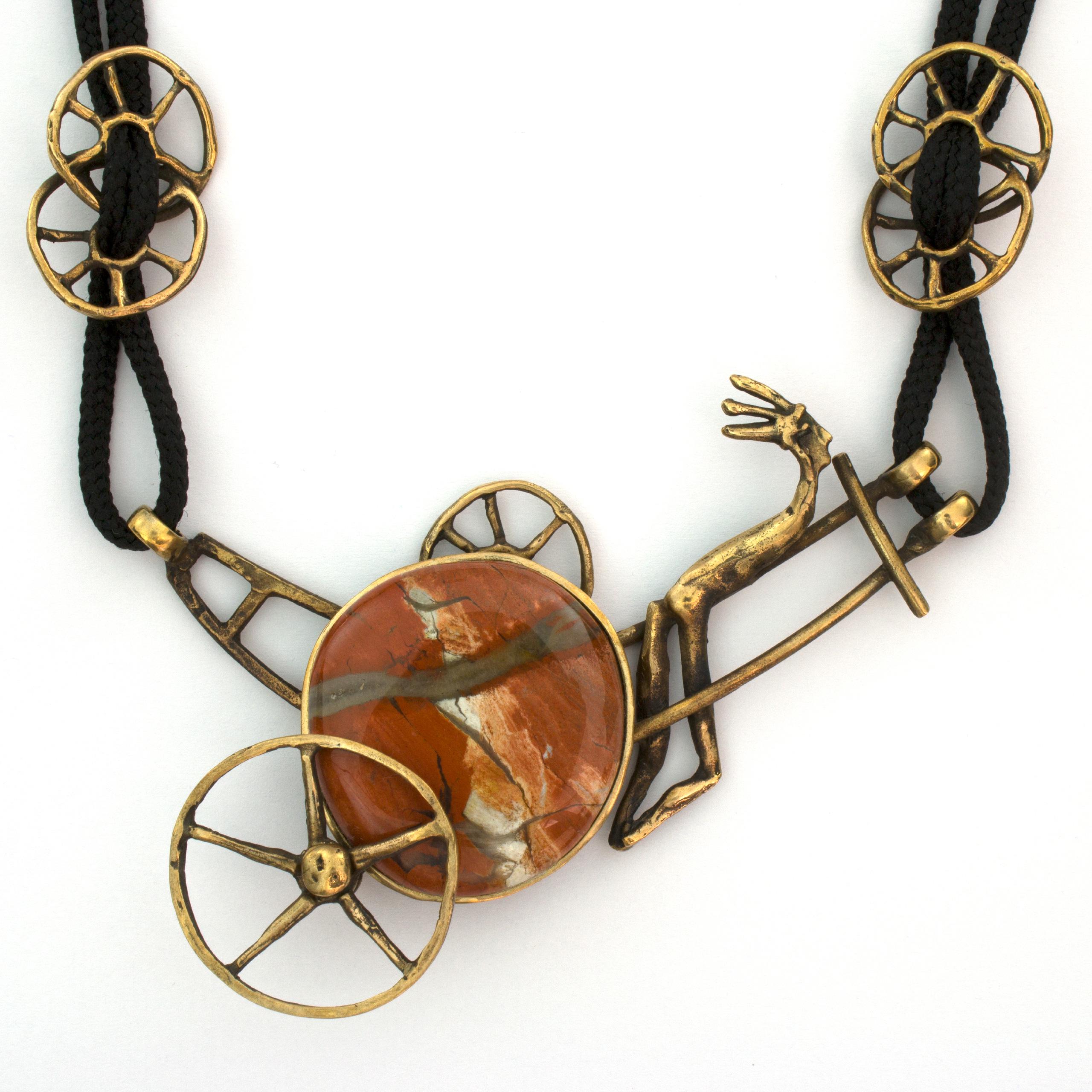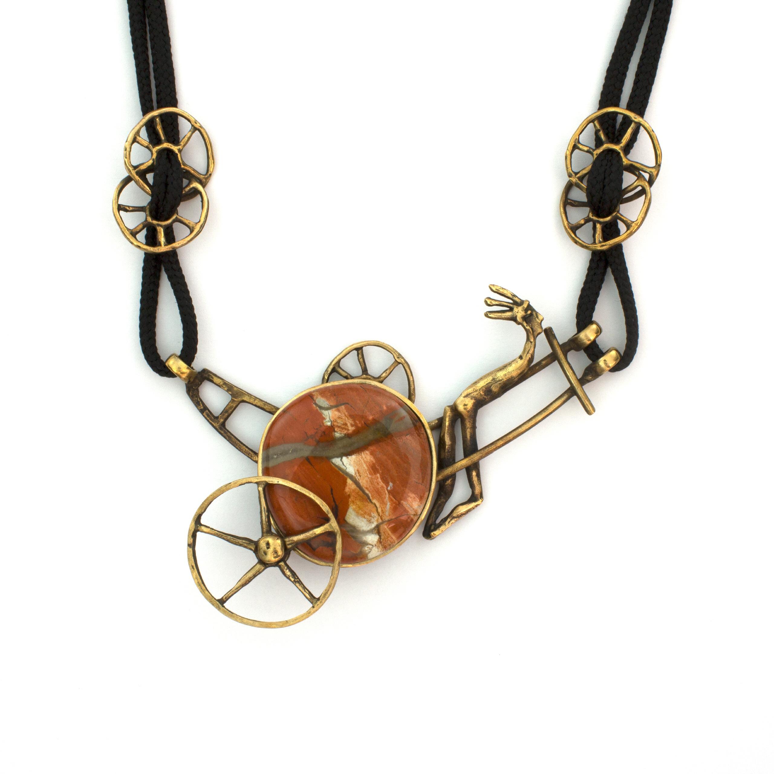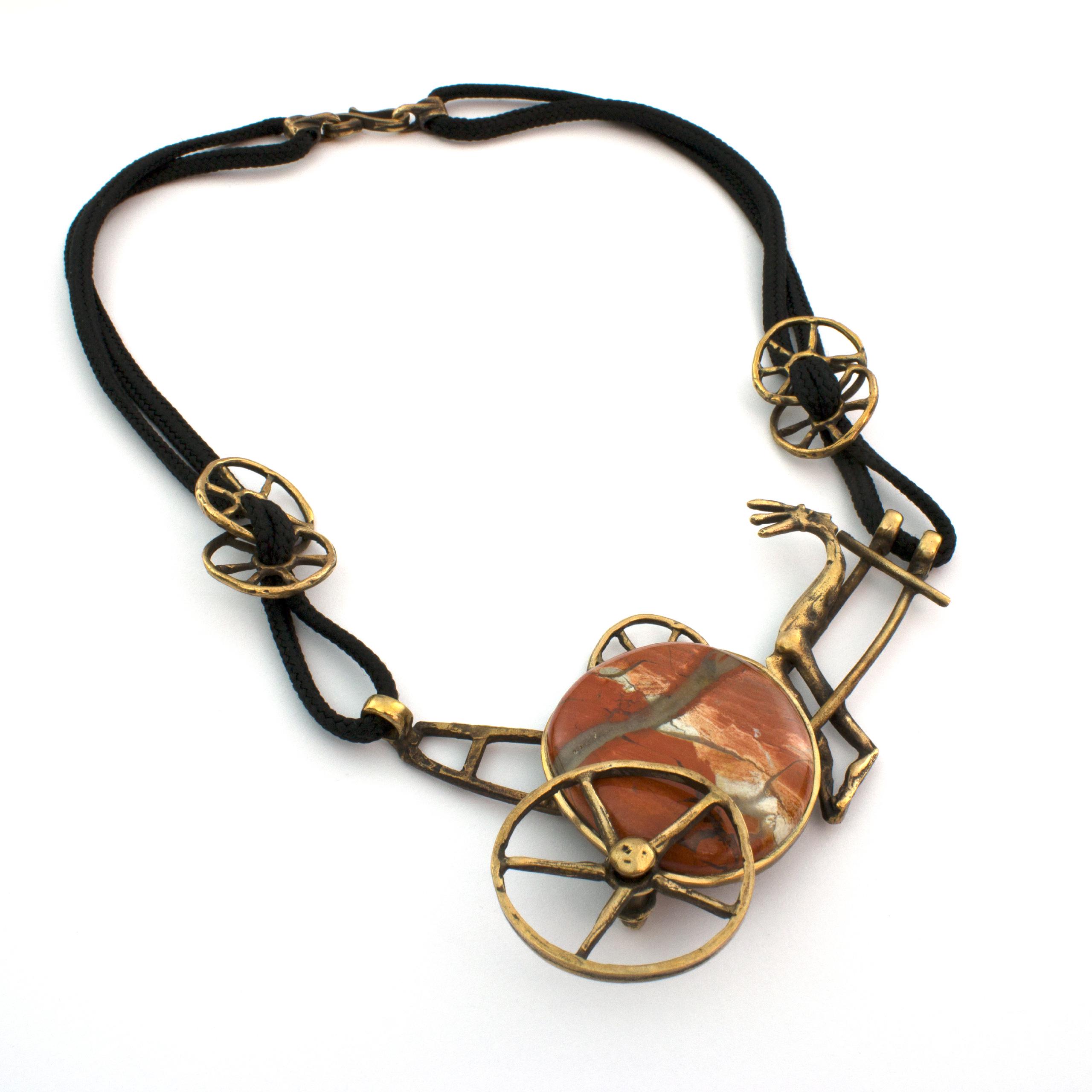 Bronze necklace with jasper by Czech sculptor and jewelry artist Vojtěška Vlčková. Handcrafted using the traditional lost-wax casting technique, the composition harmonizes the warmth of bronze with the natural depth of jasper. A distinctive and elegant piece of wearable art with lasting collectible value.