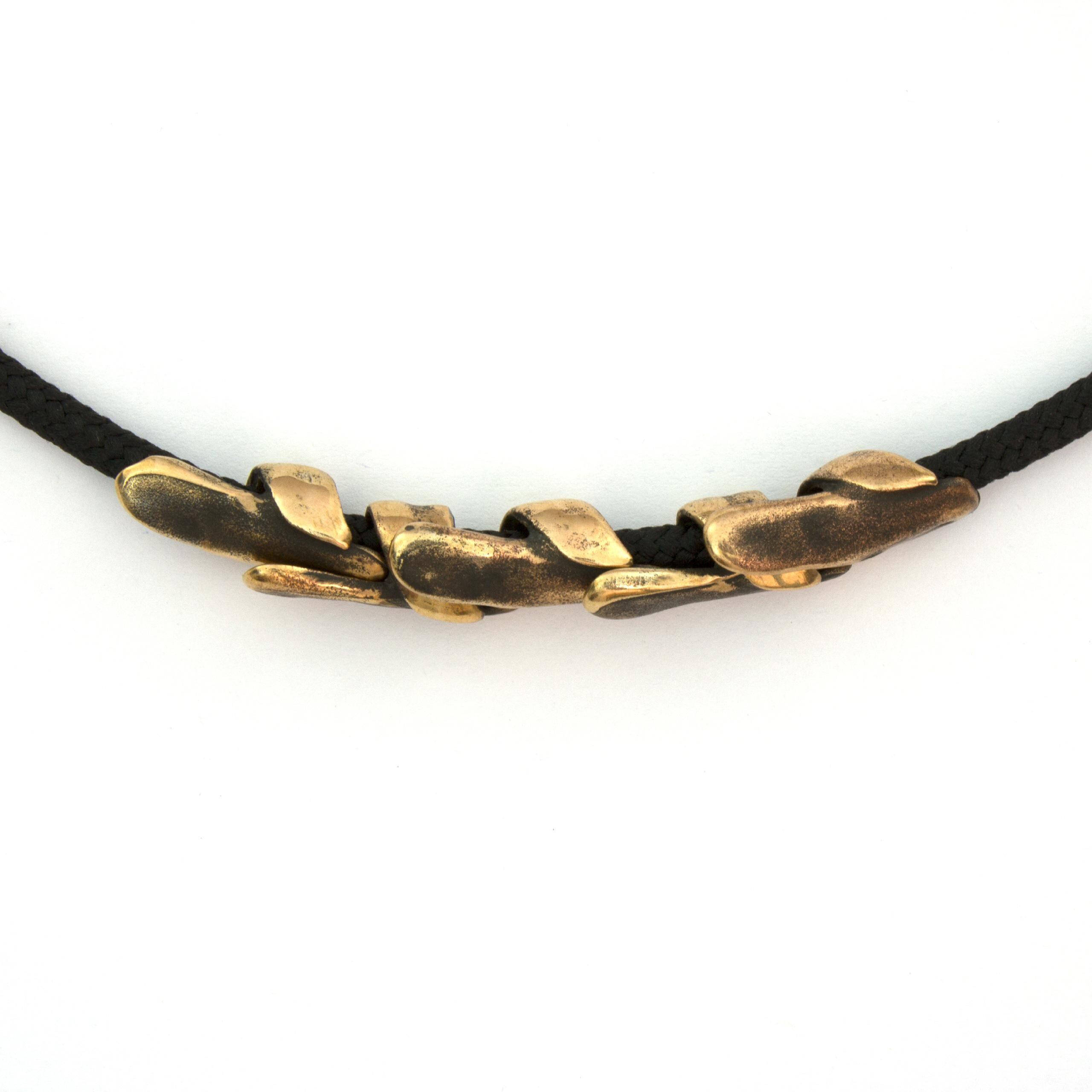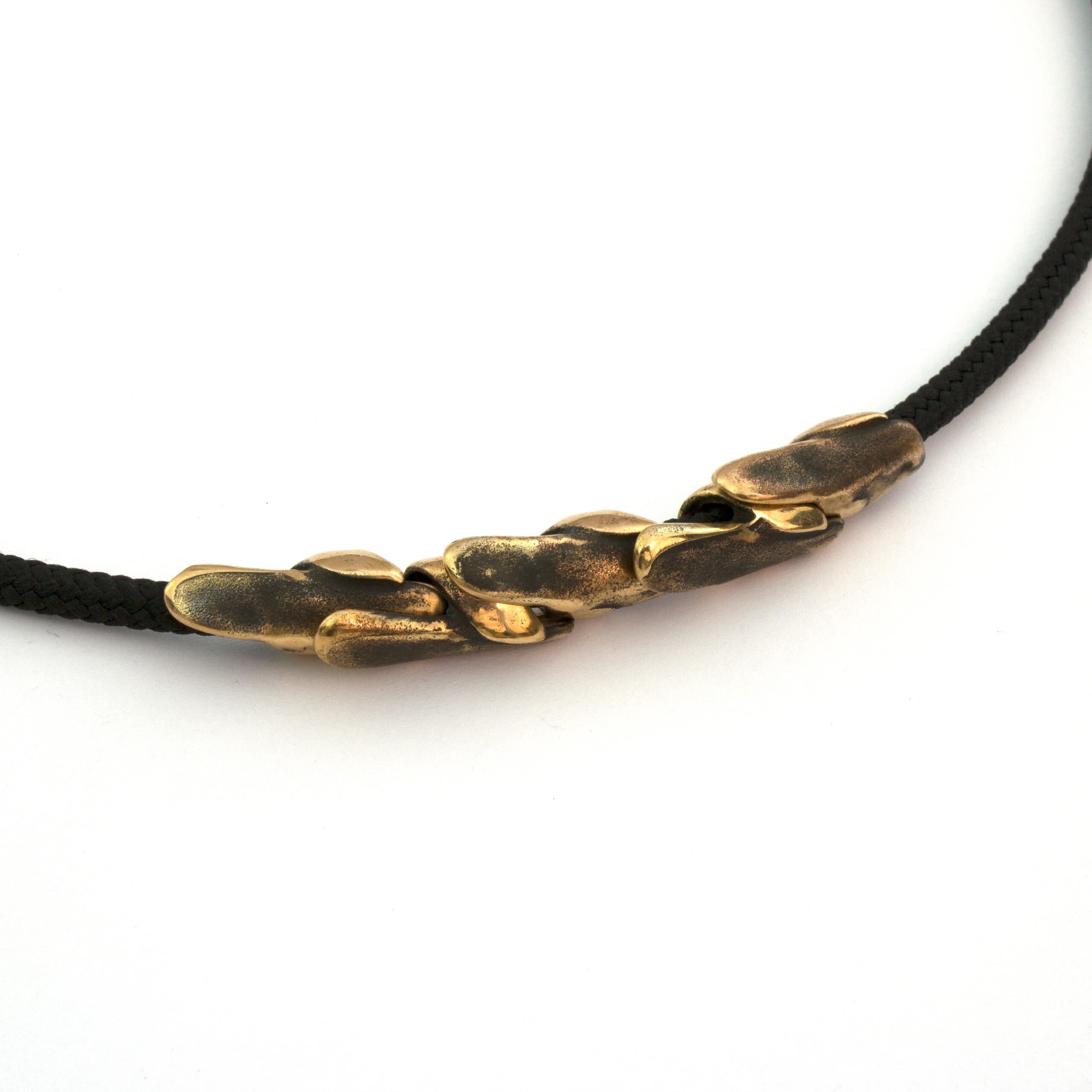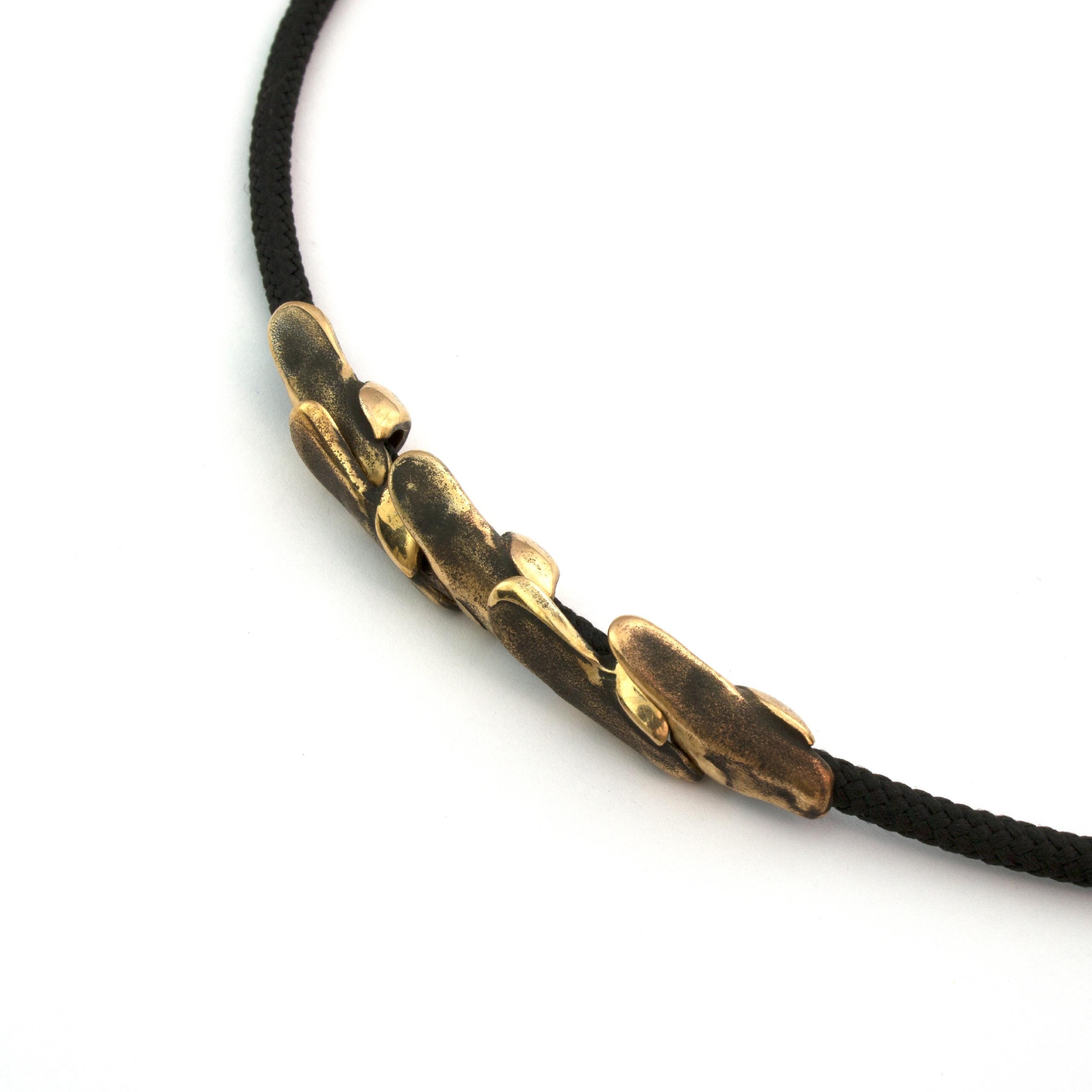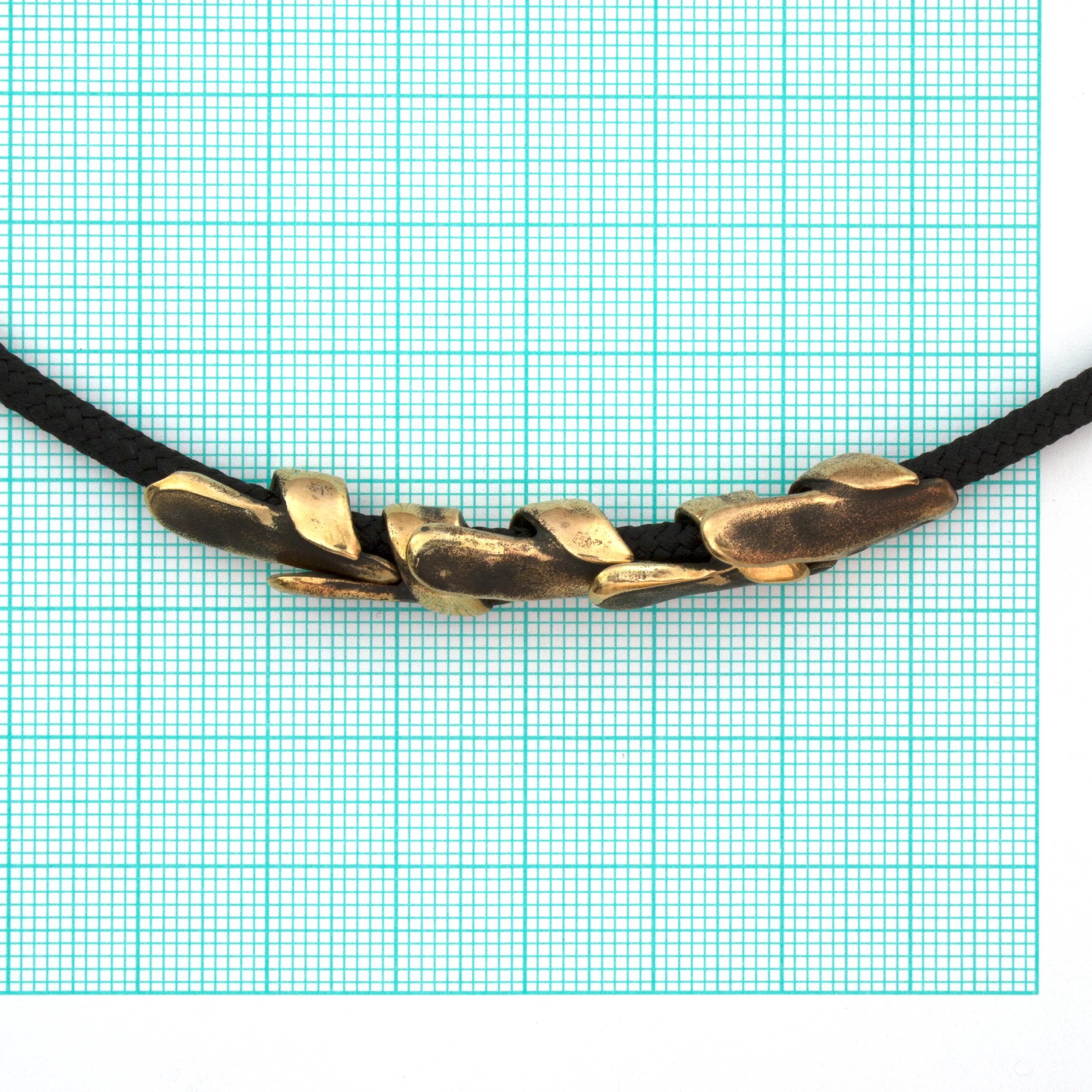 The bronze necklace “Rattlesnake” by Czech sculptor and jewelry artist Vojtěška Vlčková combines refined simplicity with sculptural expressiveness. Smooth bronze links set on a black cord create an elegant and balanced composition. Crafted using the traditional lost-wax casting technique, the piece reflects the artist’s distinctive sense of form and asymmetry. A remarkable item of wearable art and a collectible of lasting value.