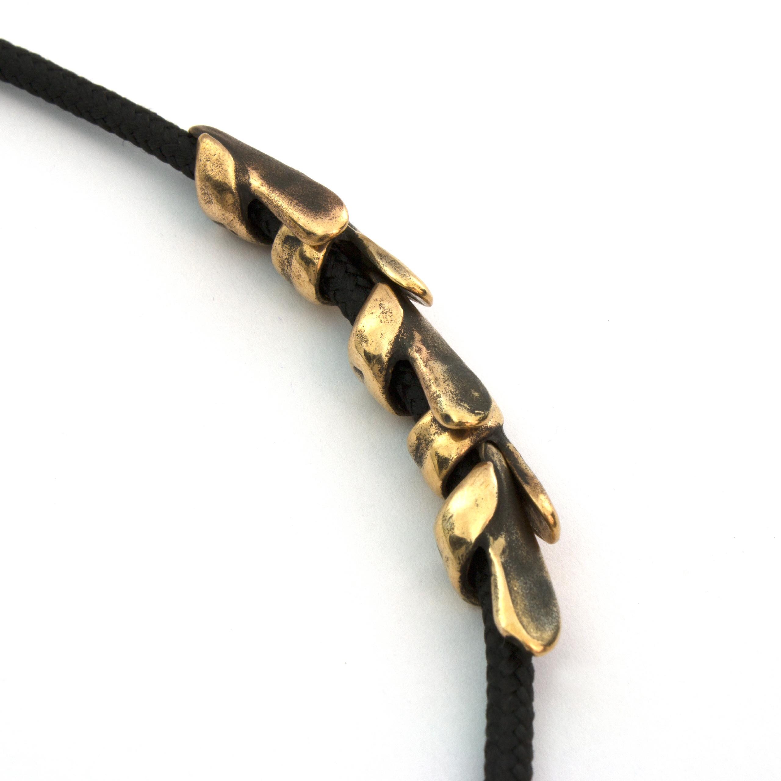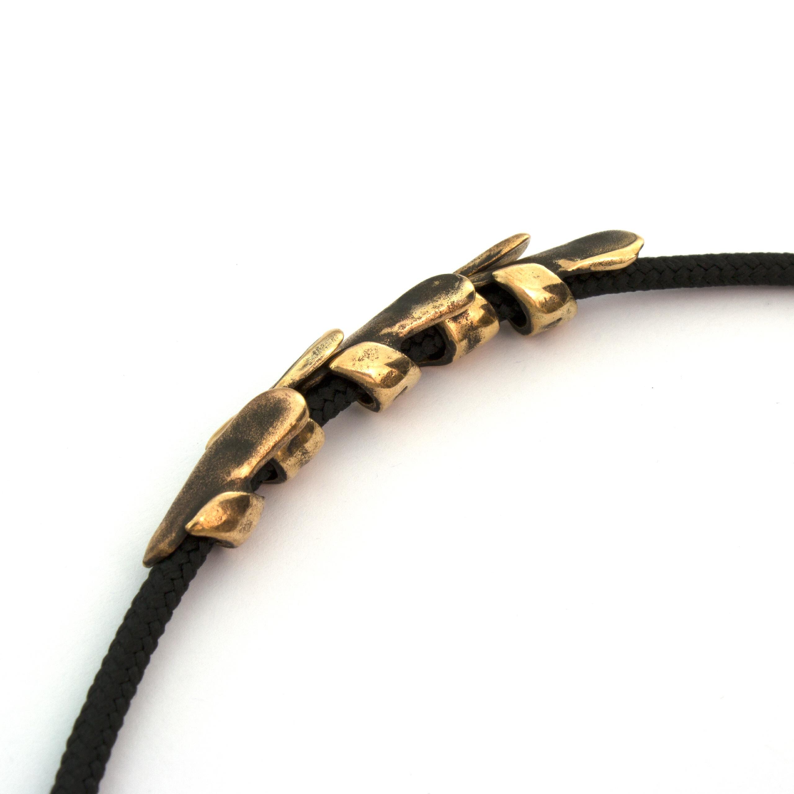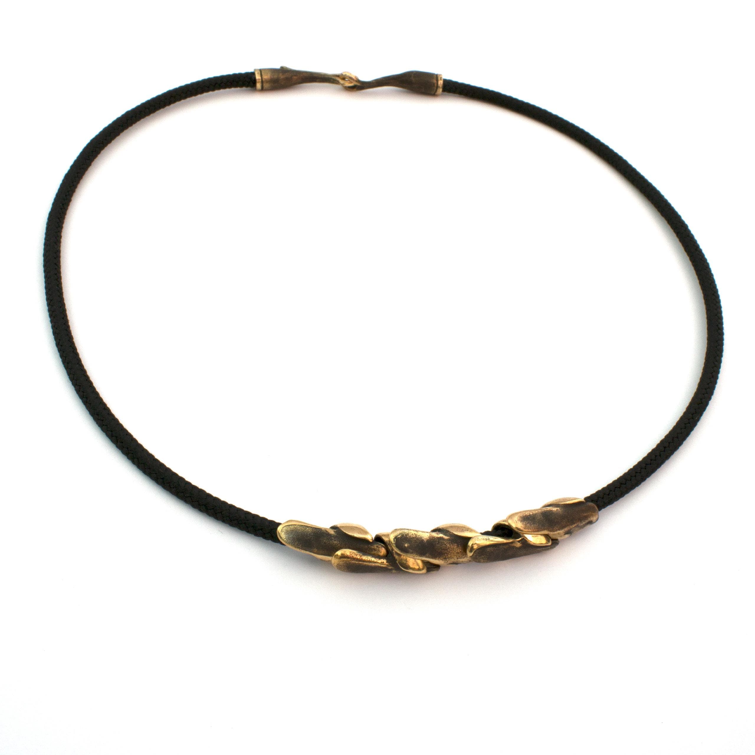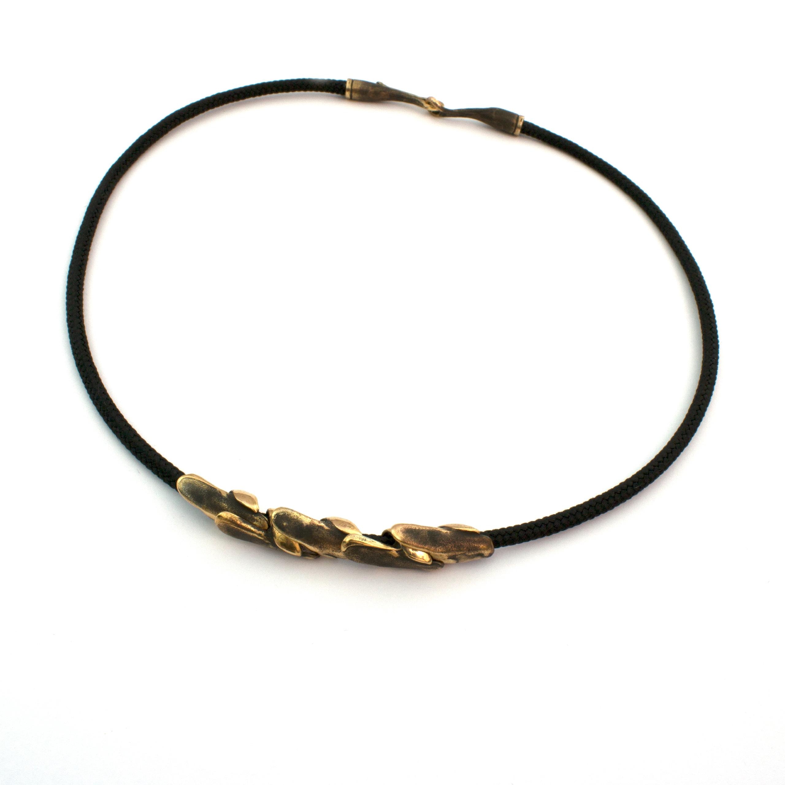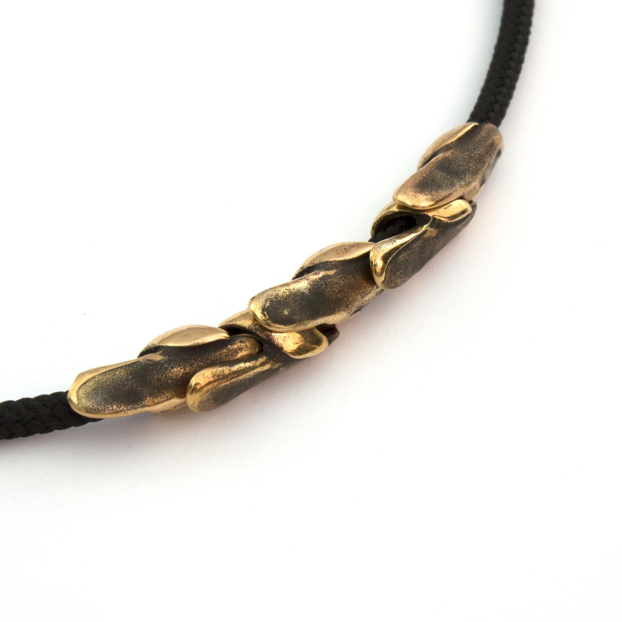 The bronze necklace “Rattlesnake” by Czech sculptor and jewelry artist Vojtěška Vlčková combines refined simplicity with sculptural expressiveness. Smooth bronze links set on a black cord create an elegant and balanced composition. Crafted using the traditional lost-wax casting technique, the piece reflects the artist’s distinctive sense of form and asymmetry. A remarkable item of wearable art and a collectible of lasting value.