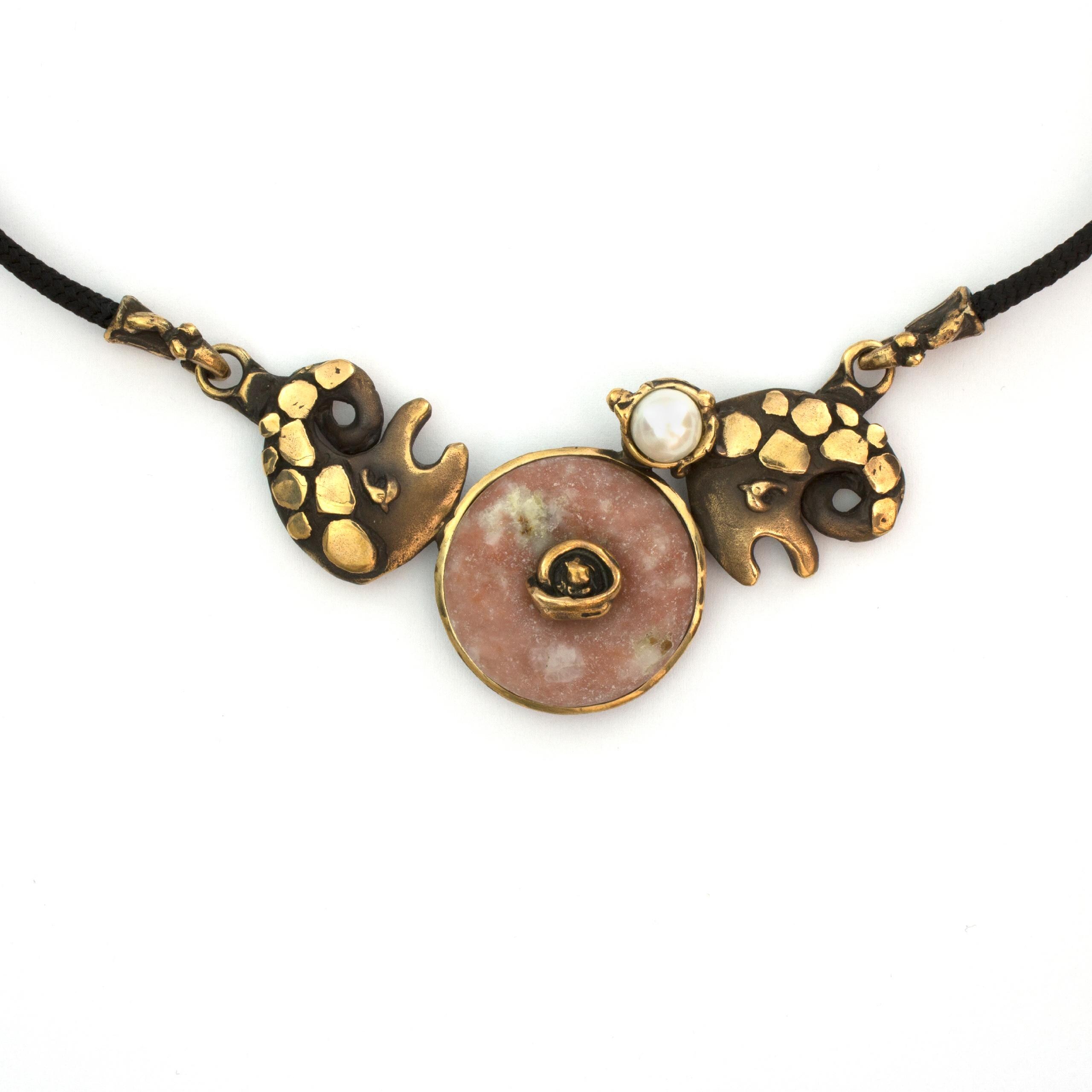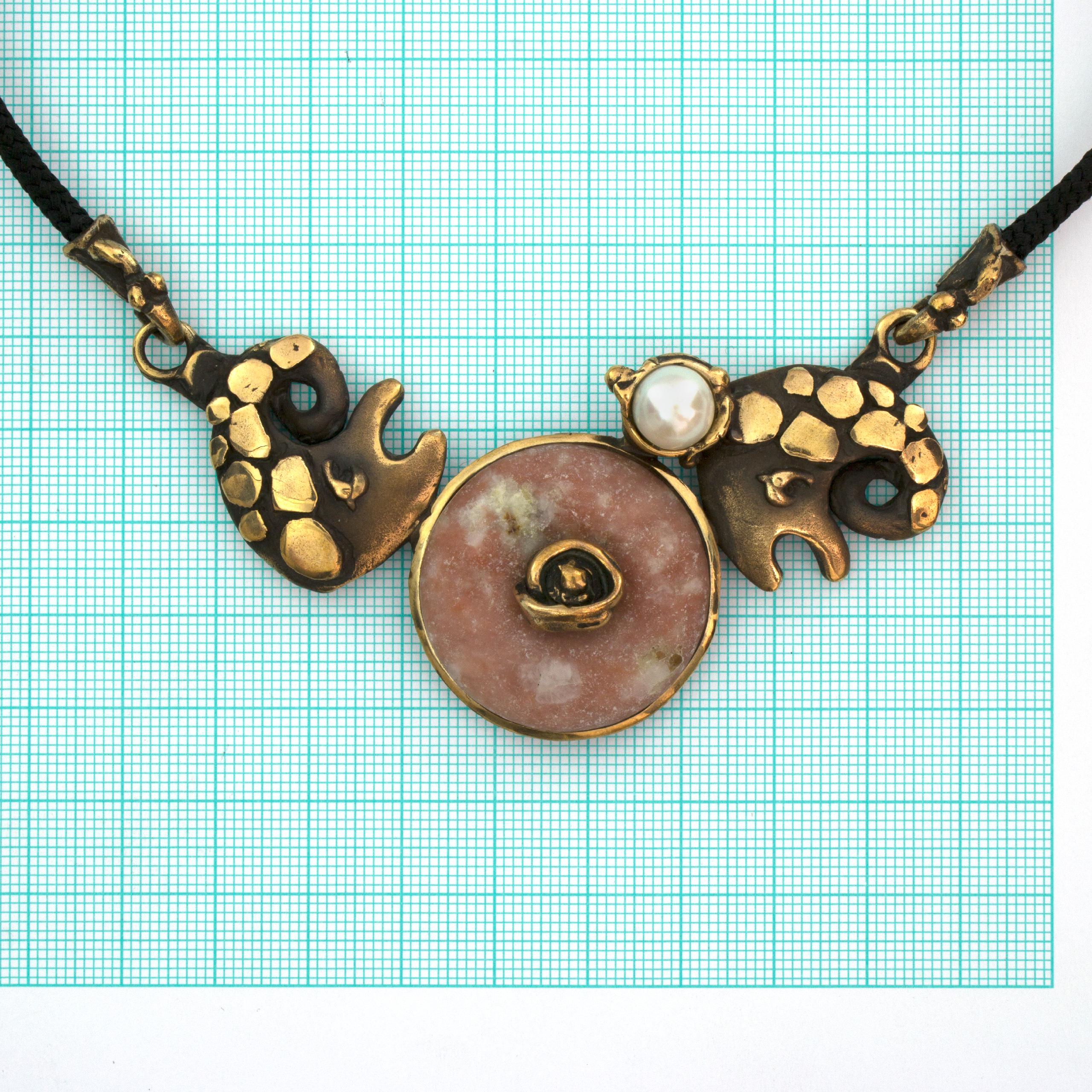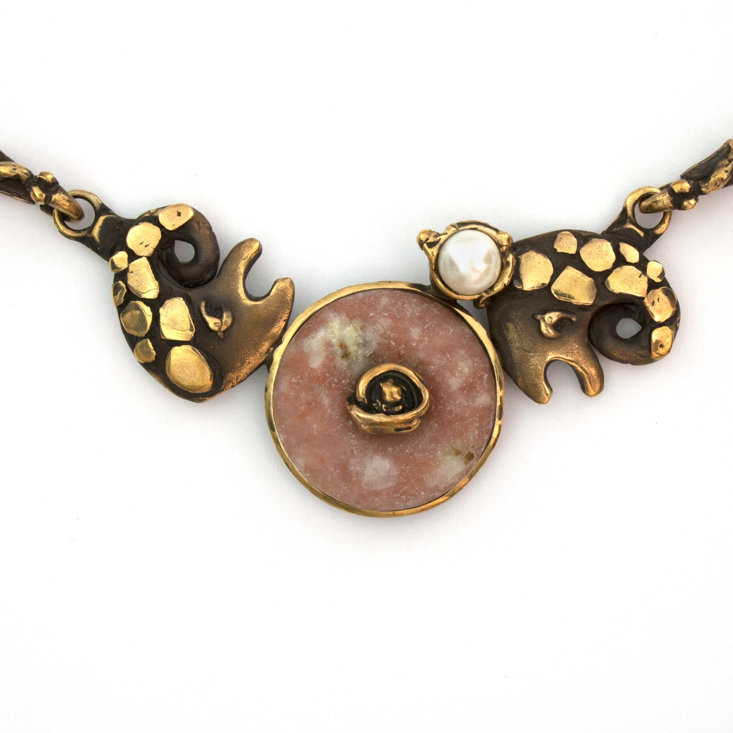 Bronze necklace with rhodonite and pearl by Czech sculptor and jewelry artist Vojtěška Vlčková. A unique handcrafted piece created using the traditional lost-wax casting technique. The combination of warm bronze tones and natural stones gives this necklace an elegant, timeless expression. A remarkable item of wearable art and a meaningful collectible.