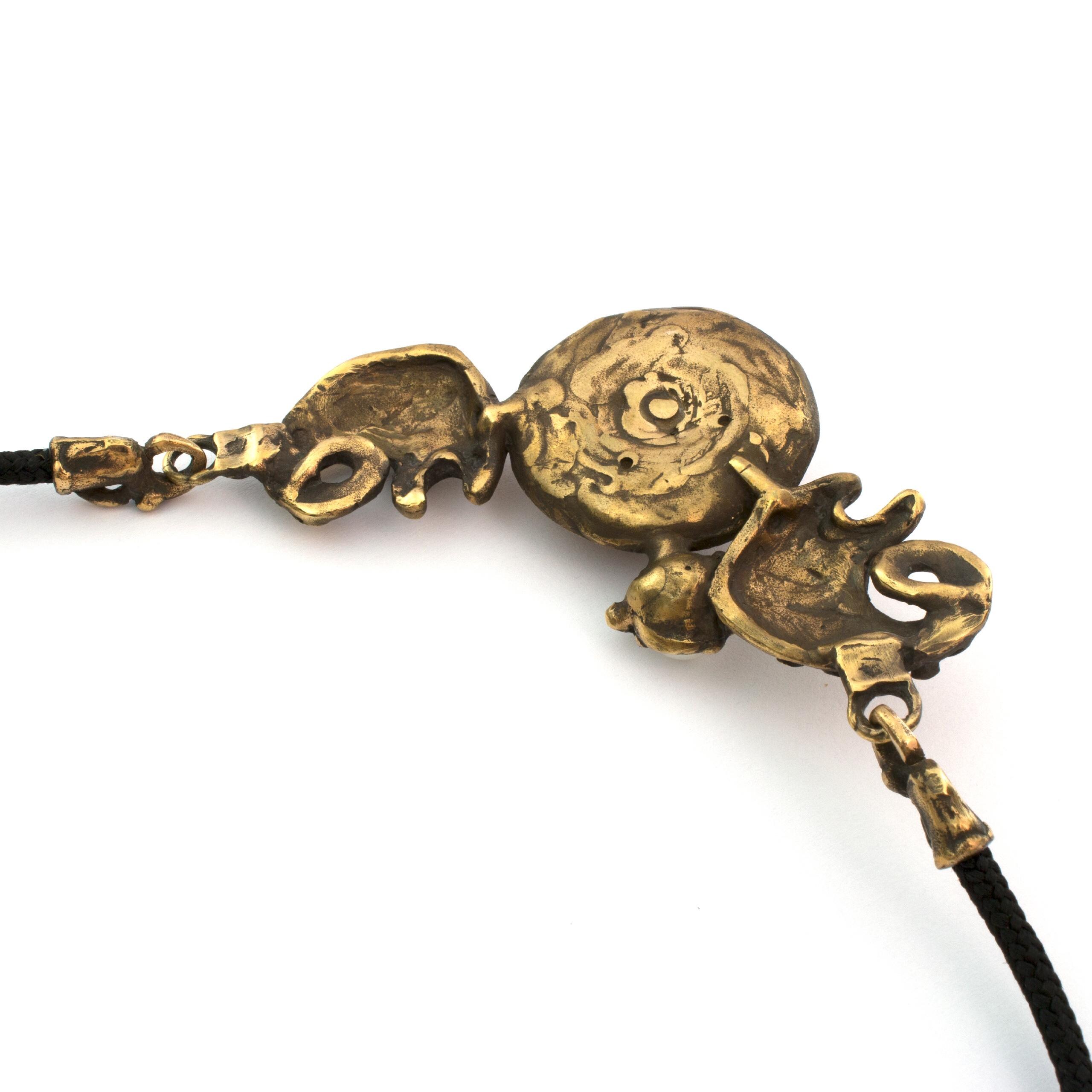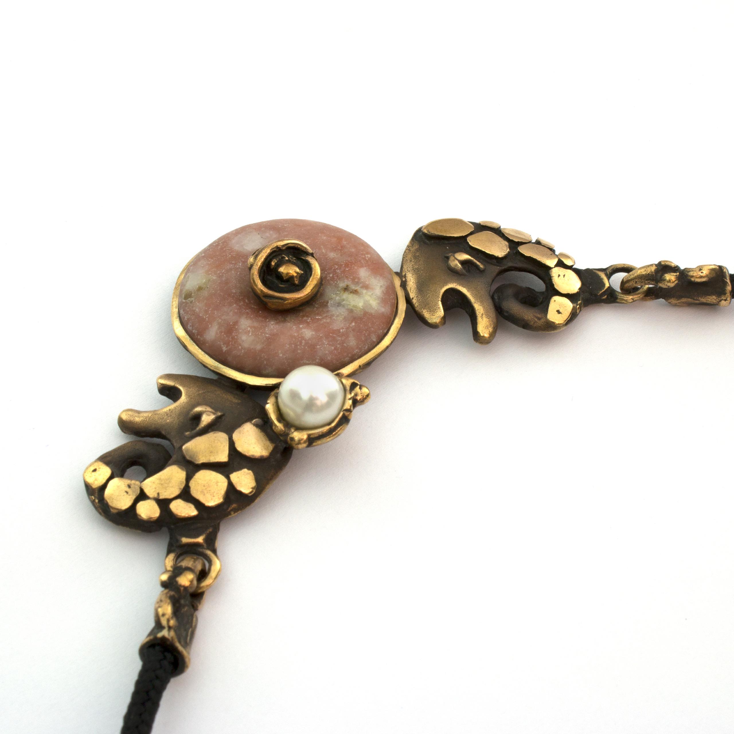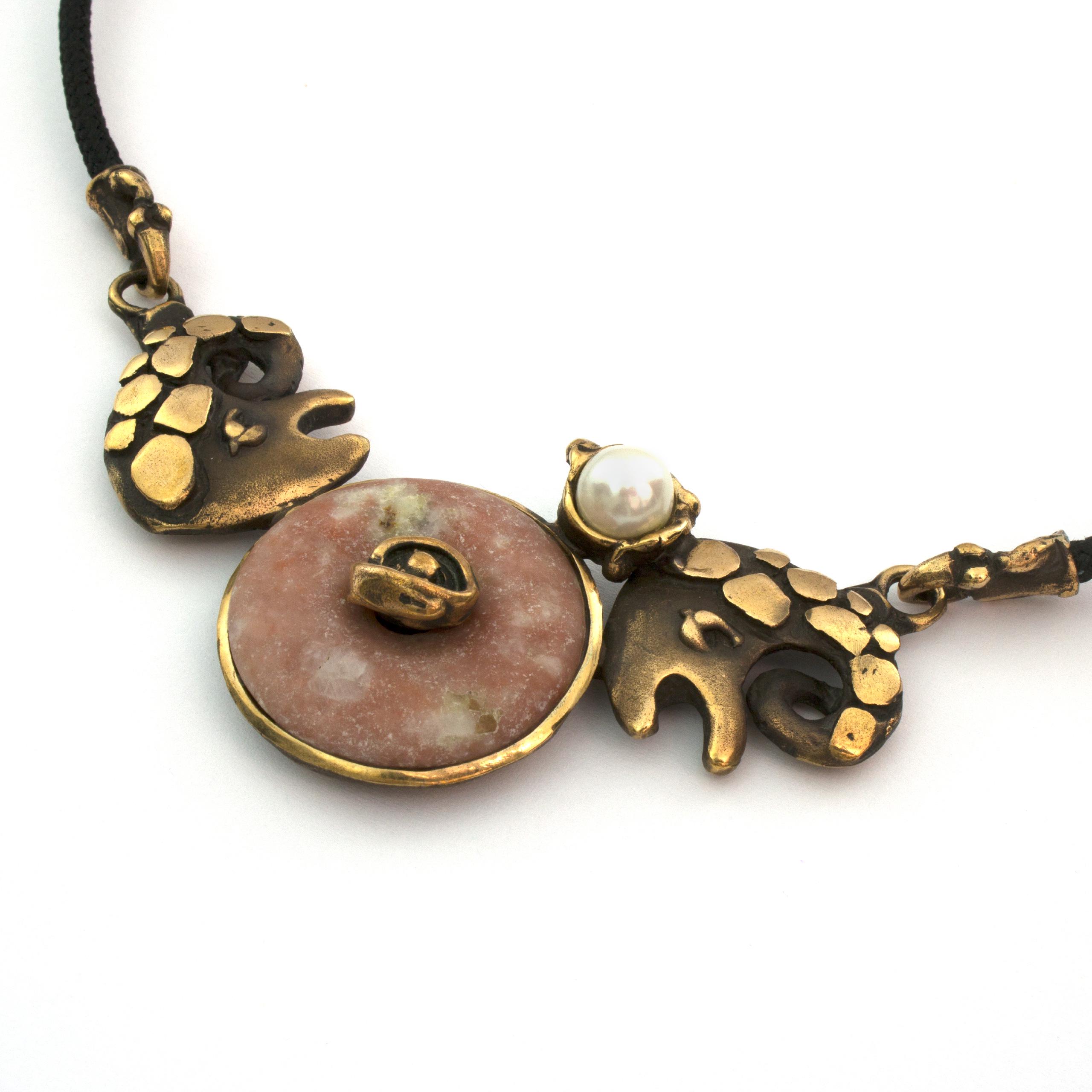 Bronze necklace with rhodonite and pearl by Czech sculptor and jewelry artist Vojtěška Vlčková. A unique handcrafted piece created using the traditional lost-wax casting technique. The combination of warm bronze tones and natural stones gives this necklace an elegant, timeless expression. A remarkable item of wearable art and a meaningful collectible.