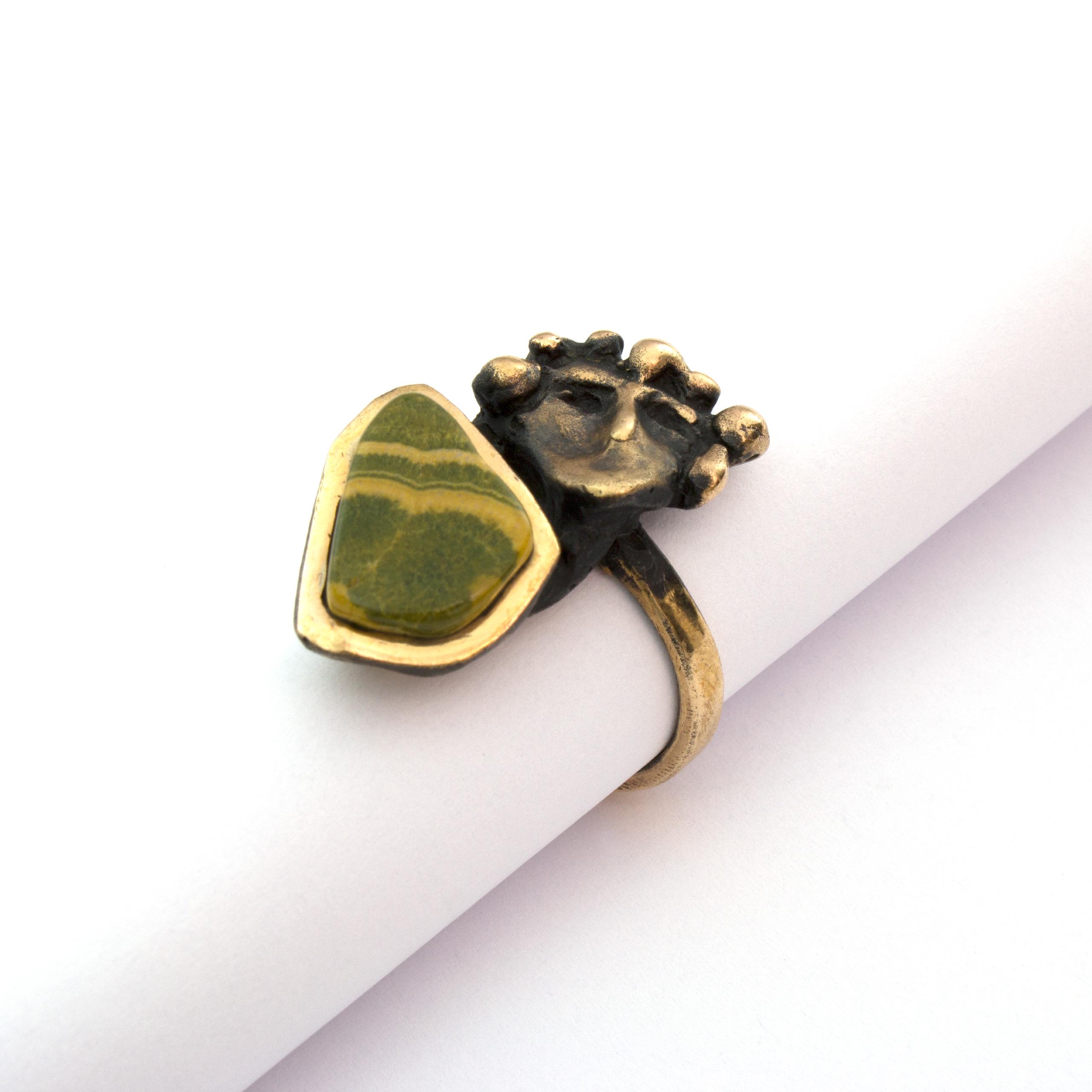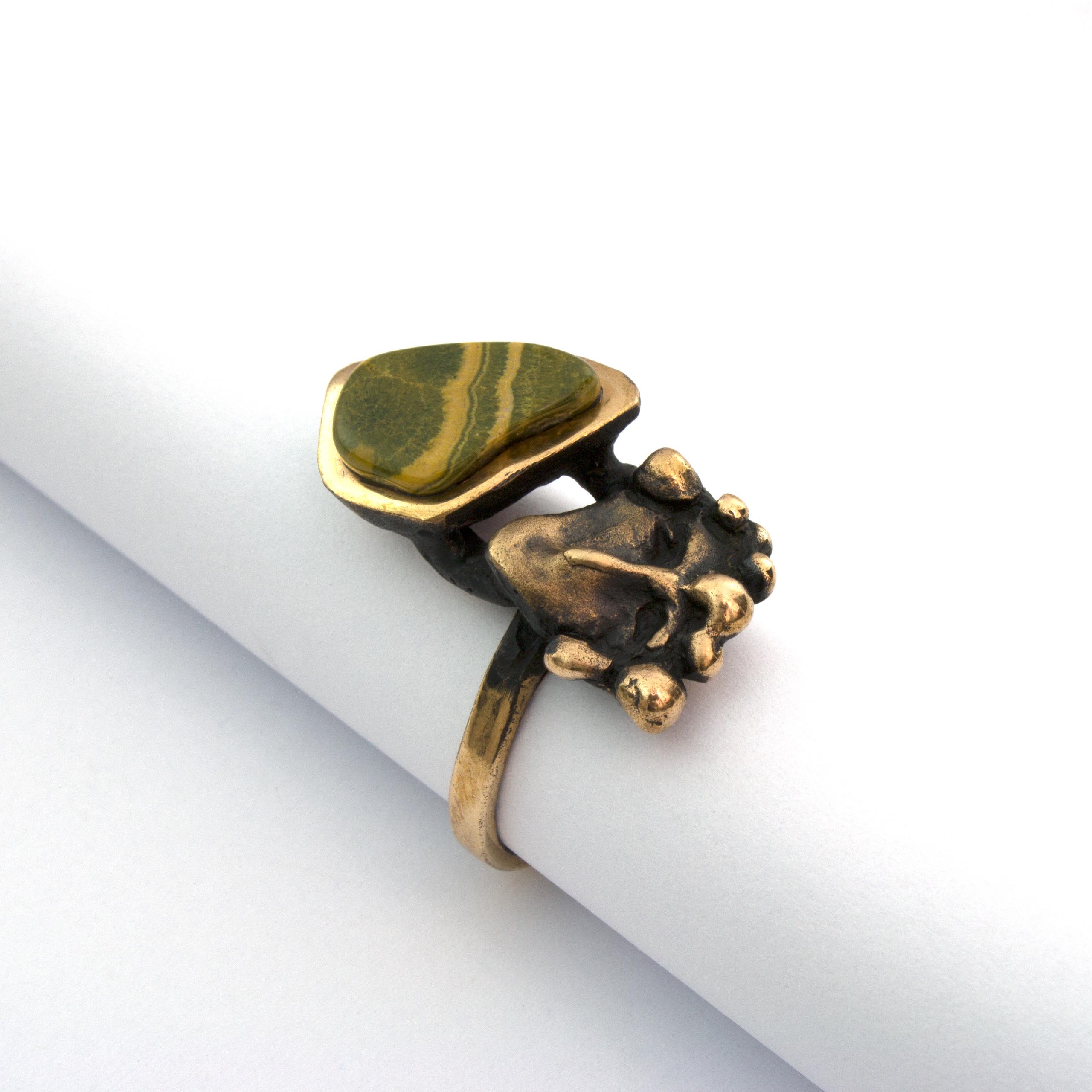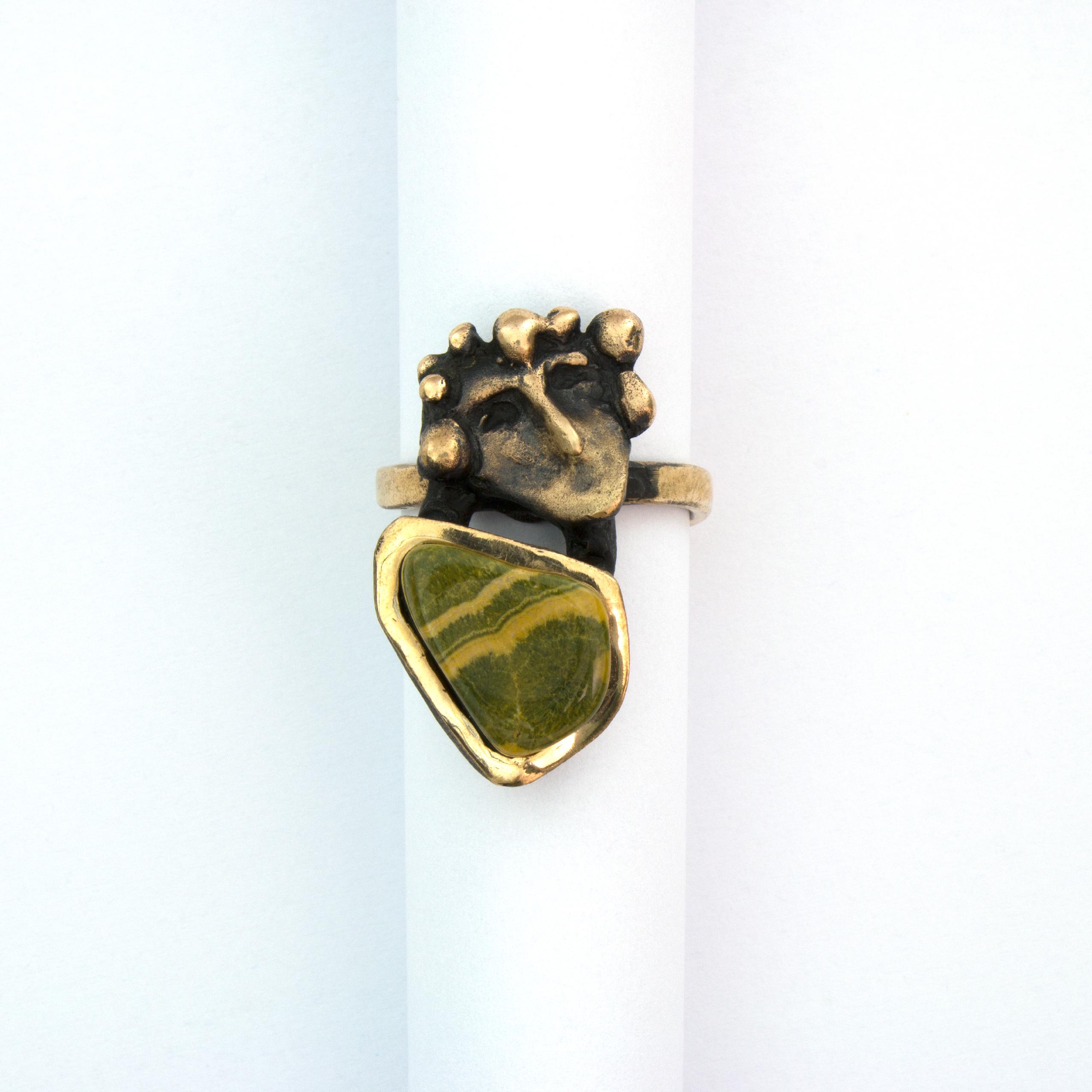 The Head with a Stone ring by Vojtěška Vlčková presents an exceptional combination of bronze sculpture with natural jasper. This exclusive jewelry piece stands out with its sculptural approach and precise craftsmanship. The fusion of metal and natural stone creates an impressive artistic whole.