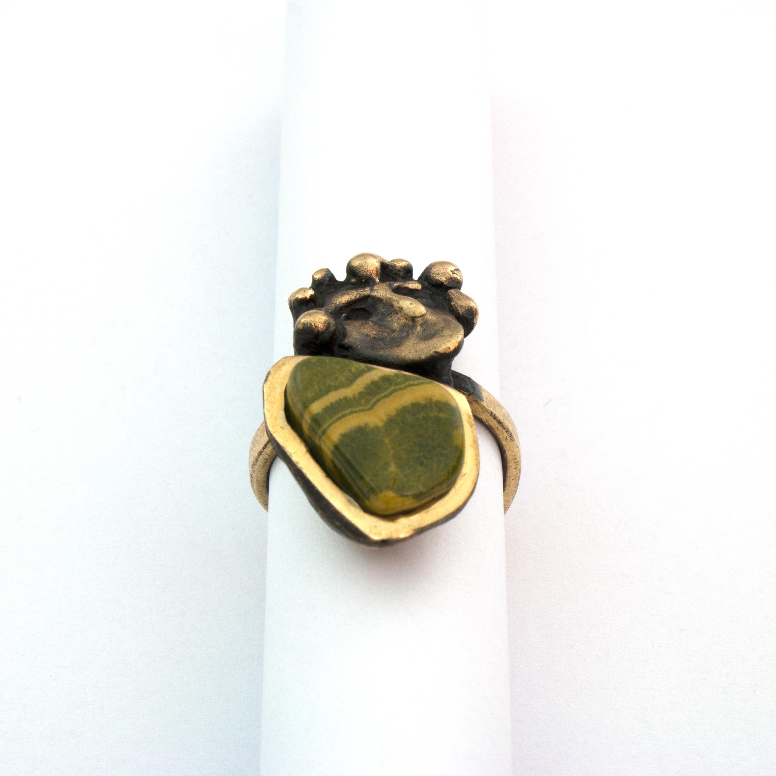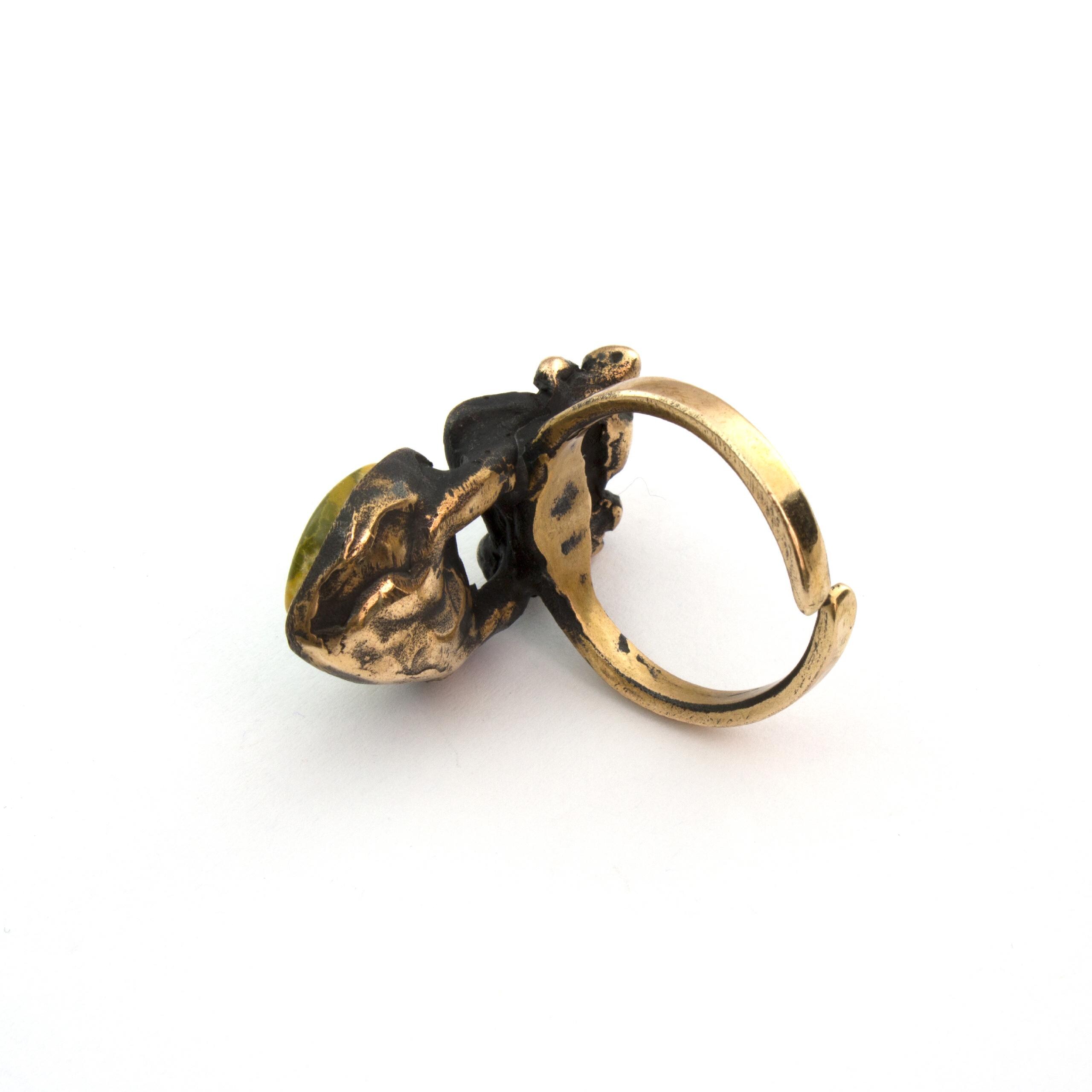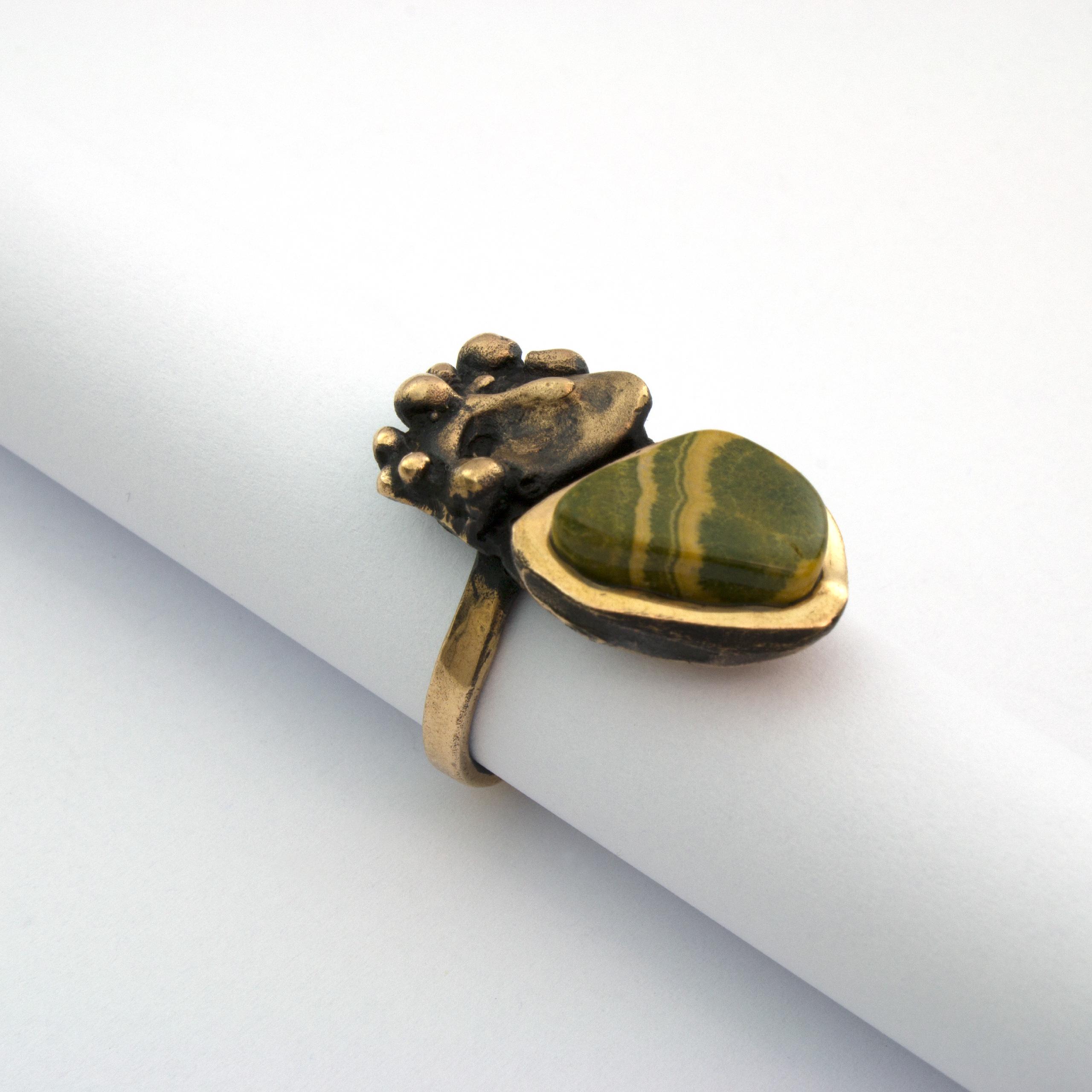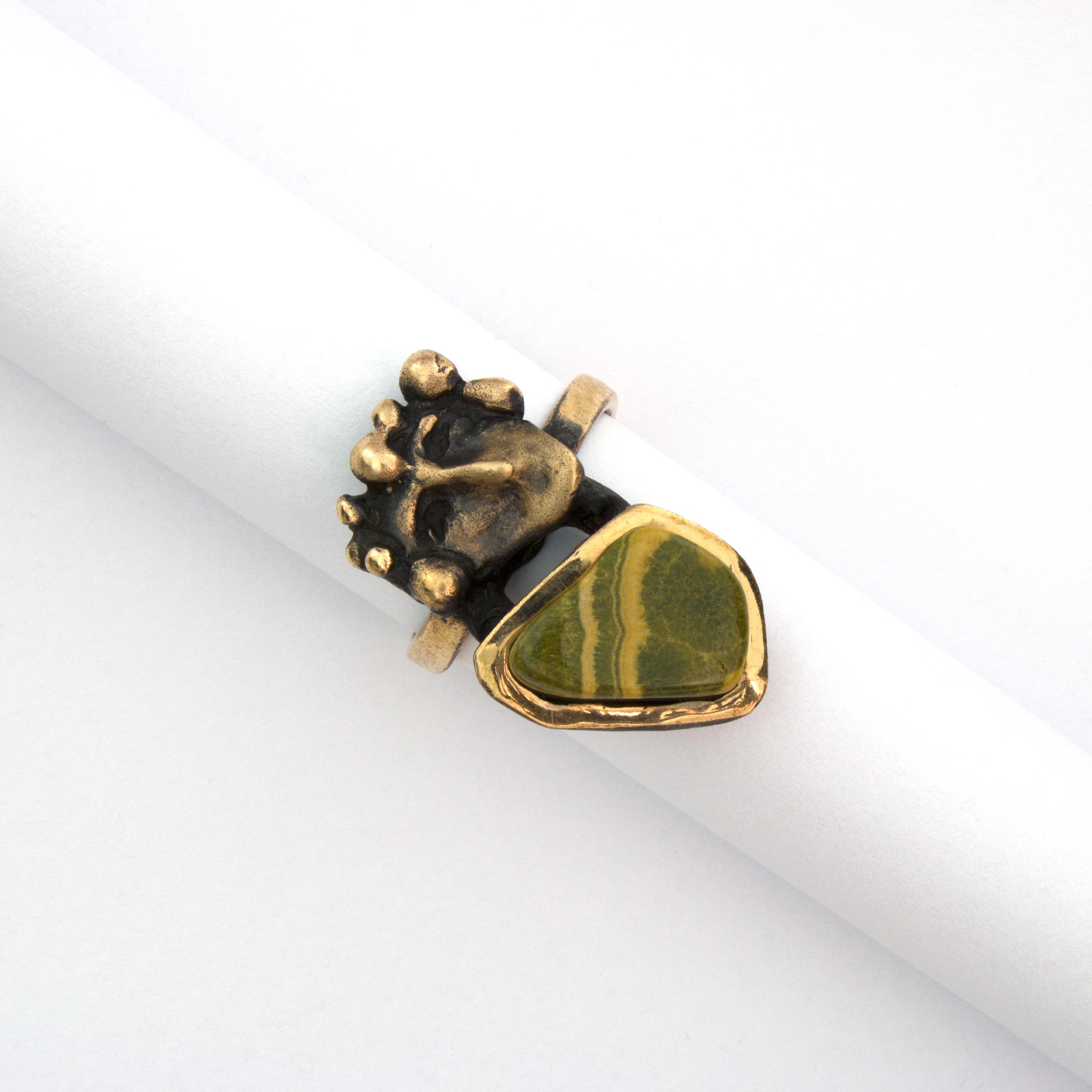 The Head with a Stone ring by Vojtěška Vlčková presents an exceptional combination of bronze sculpture with natural jasper. This exclusive jewelry piece stands out with its sculptural approach and precise craftsmanship. The fusion of metal and natural stone creates an impressive artistic whole.