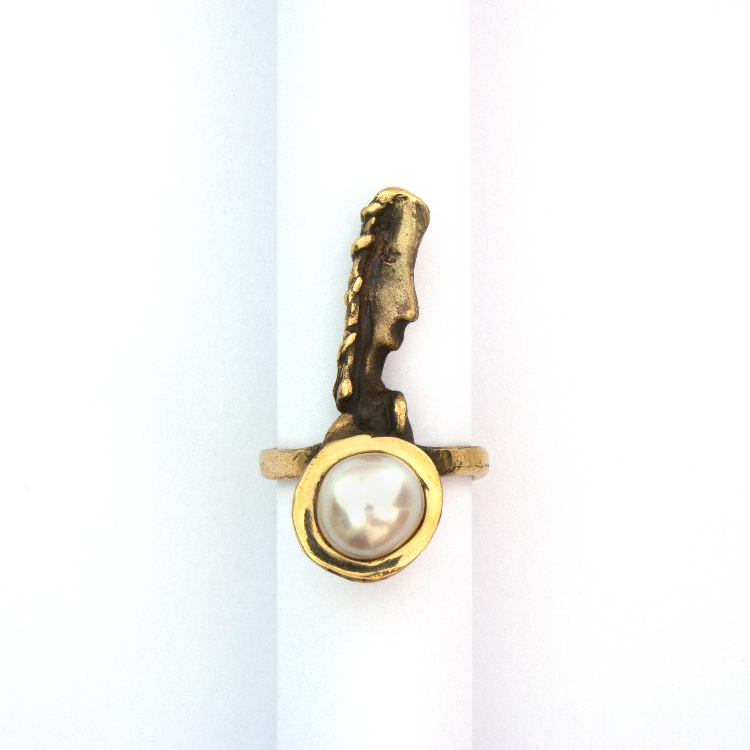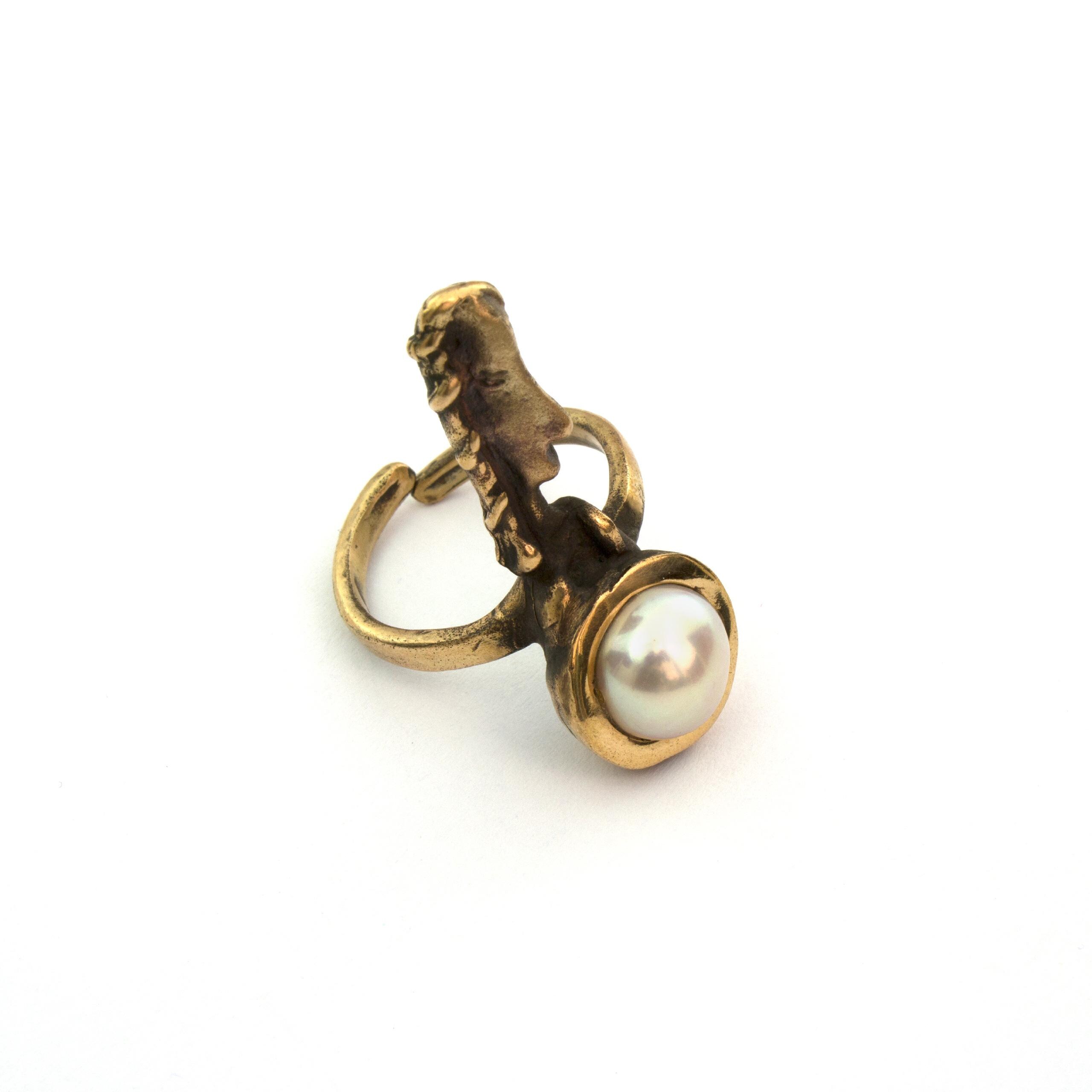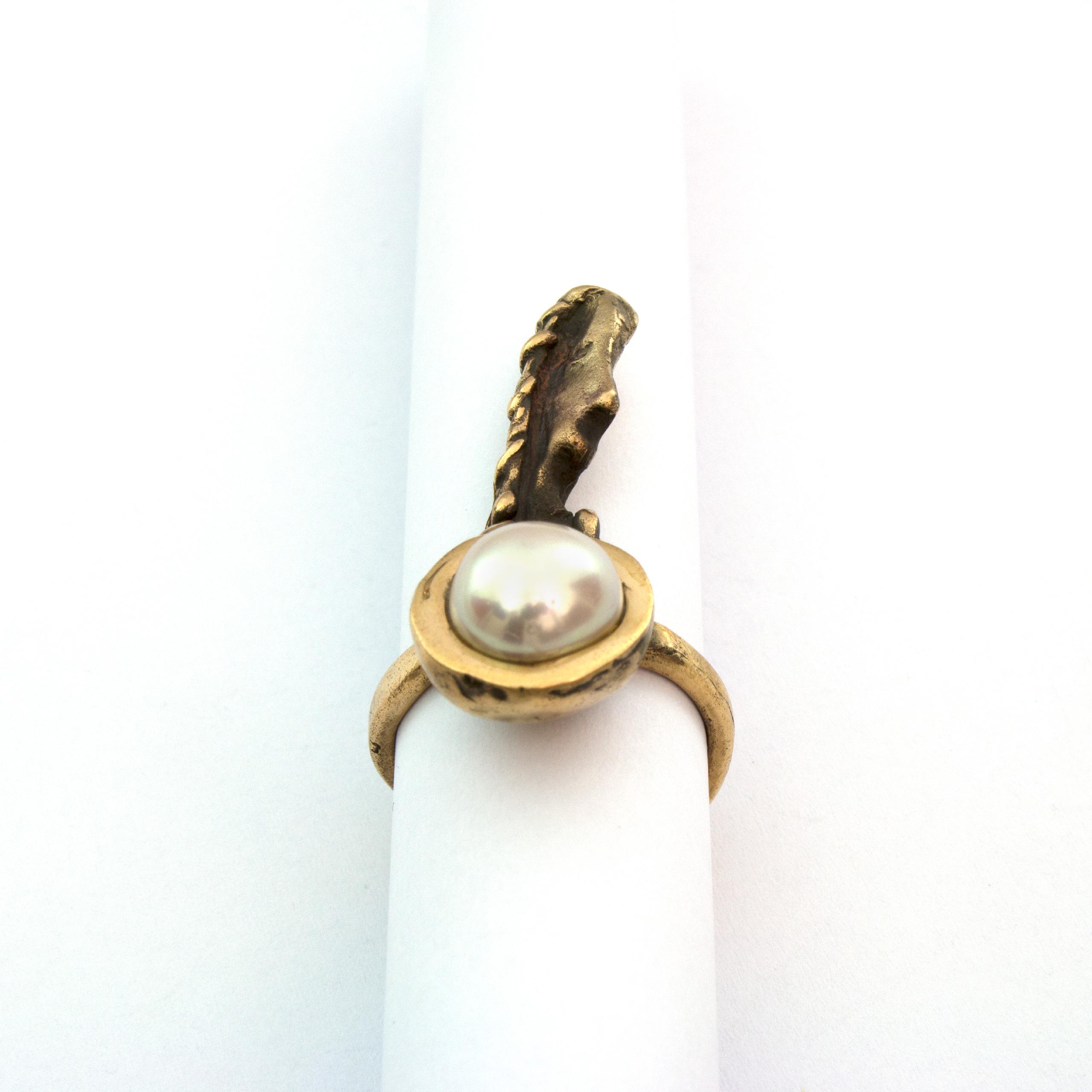 Bronze ring with pearl by Czech sculptor and jewellery artist Vojtěška Vlčková. Crafted using the traditional lost-wax casting technique, this elegant bronze artwork unites the strength of metal with the softness of a natural pearl. A timeless and sophisticated creation.