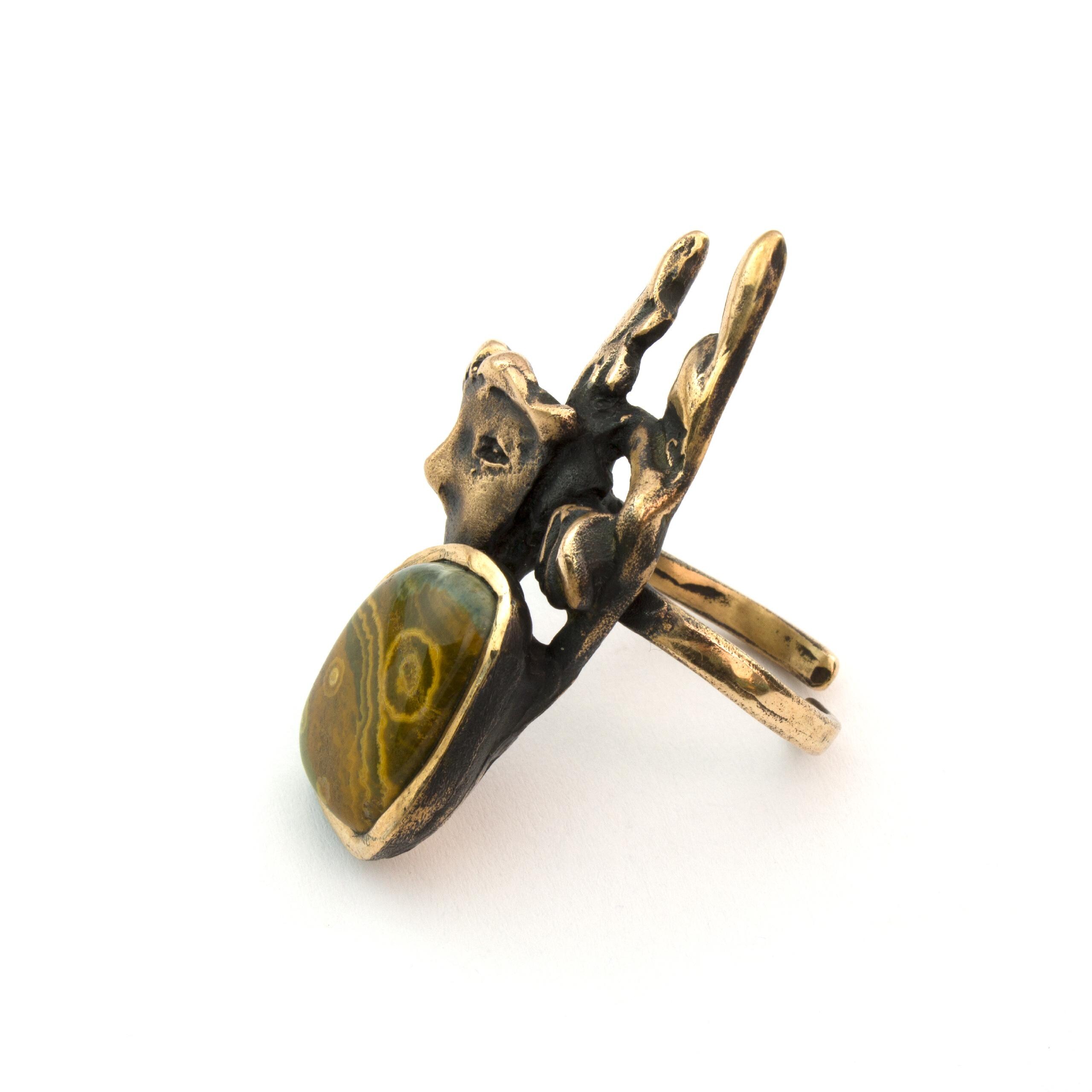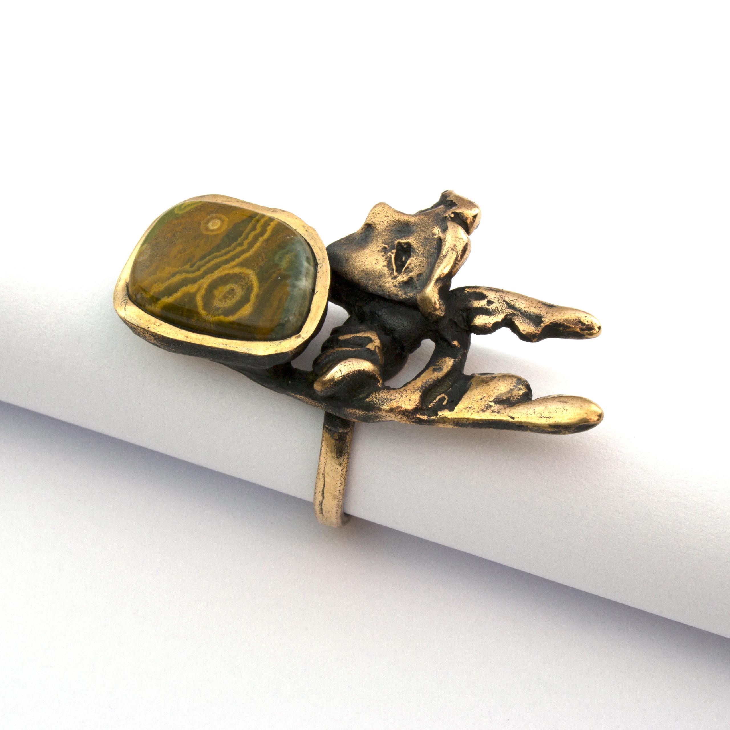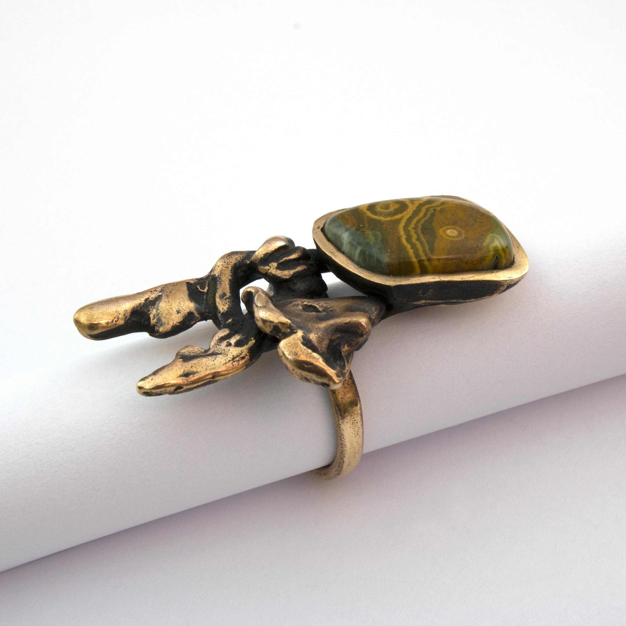 Bronze ring with jasper by Czech sculptor and jewellery artist Vojtěška Vlčková. Created using the traditional lost-wax casting technique, this handcrafted bronze artwork unites refined metal with the natural beauty of stone. A distinctive and timeless original piece.