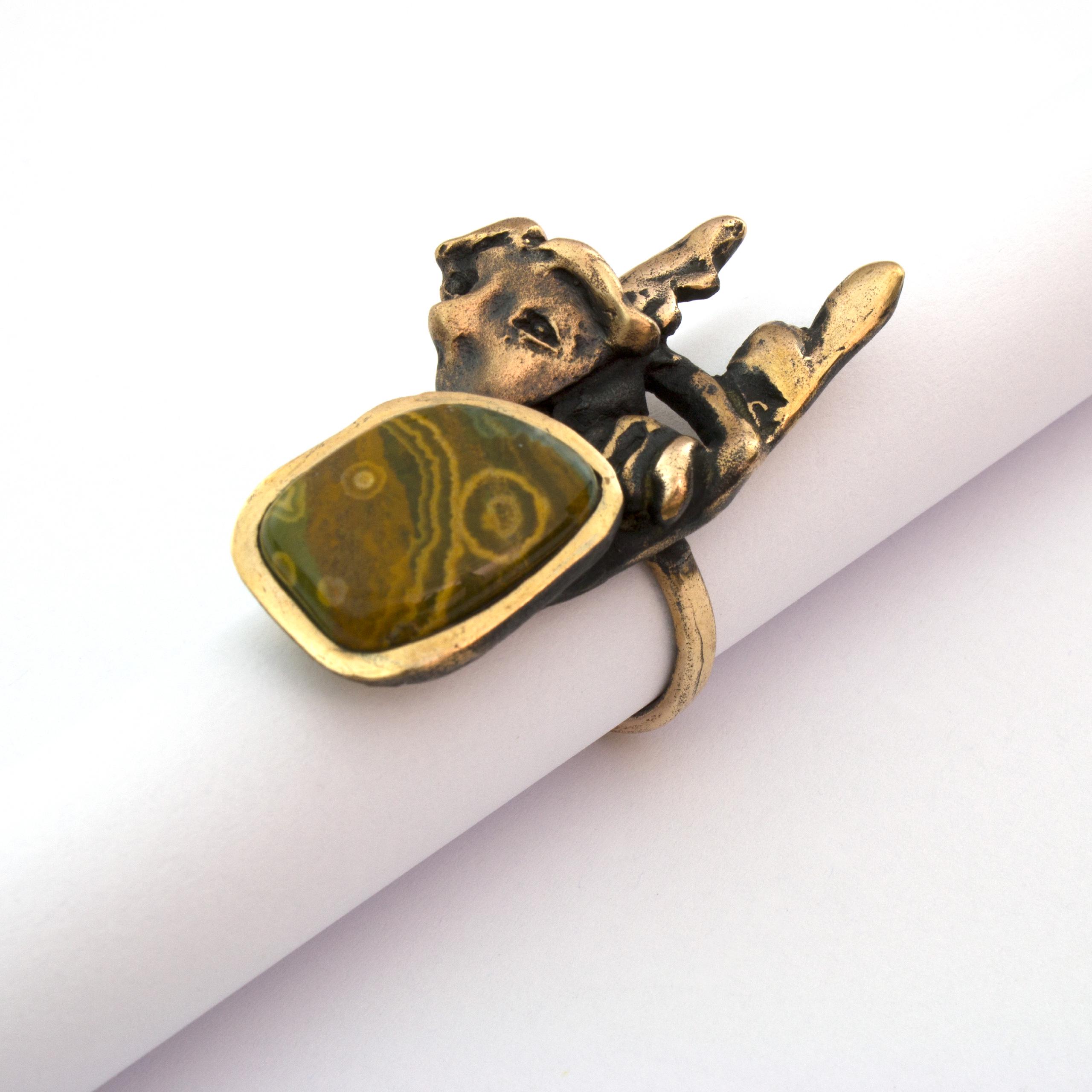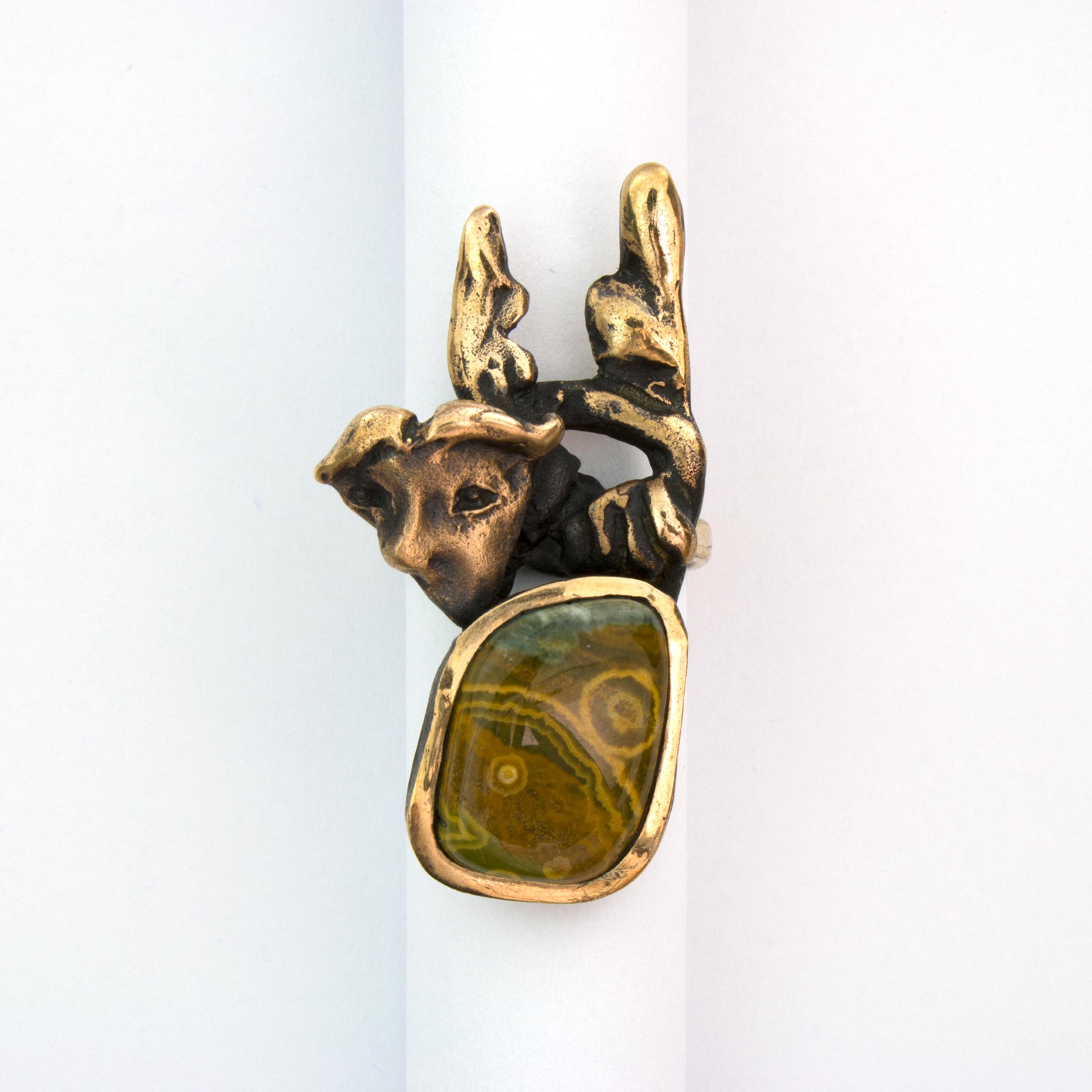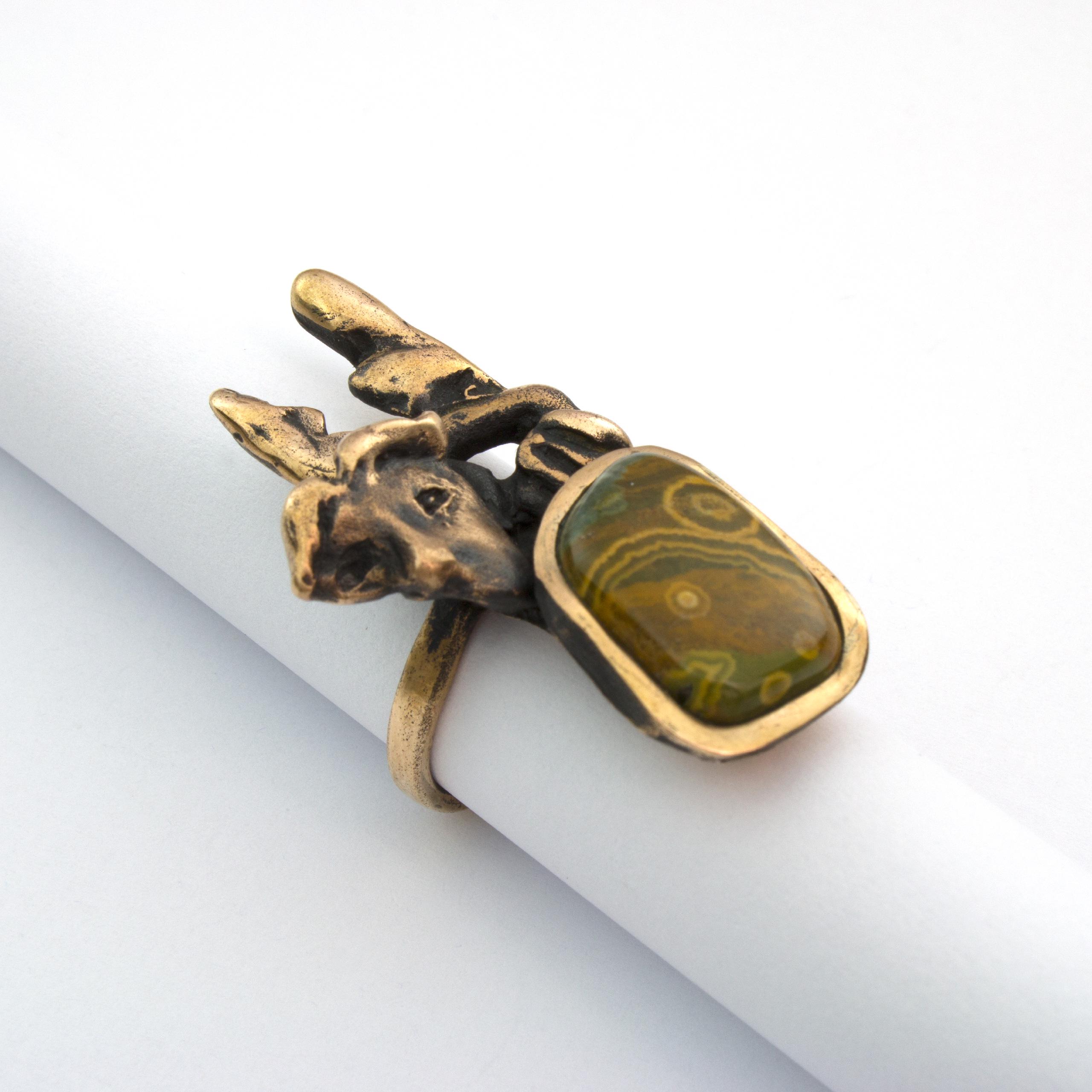 Bronze ring with jasper by Czech sculptor and jewellery artist Vojtěška Vlčková. Created using the traditional lost-wax casting technique, this handcrafted bronze artwork unites refined metal with the natural beauty of stone. A distinctive and timeless original piece.