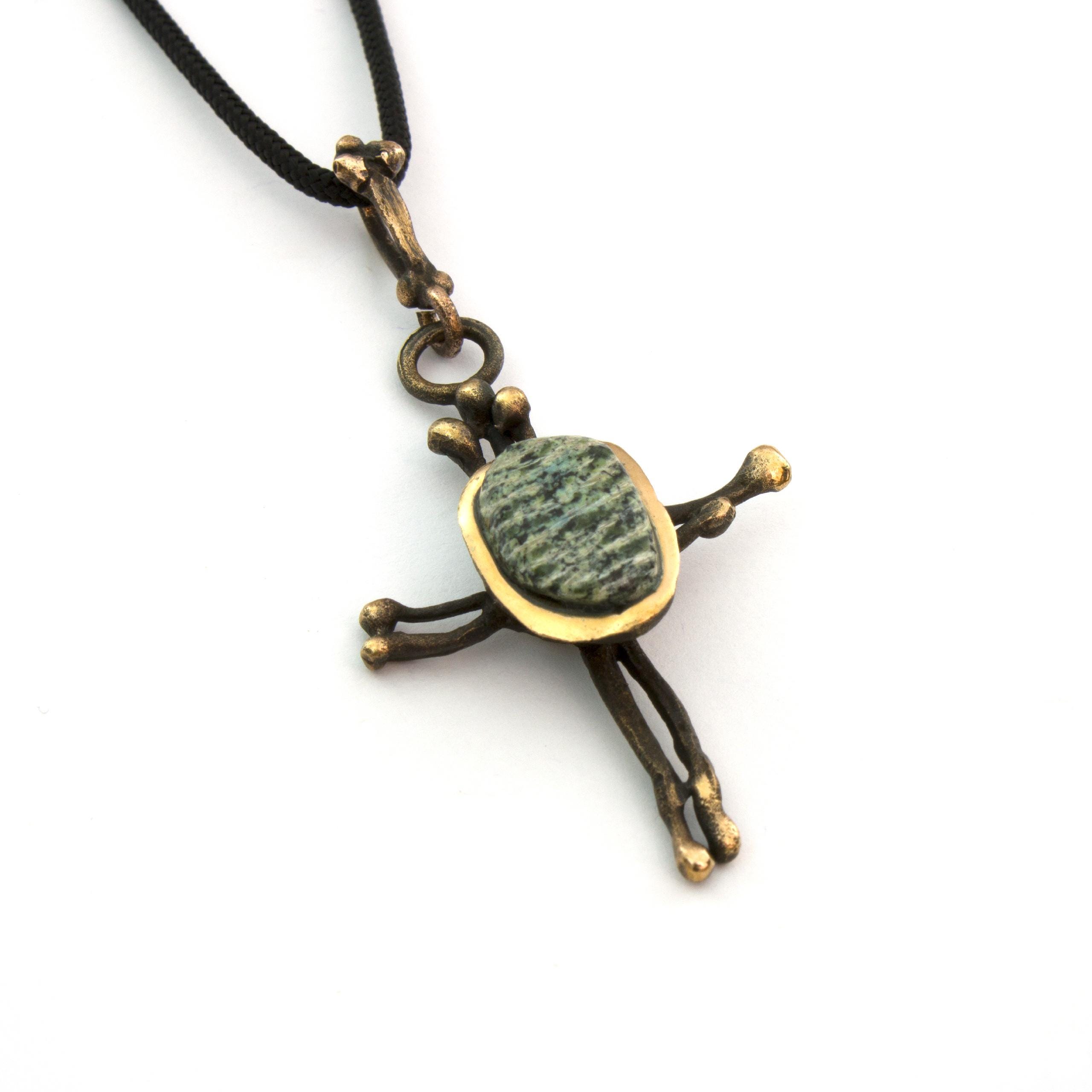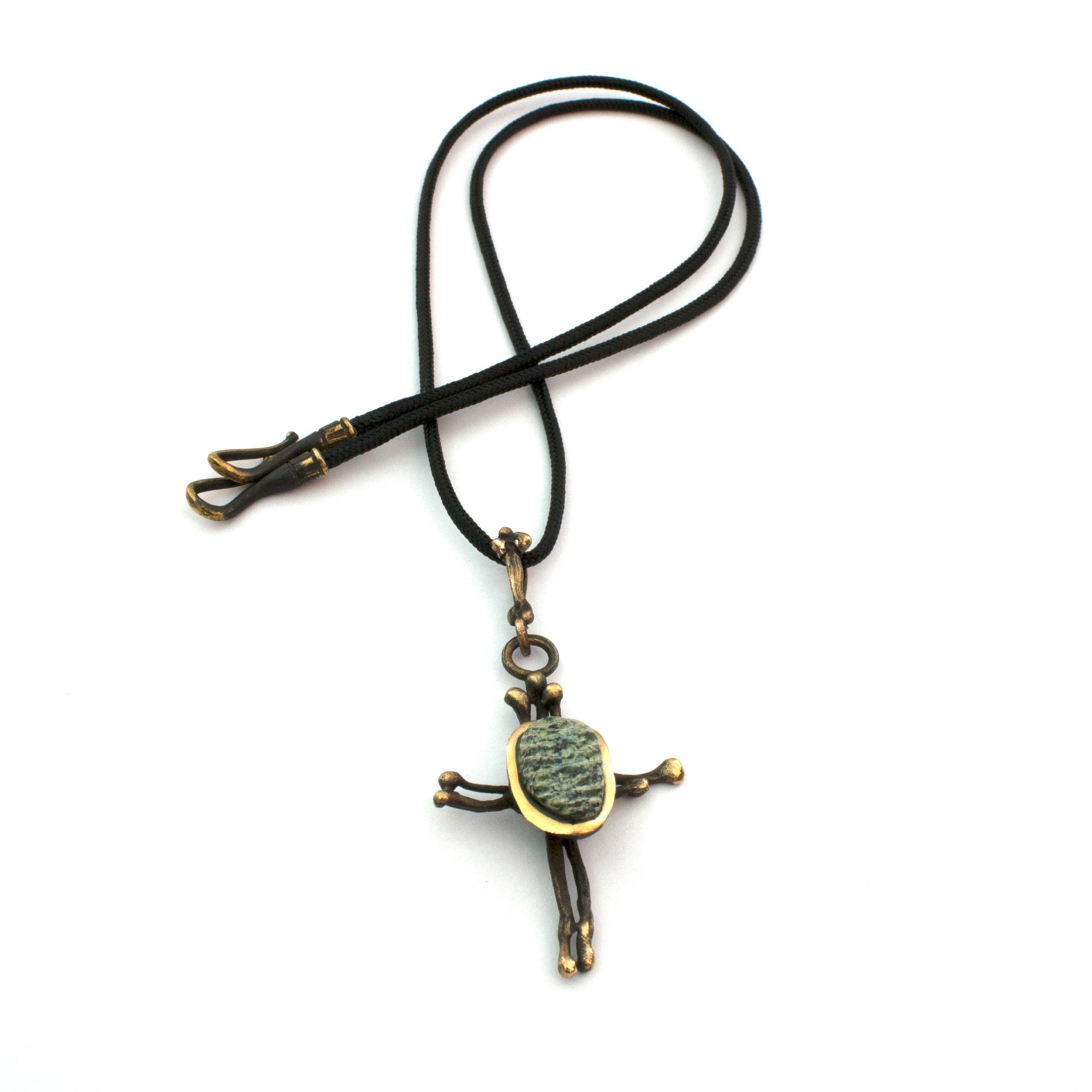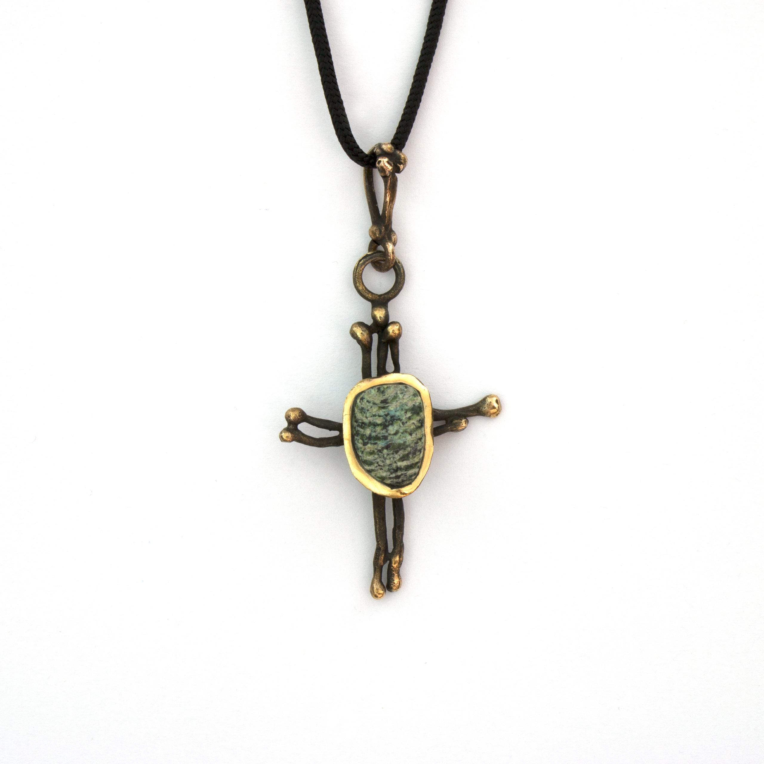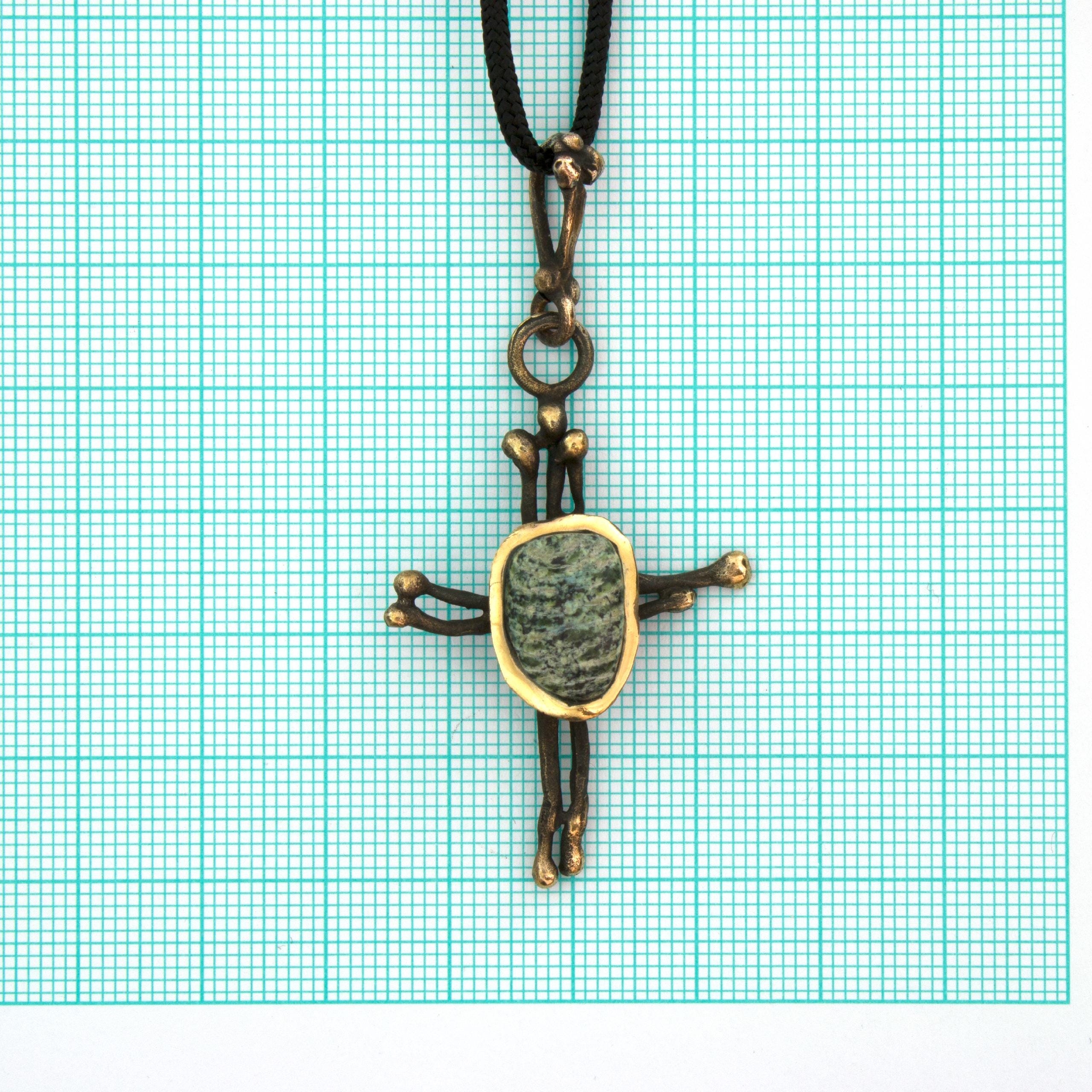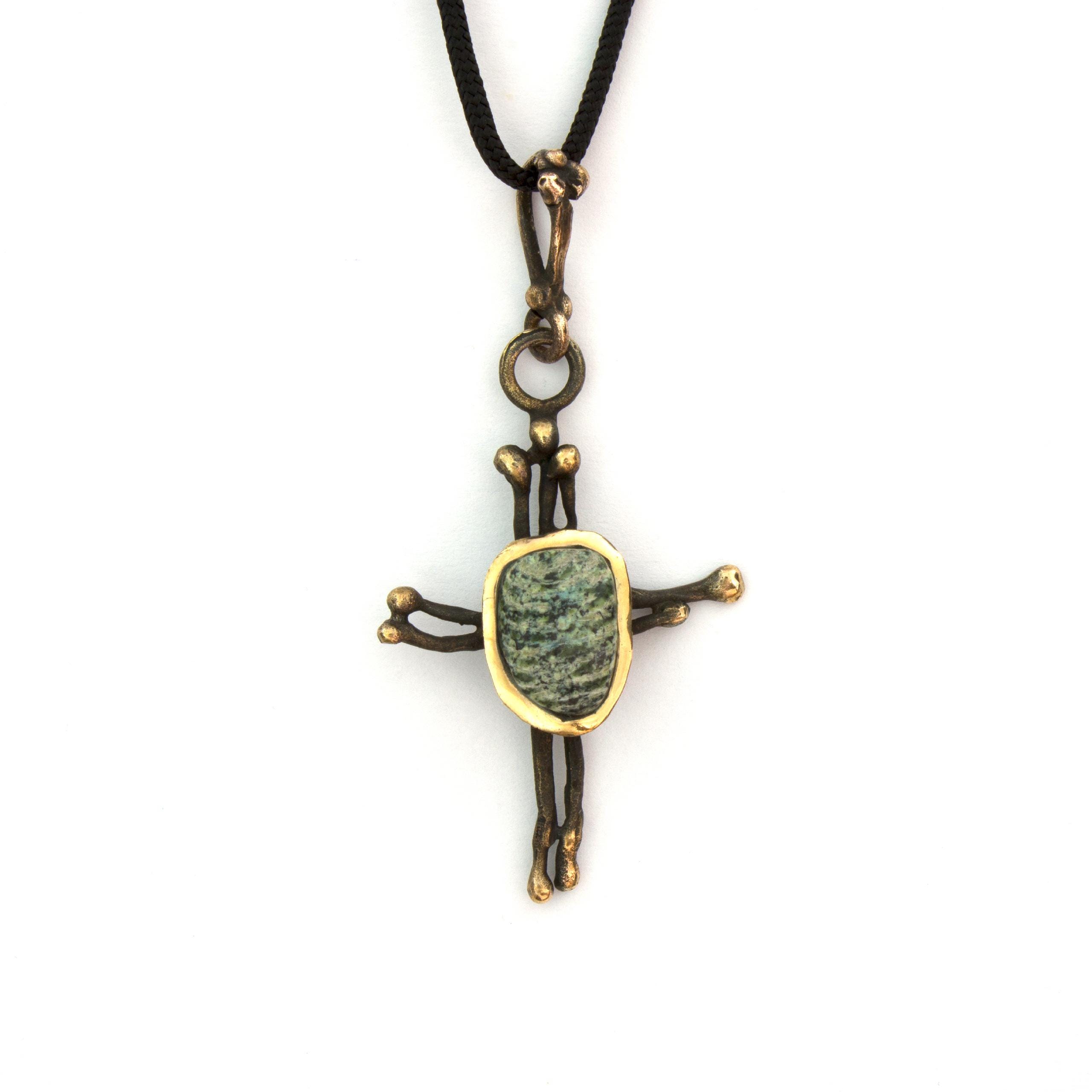Bronze pendant necklace with serpentine by Czech sculptor and jewellery artist Vojtěška Vlčková. The handcrafted cross was created using the traditional lost-wax casting technique and features a subtle artistic balance and refined detailing. A timeless bronze jewel of symbolic beauty.