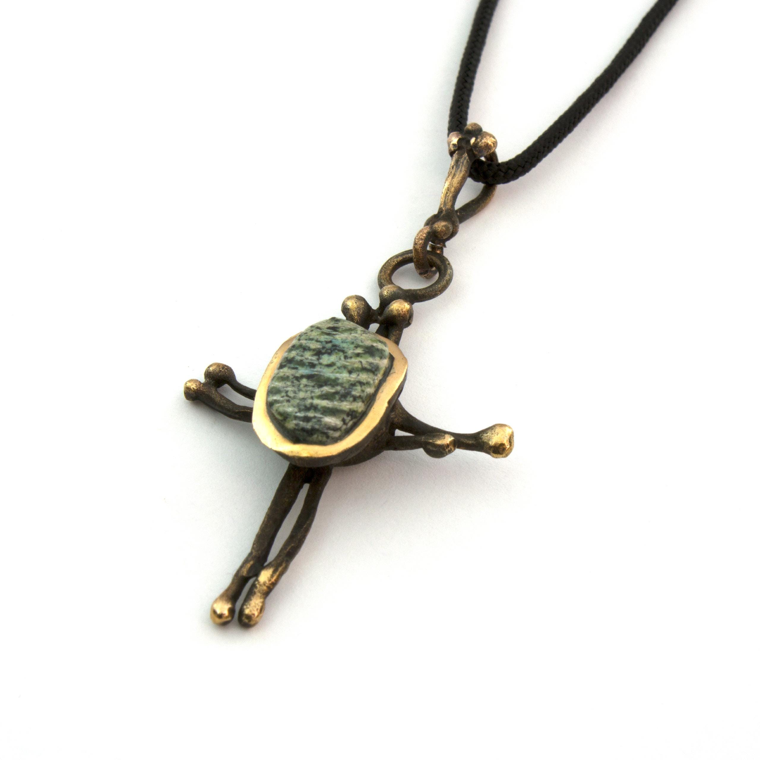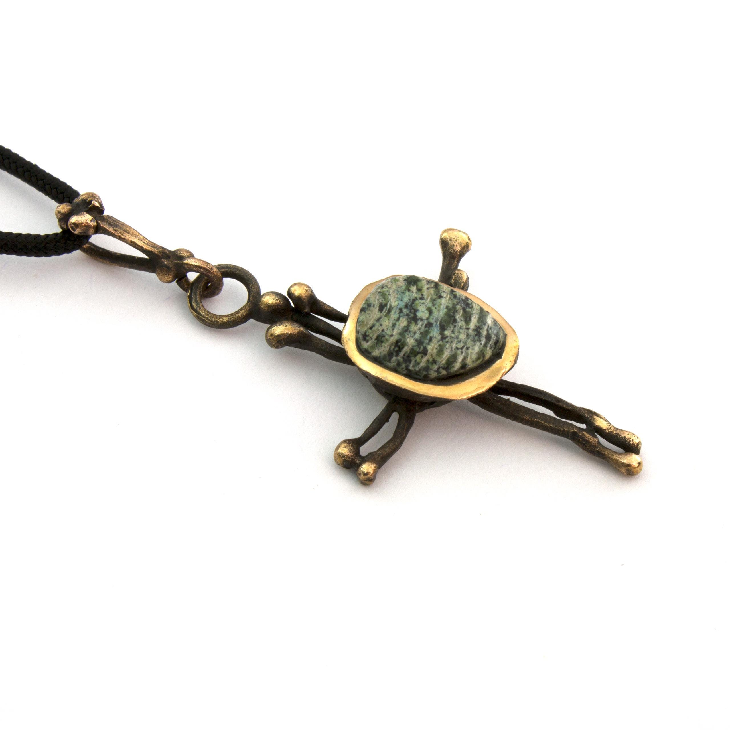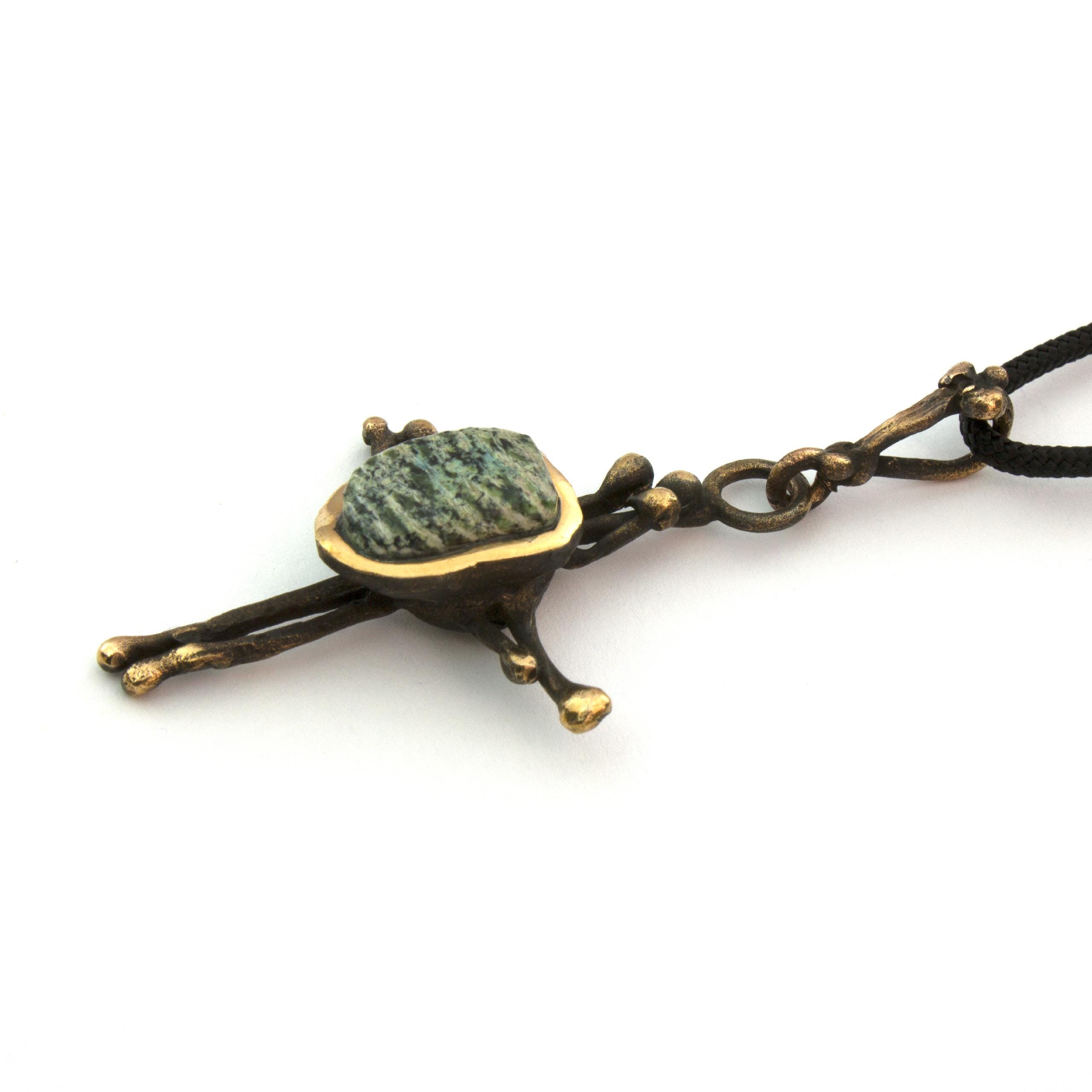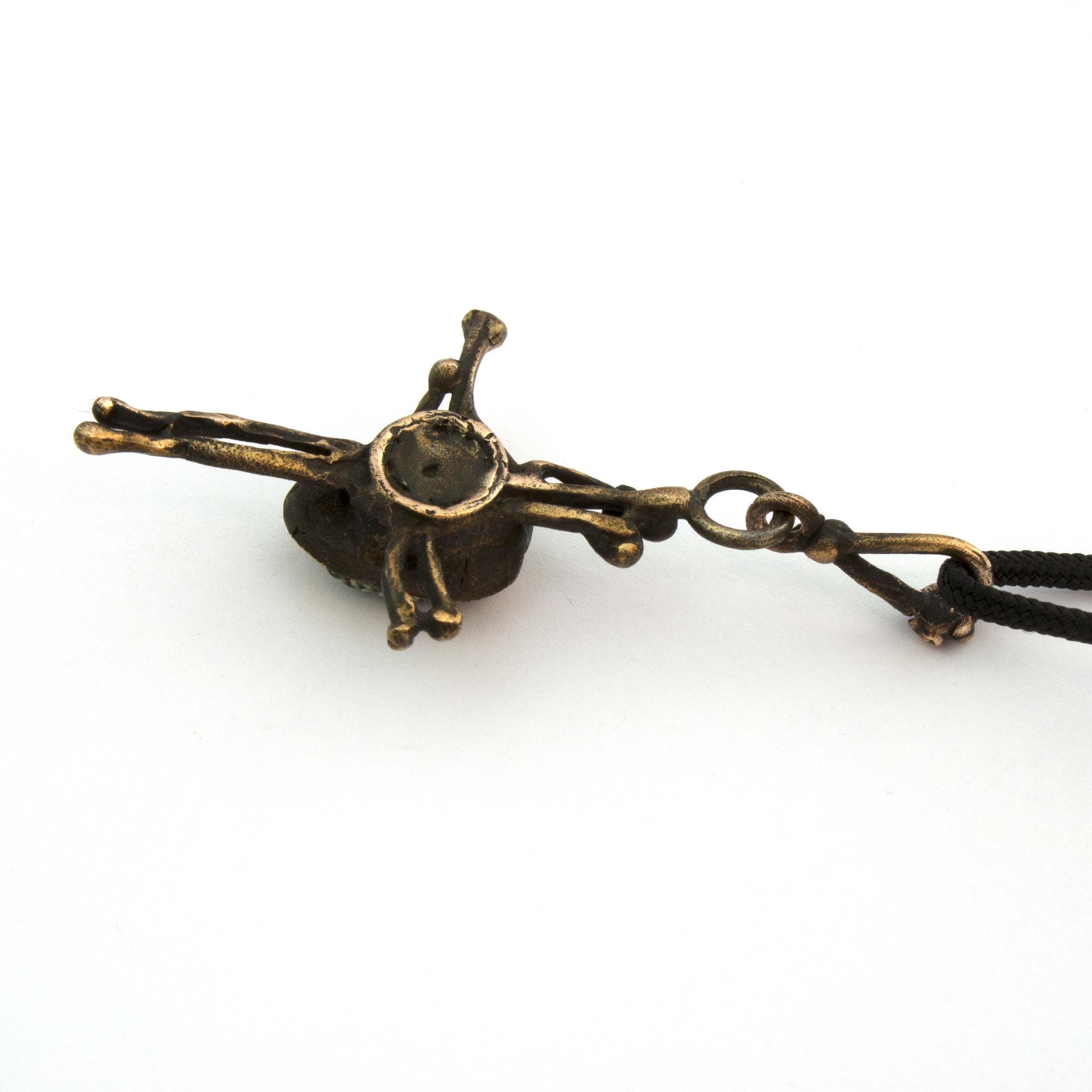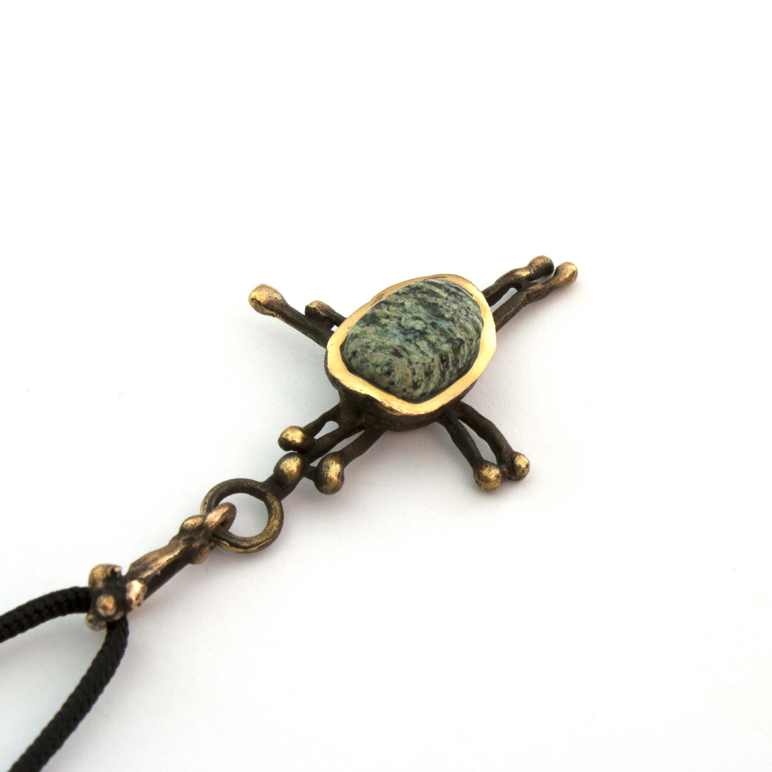 Bronze pendant necklace with serpentine by Czech sculptor and jewellery artist Vojtěška Vlčková. The handcrafted cross was created using the traditional lost-wax casting technique and features a subtle artistic balance and refined detailing. A timeless bronze jewel of symbolic beauty.