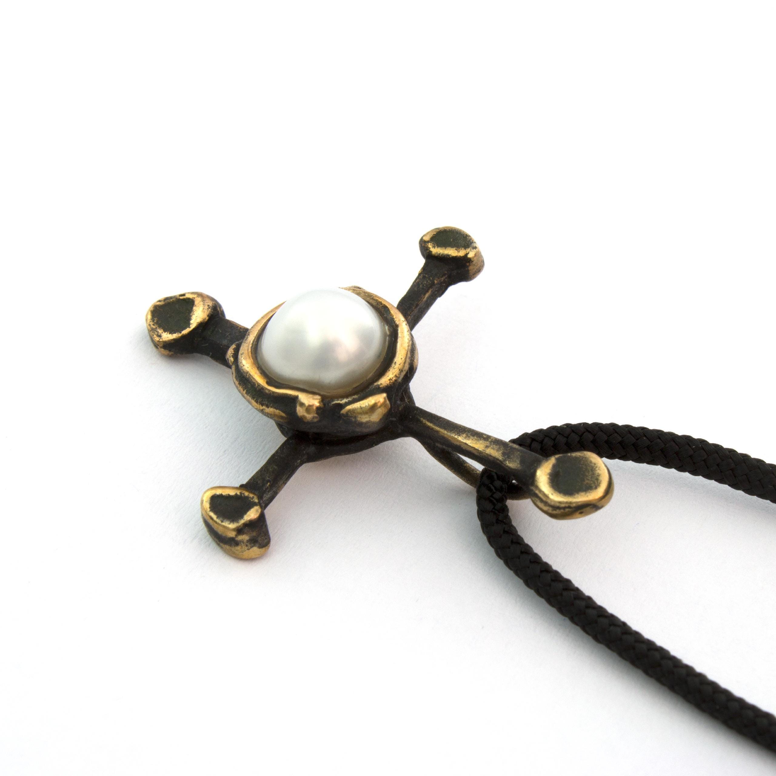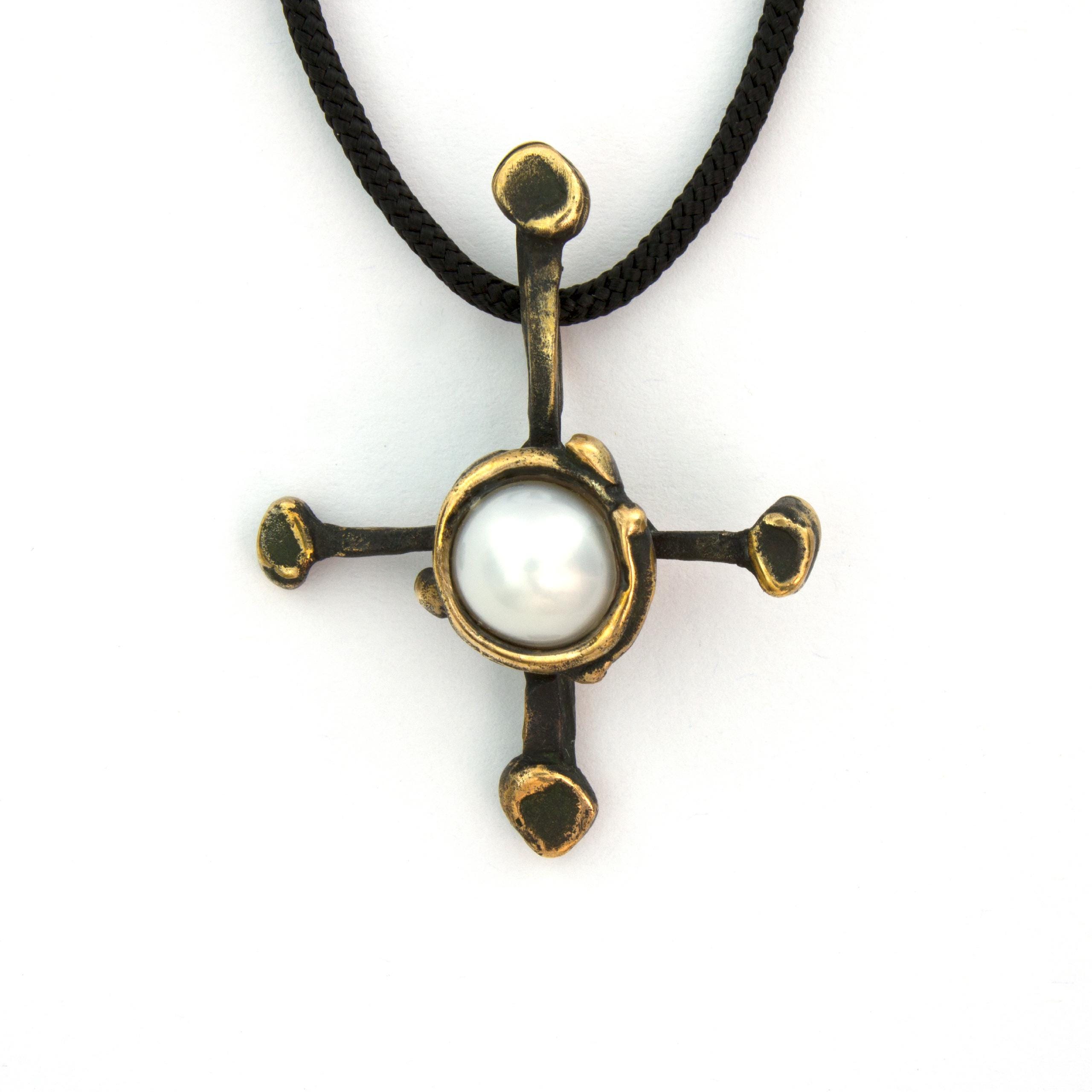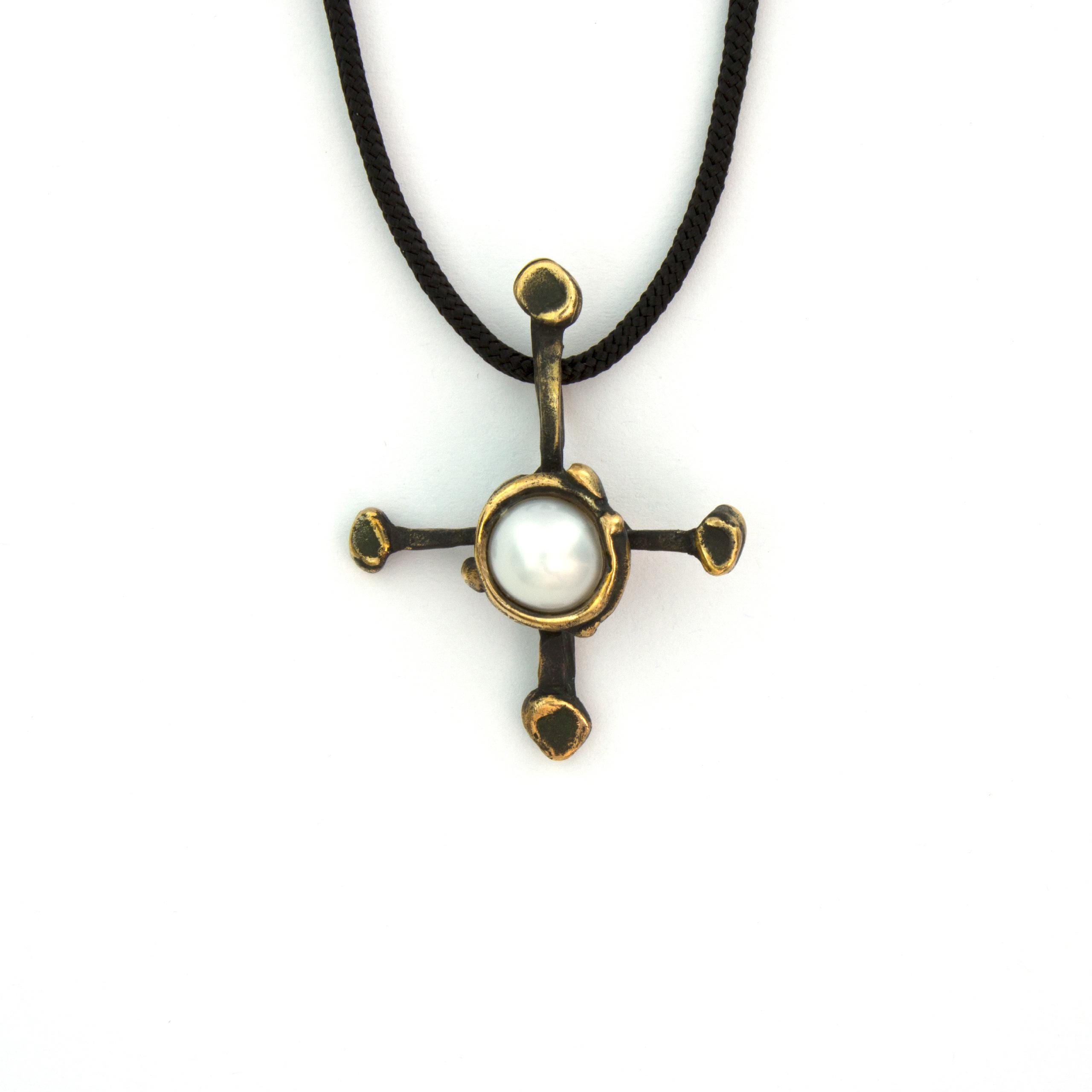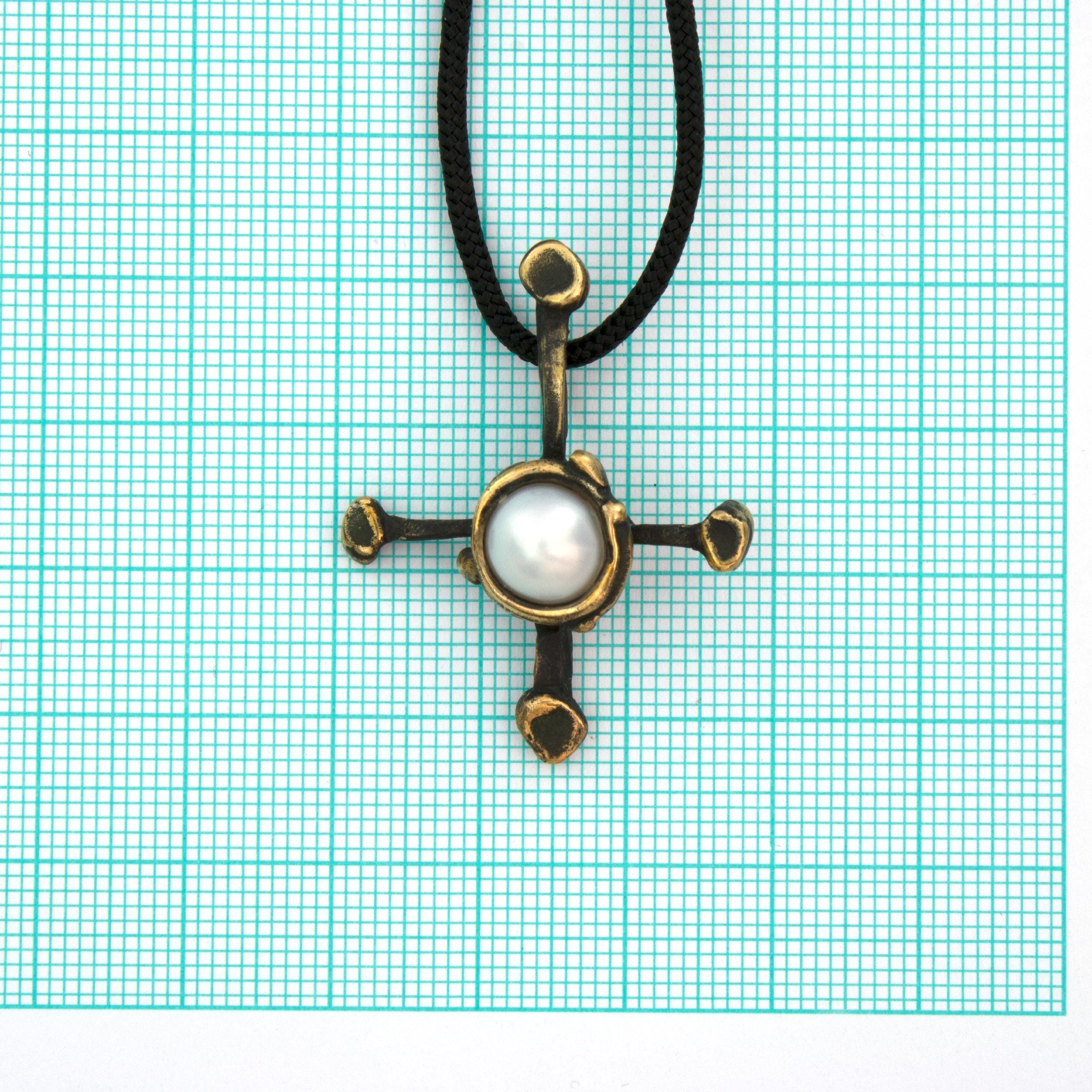 The "Light Small Cross" pendant by Vojtěška Vlčková (1948-2023) is a valuable collector's piece that combines patinated bronze with a delicate pearl. This exceptional work represents the perfect union of sculptural sensibility and jewelry craftsmanship. Crafted using the lost wax casting technique, it bears the stamp of exceptional artistic handwriting and serves as a meaningful addition to any collection.