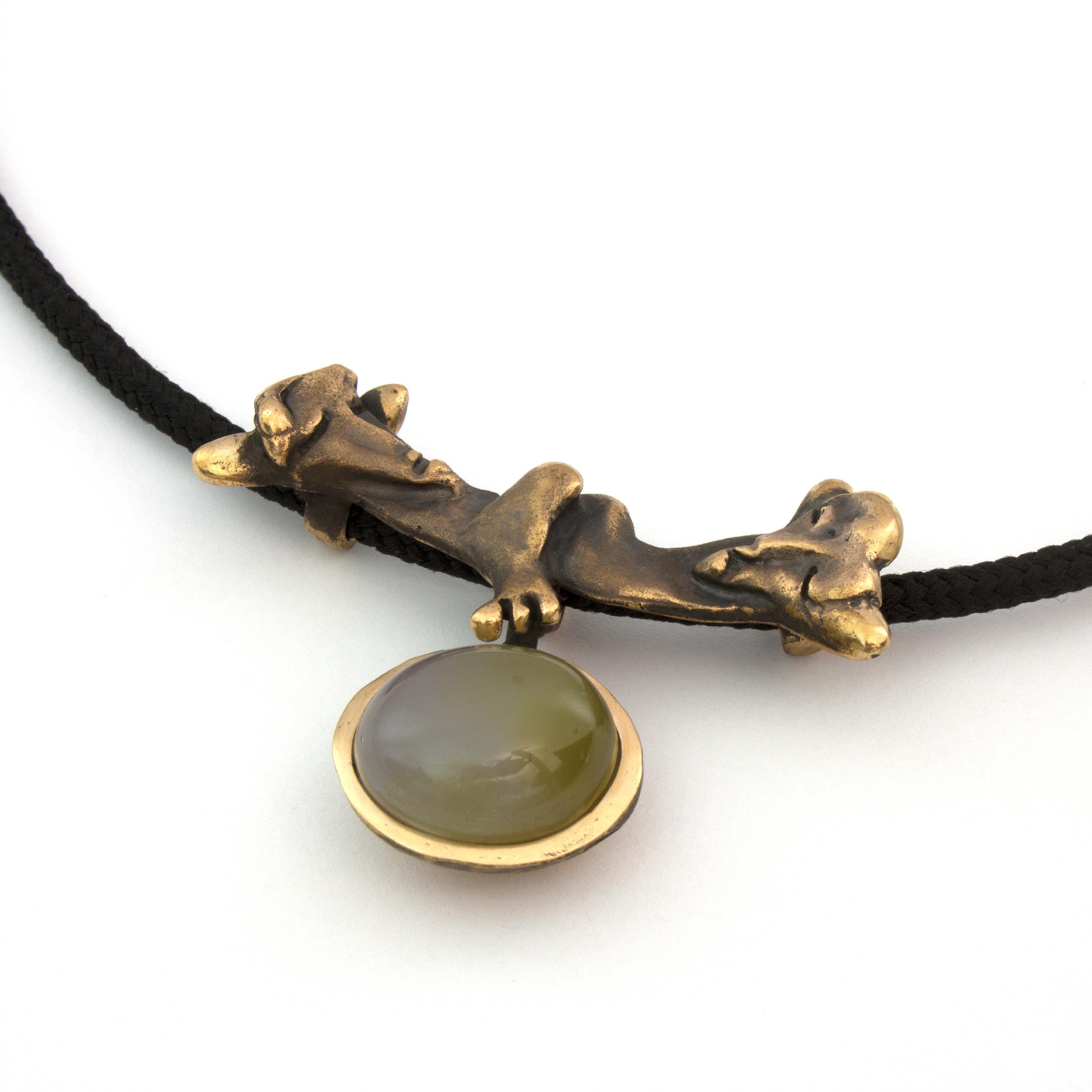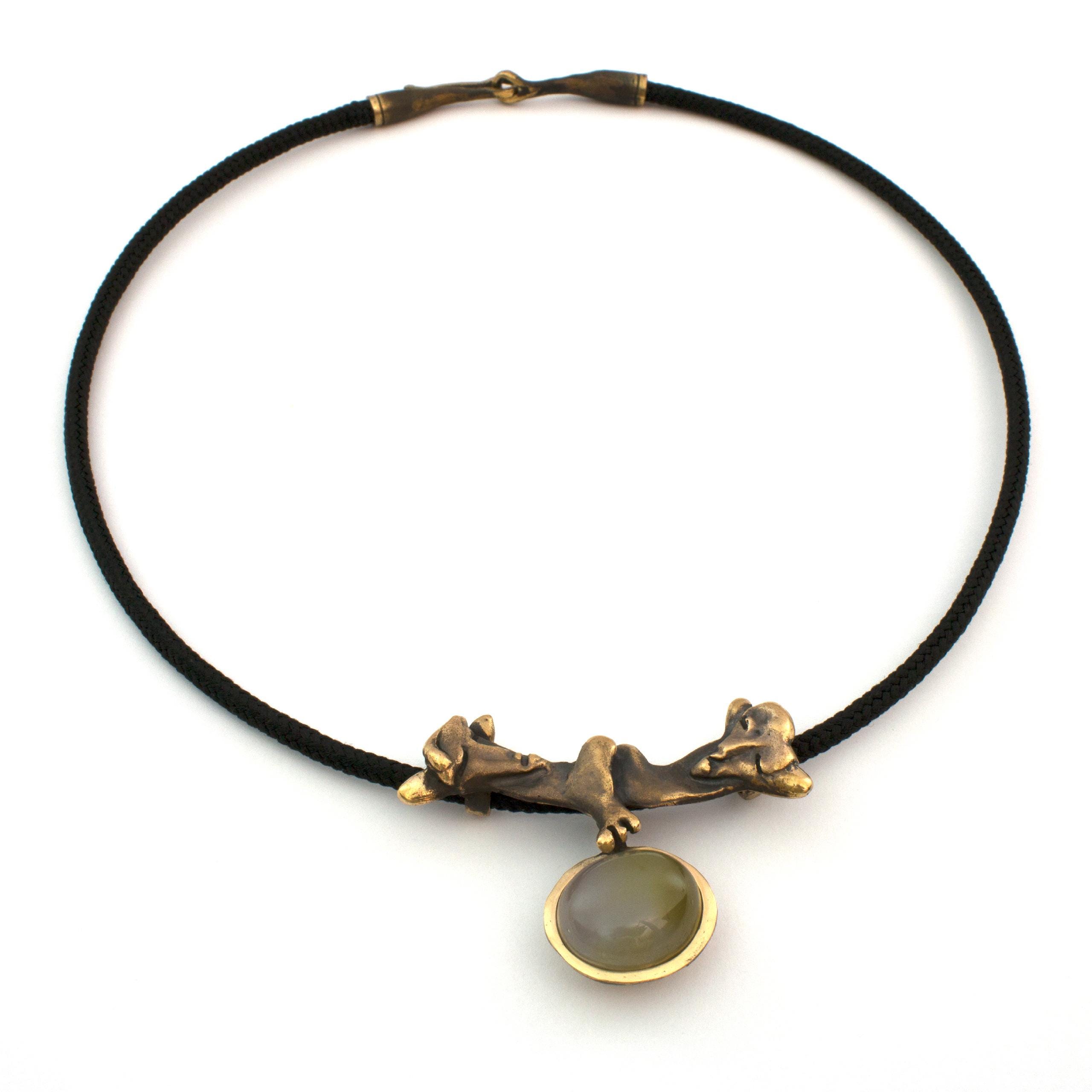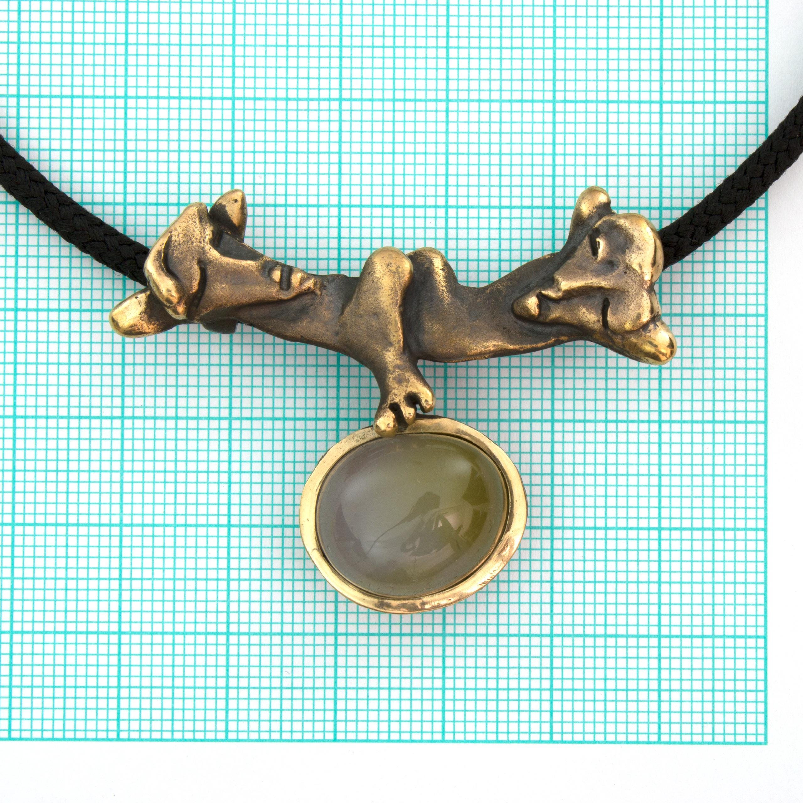 The "Knights of Blaník" necklace by Vojtěška Vlčková (1948-2023) is an authorial jewel that combines patinated bronze with natural agate. This unique piece represents the perfect union of sculptural sensibility and jewelry craftsmanship. The work, crafted using the lost wax casting technique, bears the stamp of exceptional artistic handwriting.
