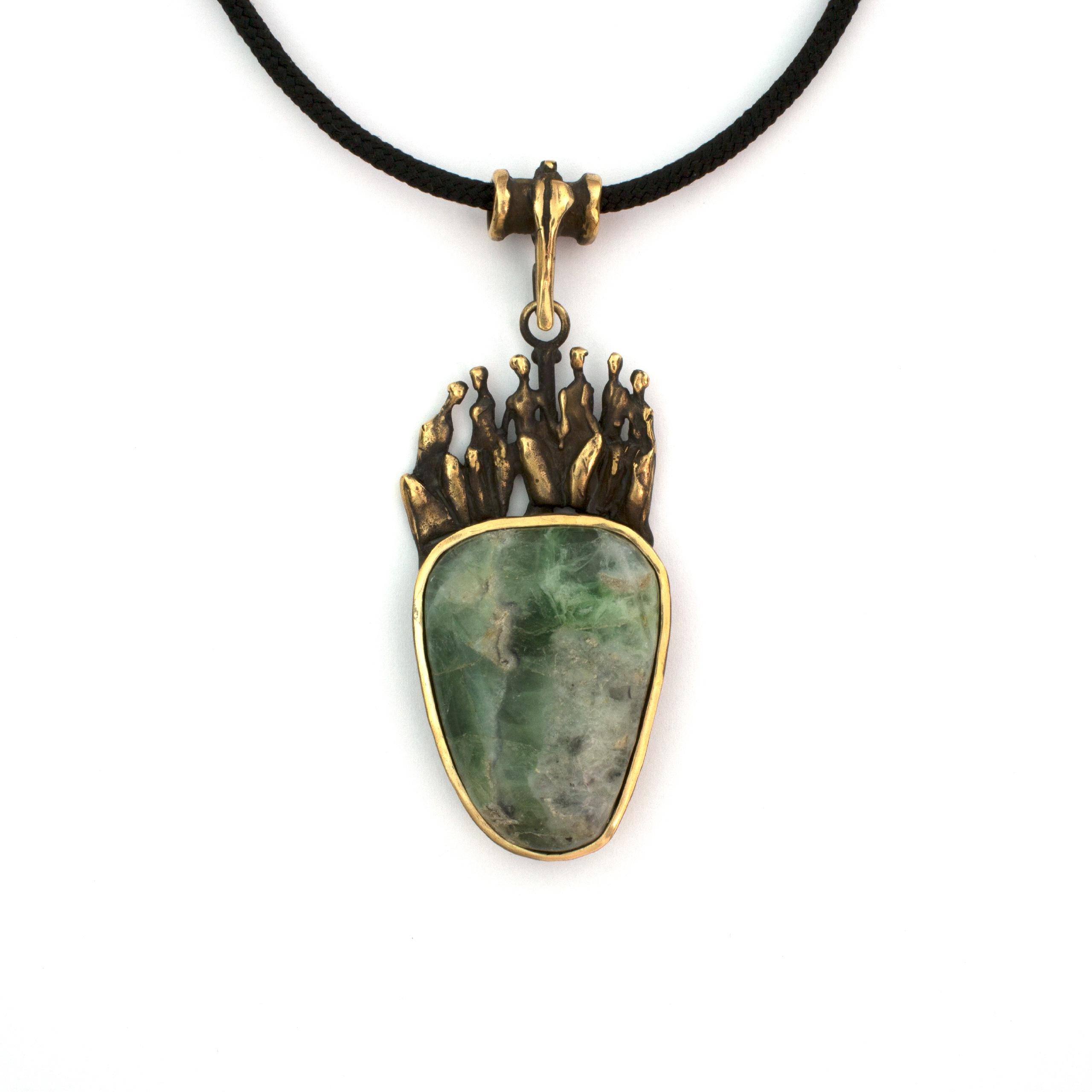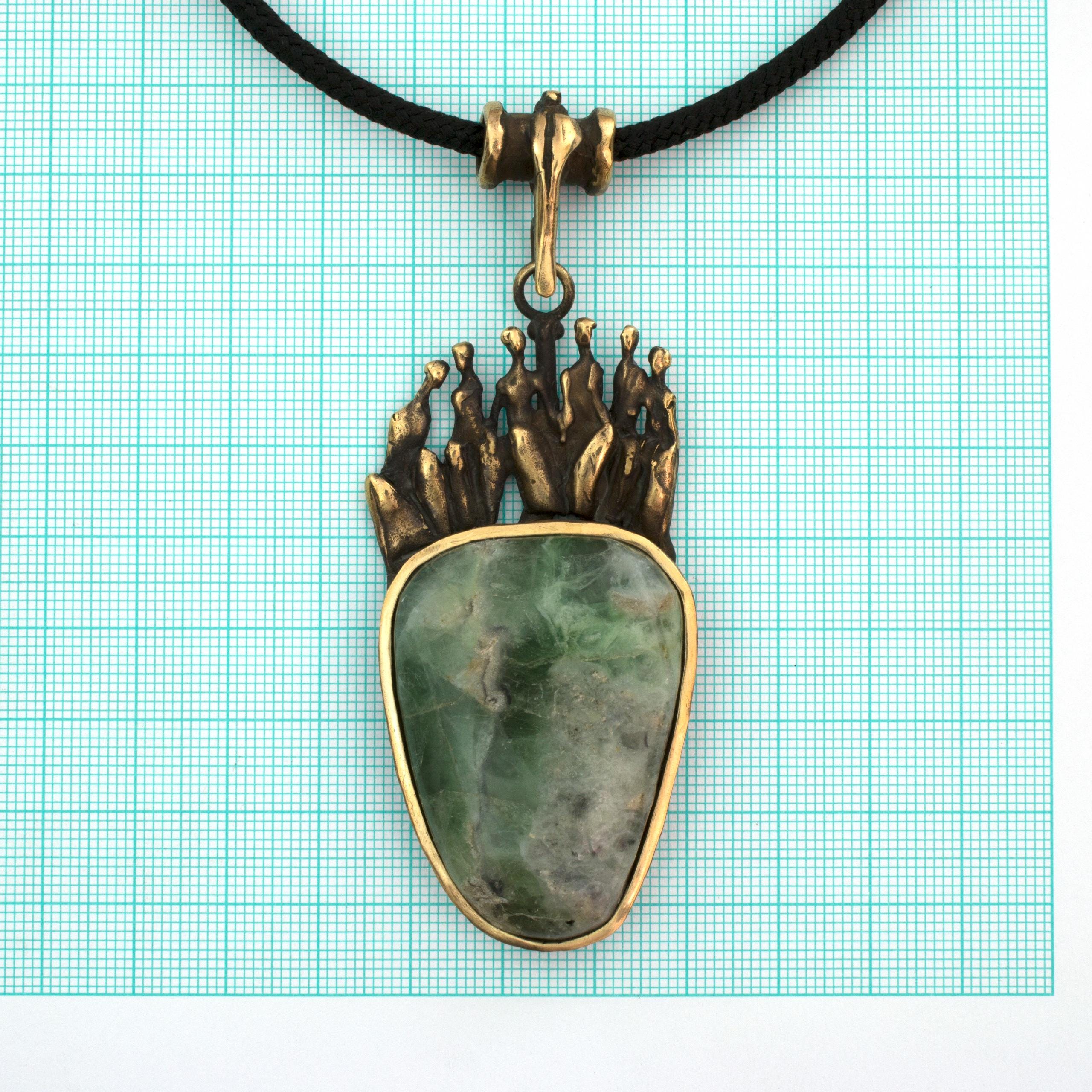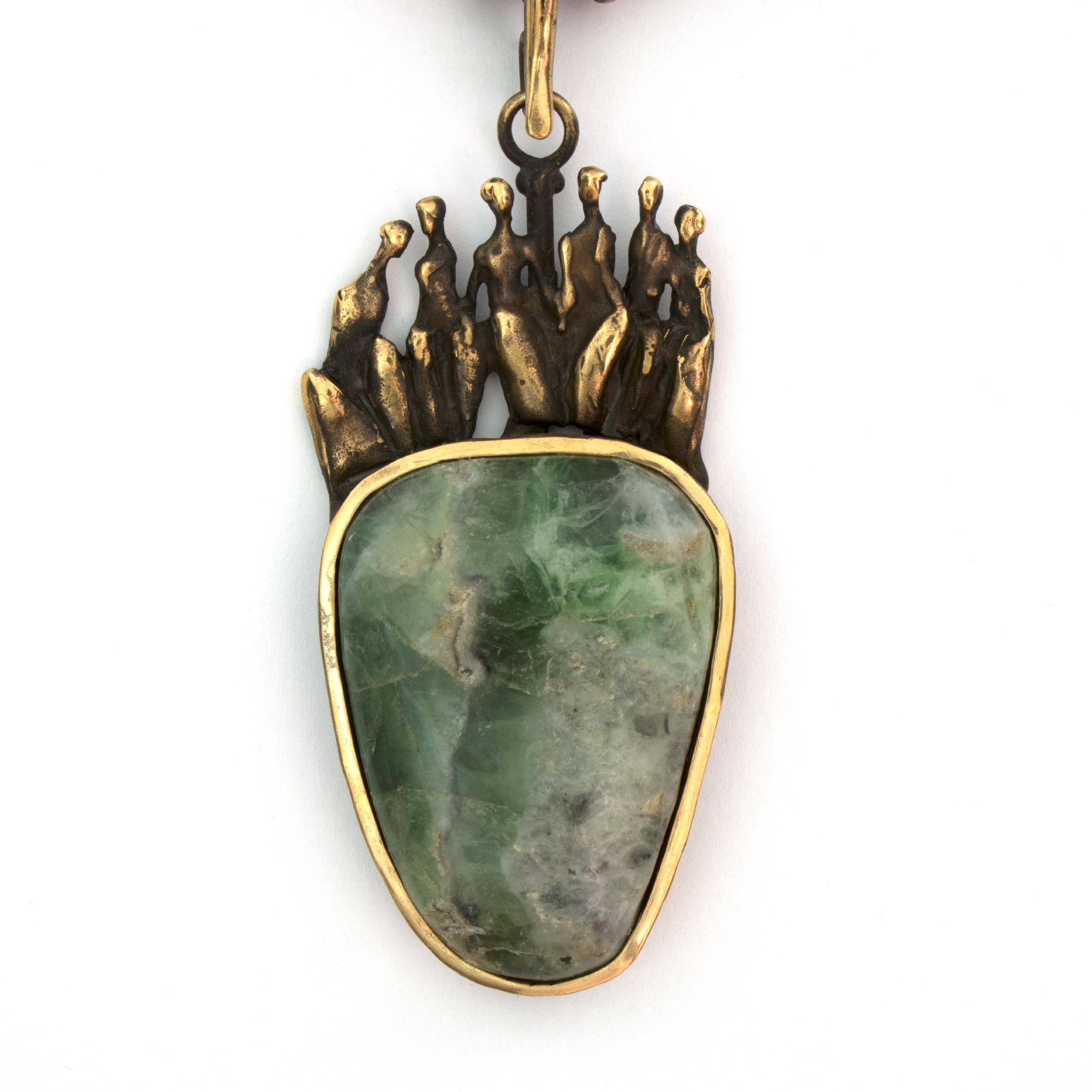 The "Little Greta" necklace by Vojtěška Vlčková (1948-2023) is an authorial jewel that combines patinated bronze with natural fluorite. This unique piece represents the perfect union of sculptural sensibility and jewelry craftsmanship. The work, crafted using the lost wax casting technique, bears the stamp of exceptional artistic handwriting.