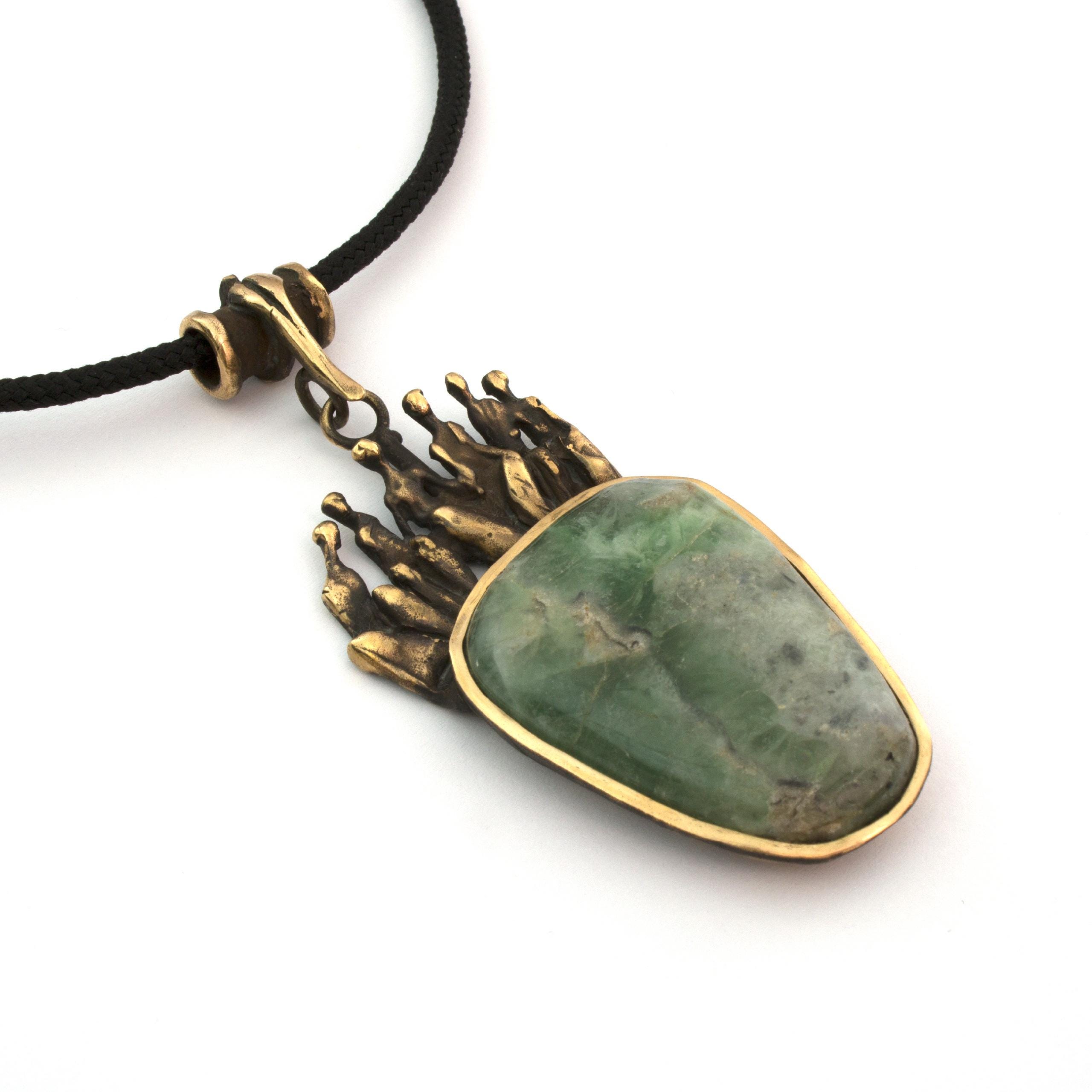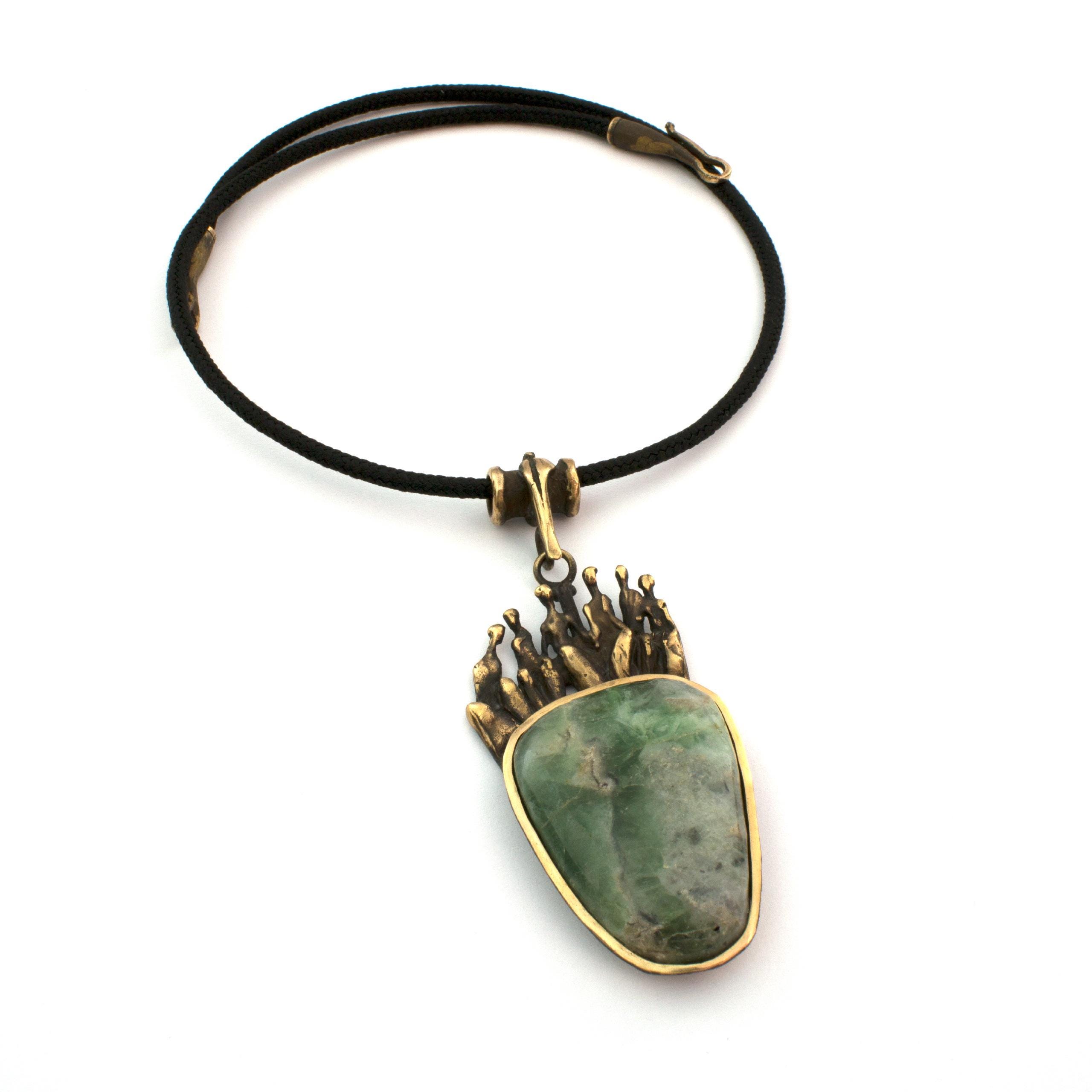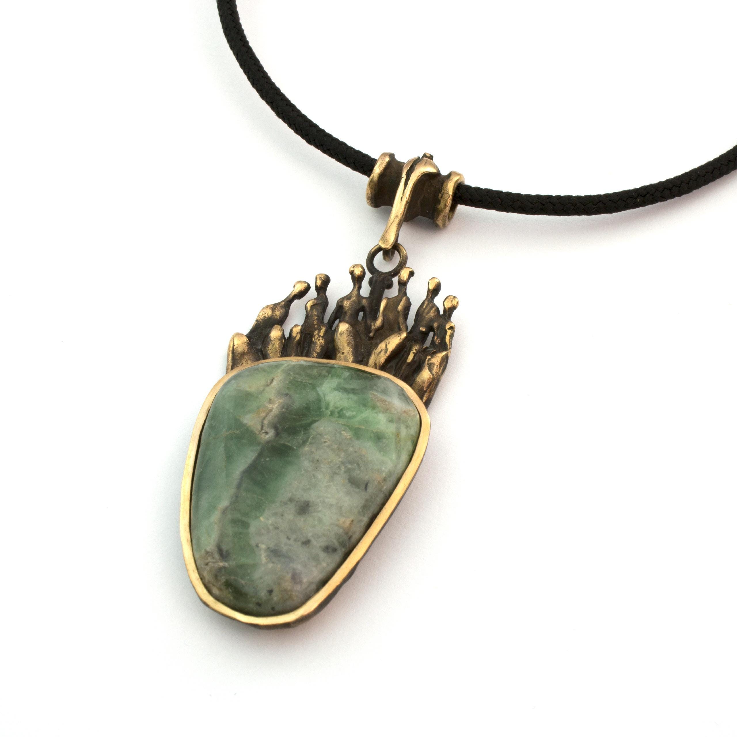 The "Little Greta" necklace by Vojtěška Vlčková (1948-2023) is an authorial jewel that combines patinated bronze with natural fluorite. This unique piece represents the perfect union of sculptural sensibility and jewelry craftsmanship. The work, crafted using the lost wax casting technique, bears the stamp of exceptional artistic handwriting.