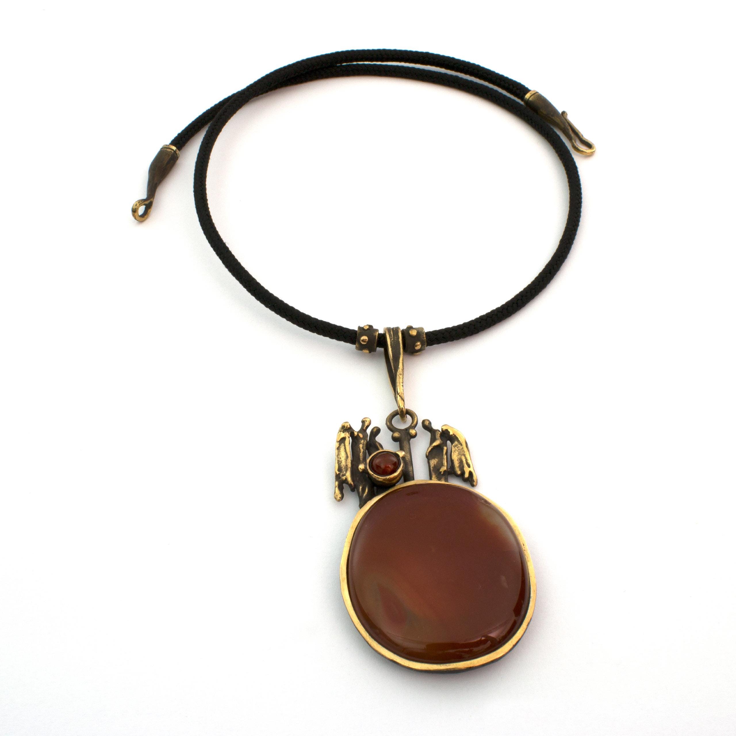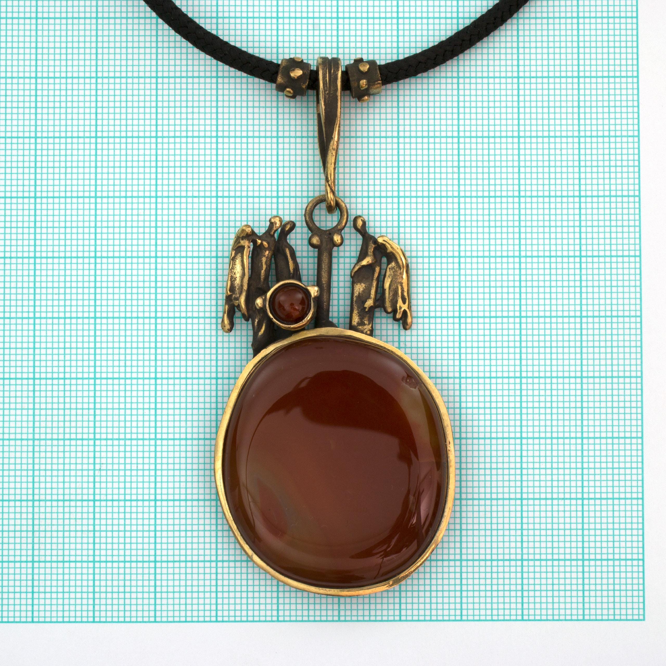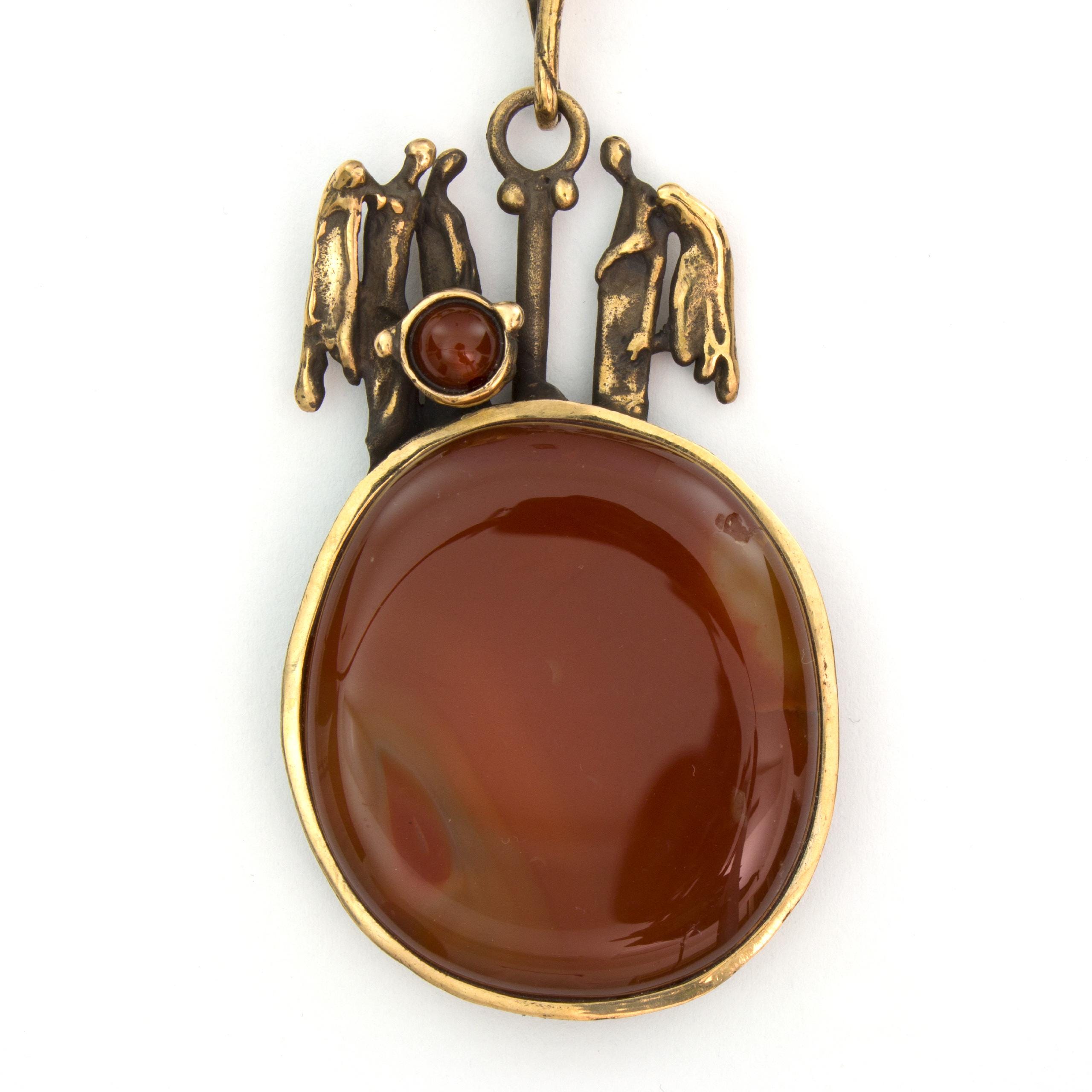 The "Secret" necklace by Vojtěška Vlčková (1948-2023) is an authorial jewel that, through sculptural form, tells a story of hidden meanings. The combination of patinated bronze with carnelian creates a work where the substance of metal meets the depth of natural stone. This unique piece represents the perfect union of craft precision and artistic depth.